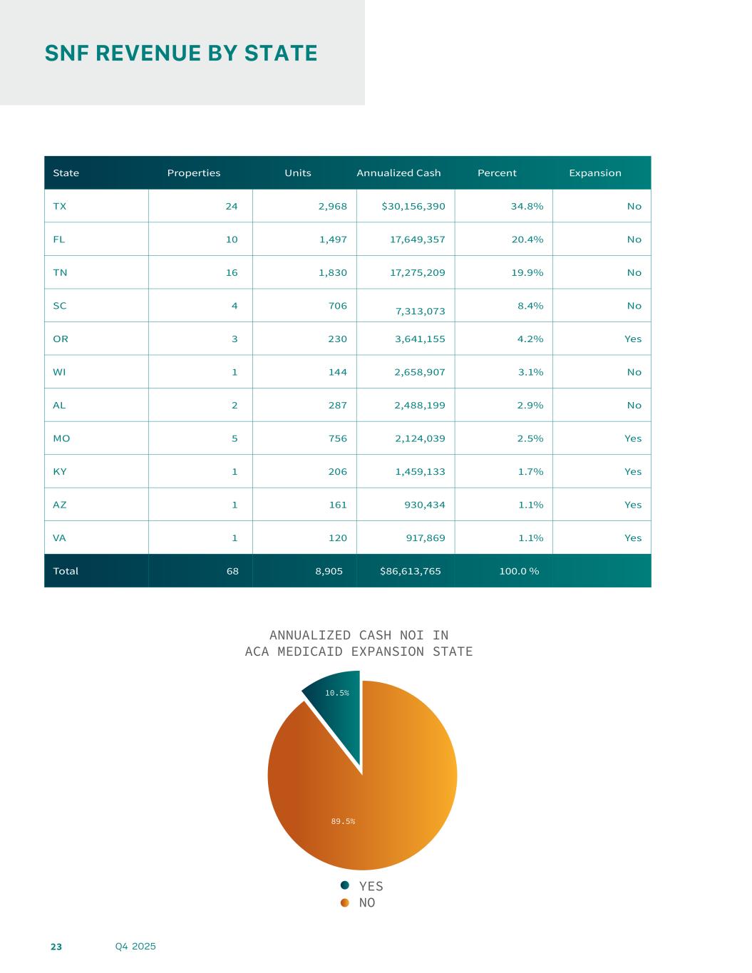 23 Q4 2025 SNF REVENUE BY STATE žŽ Š —š ¡ „ †ƒ ‚… €† … …„ˆƒ • „‡ ‡ †„ …€‡ ˆ„ † ƒ… ‡ ‡€ ˆ ž „ ‡† ‡ …… ‡… ƒˆ„ … … … †„ €€ „ˆ – › „„ †€ƒ ‡ …ˆ ƒ‡ „ƒƒ ˆ Œ € ‡€† „ … ˆ€ – œ– † „€ …… ˆ‡ – µ † … „…„ ˆ – ™ ‡ ƒ† ˆ – †ƒ ƒ € ‚ƒ† †… ‡†€ ˆ ANNUALIZED CASH NOI IN ACA MEDICAID EXPANSION STATE YES NO Lease Notes unsecured, v 10.5% 89.5%