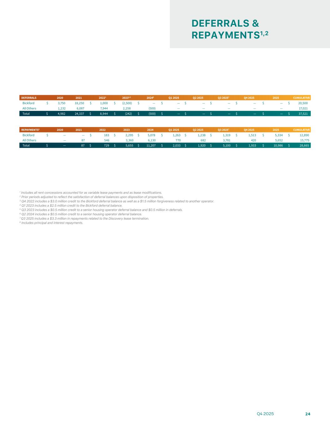 24Q4 2025 1 Includes all rent concessions accounted for as variable lease payments and as lease modifications. 2 Prior periods adjusted to reflect the satisfaction of deferral balances upon disposition of properties. 3 Q4 2022 includes a $3.0 million credit to the Bickford deferral balance as well as a $1.5 million forgiveness related to another operator. 4 Q1 2023 includes a $2.5 million credit to the Bickford deferral balance. 5 Q3 2023 includes a $0.5 million credit to a senior housing operator deferral balance and $0.5 million in deferrals. 6 Q2 2024 includes a $0.5 million credit to a senior housing operator deferral balance. 7 Q3 2025 includes a $3.3 million in repayments related to the Discovery lease termination. 8 Includes principal and interest repayments. DEFERRALS & REPAYMENTS1,2 ‰ ’“’’ ’“’”•–— ’“’•˜ ™’“’— ’’“’— ”’“’—š •’“’— ’“’— Ž› ¢Š‰ ‚ … ‡€ ƒ € ‚ ‚ € ‚ ¨ ‚ ¨ ‚ ¨ ‚ ¨ ‚ ¨ ‚ ¨ ‚ € Ž … † ƒ‡ ‡ „„ €ƒ € ¨ ¨ ¨ ¨ ¨ ‡ ‚ „ ƒ „ ……‡ ‚ ƒ „„ ‚ „ ‚ € ‚ ¨ ‚ ¨ ‚ ¨ ‚ ¨ ‚ ¨ ‚ …‡ € Ž ’“’’ ’“’” ’“’• ™’“’— ’’“’— ”’“’—š •’“’— ’“’— Ž› ¢Š‰ ‚ ¨ ¨ ‚ ƒ… ‚ € ‚ € ‡ƒ ‚ †… ‚ …ƒ ‚ … ‚ €… ‚ € ……„ ‚ ƒ Ž ¨ ƒ‡ €„† … …† † … ‡‡ †ƒ … ‡ƒ „ € †€ € ‡‡€ ‚ ¨ ƒ‡ ‚ ‡ ‚ € †€€ ‚ ‡ ‚ …… ‚ ‚ € ‚ …… ‚ ƒ† ‚ ƒ ††€