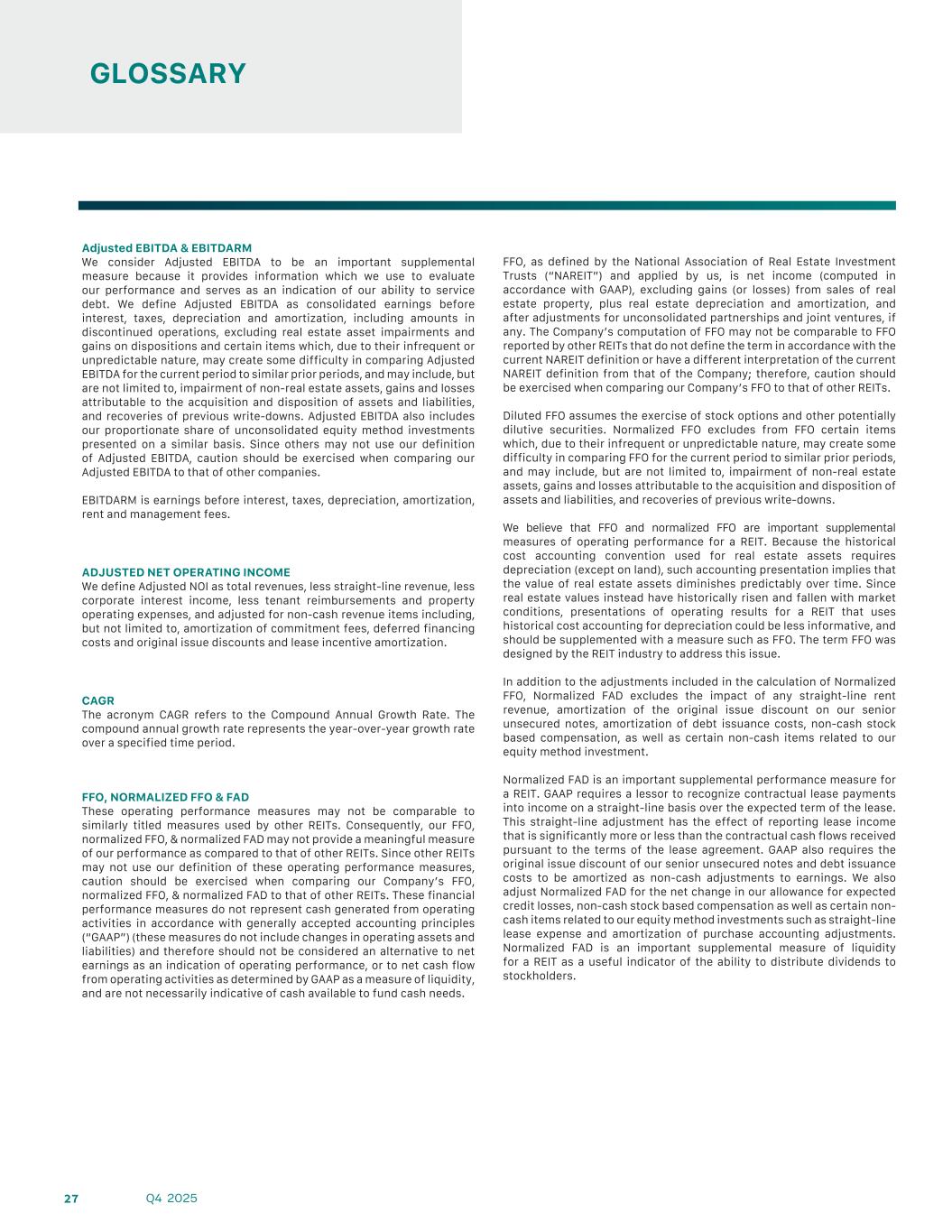 27 Q4 2025 GLOSSARY Adjusted EBITDA & EBITDARM We consider Adjusted EBITDA to be an important supplemental measure because it provides information which we use to evaluate our performance and serves as an indication of our ability to service debt. We defi ne Adjusted EBITDA as consolidated earnings before interest, taxes, depreciation and amortization, including amounts in discontinued operations, excluding real estate asset impairments and gains on dispositions and certain items which, due to their infrequent or unpredictable nature, may create some diffi culty in comparing Adjusted EBITDA for the current period to similar prior periods, and may include, but are not limited to, impairment of non-real estate assets, gains and losses attributable to the acquisition and disposition of assets and liabilities, and recoveries of previous write-downs. Adjusted EBITDA also includes our proportionate share of unconsolidated equity method investments presented on a similar basis. Since others may not use our defi nition of Adjusted EBITDA, caution should be exercised when comparing our Adjusted EBITDA to that of other companies. EBITDARM is earnings before interest, taxes, depreciation, amortization, rent and management fees. ADJUSTED NET OPERATING INCOME We defi ne Adjusted NOI as total revenues, less straight-line revenue, less corporate interest income, less tenant reimbursements and property operating expenses, and adjusted for non-cash revenue items including, but not limited to, amortization of commitment fees, deferred fi nancing costs and original issue discounts and lease incentive amortization. CAGR The acronym CAGR refers to the Compound Annual Growth Rate. The compound annual growth rate represents the year-over-year growth rate over a specifi ed time period. FFO, NORMALIZED FFO & FAD These operating performance measures may not be comparable to similarly titled measures used by other REITs. Consequently, our FFO, normalized FFO, & normalized FAD may not provide a meaningful measure of our performance as compared to that of other REITs. Since other REITs may not use our defi nition of these operating performance measures, caution should be exercised when comparing our Company’s FFO, normalized FFO, & normalized FAD to that of other REITs. These fi nancial performance measures do not represent cash generated from operating activities in accordance with generally accepted accounting principles (“GAAP”) (these measures do not include changes in operating assets and liabilities) and therefore should not be considered an alternative to net earnings as an indication of operating performance, or to net cash fl ow from operating activities as determined by GAAP as a measure of liquidity, and are not necessarily indicative of cash available to fund cash needs. FFO, as defi ned by the National Association of Real Estate Investment Trusts (“NAREIT”) and applied by us, is net income (computed in accordance with GAAP), excluding gains (or losses) from sales of real estate property, plus real estate depreciation and amortization, and after adjustments for unconsolidated partnerships and joint ventures, if any. The Company’s computation of FFO may not be comparable to FFO reported by other REITs that do not defi ne the term in accordance with the current NAREIT defi nition or have a different interpretation of the current NAREIT defi nition from that of the Company; therefore, caution should be exercised when comparing our Company’s FFO to that of other REITs. Diluted FFO assumes the exercise of stock options and other potentially dilutive securities. Normalized FFO excludes from FFO certain items which, due to their infrequent or unpredictable nature, may create some diffi culty in comparing FFO for the current period to similar prior periods, and may include, but are not limited to, impairment of non-real estate assets, gains and losses attributable to the acquisition and disposition of assets and liabilities, and recoveries of previous write-downs. We believe that FFO and normalized FFO are important supplemental measures of operating performance for a REIT. Because the historical cost accounting convention used for real estate assets requires depreciation (except on land), such accounting presentation implies that the value of real estate assets diminishes predictably over time. Since real estate values instead have historically risen and fallen with market conditions, presentations of operating results for a REIT that uses historical cost accounting for depreciation could be less informative, and should be supplemented with a measure such as FFO. The term FFO was designed by the REIT industry to address this issue. In addition to the adjustments included in the calculation of Normalized FFO, Normalized FAD excludes the impact of any straight-line rent revenue, amortization of the original issue discount on our senior unsecured notes, amortization of debt issuance costs, non-cash stock based compensation, as well as certain non-cash items related to our equity method investment. Normalized FAD is an important supplemental performance measure for a REIT. GAAP requires a lessor to recognize contractual lease payments into income on a straight-line basis over the expected term of the lease. This straight-line adjustment has the effect of reporting lease income that is signifi cantly more or less than the contractual cash fl ows received pursuant to the terms of the lease agreement. GAAP also requires the original issue discount of our senior unsecured notes and debt issuance costs to be amortized as non-cash adjustments to earnings. We also adjust Normalized FAD for the net change in our allowance for expected credit losses, non-cash stock based compensation as well as certain non- cash items related to our equity method investments such as straight-line lease expense and amortization of purchase accounting adjustments. Normalized FAD is an important supplemental measure of liquidity 