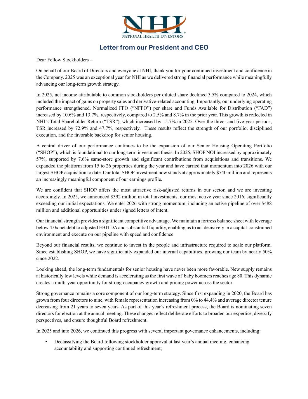 Letter from our President and CEO Dear Fellow Stockholders – On behalf of our Board of Directors and everyone at NHI, thank you for your continued investment and confidence in the Company. 2025 was an exceptional year for NHI as we delivered strong financial performance while meaningfully advancing our long-term growth strategy. In 2025, net income attributable to common stockholders per diluted share declined 3.5% compared to 2024, which included the impact of gains on property sales and derivative-related accounting. Importantly, our underlying operating performance strengthened. Normalized FFO (“NFFO”) per share and Funds Available for Distribution (“FAD”) increased by 10.6% and 13.7%, respectively, compared to 2.5% and 8.7% in the prior year. This growth is reflected in NHI’s Total Shareholder Return (“TSR”), which increased by 15.7% in 2025. Over the three- and five-year periods, TSR increased by 72.9% and 47.7%, respectively. These results reflect the strength of our portfolio, disciplined execution, and the favorable backdrop for senior housing. A central driver of our performance continues to be the expansion of our Senior Housing Operating Portfolio (“SHOP”), which is foundational to our long-term investment thesis. In 2025, SHOP NOI increased by approximately 57%, supported by 7.6% same-store growth and significant contributions from acquisitions and transitions. We expanded the platform from 15 to 26 properties during the year and have carried that momentum into 2026 with our largest SHOP acquisition to date. Our total SHOP investment now stands at approximately $740 million and represents an increasingly meaningful component of our earnings profile. We are confident that SHOP offers the most attractive risk-adjusted returns in our sector, and we are investing accordingly. In 2025, we announced $392 million in total investments, our most active year since 2016, significantly exceeding our initial expectations. We enter 2026 with strong momentum, including an active pipeline of over $488 million and additional opportunities under signed letters of intent. Our financial strength provides a significant competitive advantage. We maintain a fortress balance sheet with leverage below 4.0x net debt to adjusted EBITDA and substantial liquidity, enabling us to act decisively in a capital-constrained environment and execute on our pipeline with speed and confidence. Beyond our financial results, we continue to invest in the people and infrastructure required to scale our platform. Since establishing SHOP, we have significantly expanded our internal capabilities, growing our team by nearly 50% since 2022. Looking ahead, the long-term fundamentals for senior housing have never been more favorable. New supply remains at historically low levels while demand is accelerating as the first wave of baby boomers reaches age 80. This dynamic creates a multi-year opportunity for strong occupancy growth and pricing power across the sector Strong governance remains a core component of our long-term strategy. Since first expanding in 2020, the Board has grown from four directors to nine, with female representation increasing from 0% to 44.4% and average director tenure decreasing from 21 years to seven years. As part of this year’s refreshment process, the Board is nominating seven directors for election at the annual meeting. These changes reflect deliberate efforts to broaden our expertise, diversify perspectives, and ensure thoughtful Board refreshment. In 2025 and into 2026, we continued this progress with several important governance enhancements, including: • Declassifying the Board following stockholder approval at last year’s annual meeting, enhancing accountability and supporting continued refreshment;