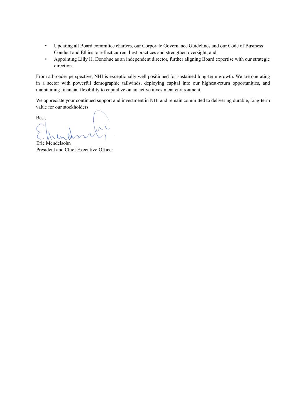 • Updating all Board committee charters, our Corporate Governance Guidelines and our Code of Business Conduct and Ethics to reflect current best practices and strengthen oversight; and • Appointing Lilly H. Donohue as an independent director, further aligning Board expertise with our strategic direction. From a broader perspective, NHI is exceptionally well positioned for sustained long-term growth. We are operating in a sector with powerful demographic tailwinds, deploying capital into our highest-return opportunities, and maintaining financial flexibility to capitalize on an active investment environment. We appreciate your continued support and investment in NHI and remain committed to delivering durable, long-term value for our stockholders. Best, Eric Mendelsohn President and Chief Executive Officer
