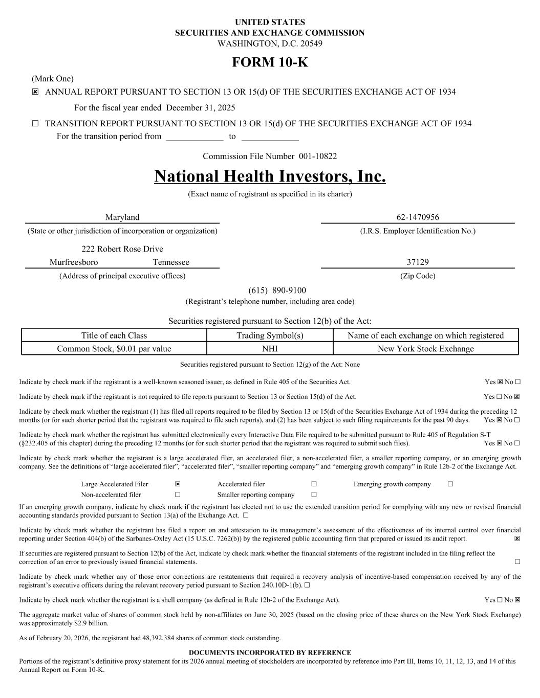 UNITED STATES SECURITIES AND EXCHANGE COMMISSION WASHINGTON, D.C. 20549 FORM 10-K (Mark One) ☒ ANNUAL REPORT PURSUANT TO SECTION 13 OR 15(d) OF THE SECURITIES EXCHANGE ACT OF 1934 For the fiscal year ended December 31, 2025 ☐ TRANSITION REPORT PURSUANT TO SECTION 13 OR 15(d) OF THE SECURITIES EXCHANGE ACT OF 1934 For the transition period from _____________ to _____________ Commission File Number 001-10822 National Health Investors, Inc. (Exact name of registrant as specified in its charter) Maryland 62-1470956 (State or other jurisdiction of incorporation or organization) (I.R.S. Employer Identification No.) 222 Robert Rose Drive Murfreesboro Tennessee 37129 (Address of principal executive offices) (Zip Code) (615) 890-9100 (Registrant’s telephone number, including area code) Securities registered pursuant to Section 12(b) of the Act: Title of each Class Trading Symbol(s) Name of each exchange on which registered Common Stock, $0.01 par value NHI New York Stock Exchange Securities registered pursuant to Section 12(g) of the Act: None Indicate by check mark if the registrant is a well-known seasoned issuer, as defined in Rule 405 of the Securities Act. Yes ☒ No ☐ Indicate by check mark if the registrant is not required to file reports pursuant to Section 13 or Section 15(d) of the Act. Yes ☐ No ☒ Indicate by check mark whether the registrant (1) has filed all reports required to be filed by Section 13 or 15(d) of the Securities Exchange Act of 1934 during the preceding 12 months (or for such shorter period that the registrant was required to file such reports), and (2) has been subject to such filing requirements for the past 90 days. Yes ☒ No ☐ Indicate by check mark whether the registrant has submitted electronically every Interactive Data File required to be submitted pursuant to Rule 405 of Regulation S-T (§232.405 of this chapter) during the preceding 12 months (or for such shorter period that the registrant was required to submit such files). Yes ☒ No ☐ Indicate by check mark whether the registrant is a large accelerated filer, an accelerated filer, a non-accelerated filer, a smaller reporting company, or an emerging growth company. See the definitions of “large accelerated filer”, “accelerated filer”, “smaller reporting company” and “emerging growth company” in Rule 12b-2 of the Exchange Act. Large Accelerated Filer ☒ Accelerated filer ☐ Emerging growth company ☐ Non-accelerated filer ☐ Smaller reporting company ☐ If an emerging growth company, indicate by check mark if the registrant has elected not to use the extended transition period for complying with any new or revised financial accounting standards provided pursuant to Section 13(a) of the Exchange Act. ☐ Indicate by check mark whether the registrant has filed a report on and attestation to its management’s assessment of the effectiveness of its internal control over financial reporting under Section 404(b) of the Sarbanes-Oxley Act (15 U.S.C. 7262(b)) by the registered public accounting firm that prepared or issued its audit report. ☒ If securities are registered pursuant to Section 12(b) of the Act, indicate by check mark whether the financial statements of the registrant included in the filing reflect the correction of an error to previously issued financial statements. ☐ Indicate by check mark whether any of those error corrections are restatements that required a recovery analysis of incentive-based compensation received by any of the registrant’s executive officers during the relevant recovery period pursuant to Section 240.10D-1(b). ☐ Indicate by check mark whether the registrant is a shell company (as defined in Rule 12b-2 of the Exchange Act). Yes ☐ No ☒ The aggregate market value of shares of common stock held by non-affiliates on June 30, 2025 (based on the closing price of these shares on the New York Stock Exchange) was approximately $2.9 billion. As of February 20, 2026, the registrant had 48,392,384 shares of common stock outstanding. DOCUMENTS INCORPORATED BY REFERENCE Portions of the registrant’s definitive proxy statement for its 2026 annual meeting of stockholders are incorporated by reference into Part III, Items 10, 11, 12, 13, and 14 of this Annual Report on Form 10-K.