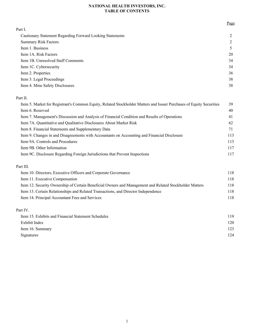 Page Part I. Cautionary Statement Regarding Forward Looking Statements 2 Summary Risk Factors 2 Item 1. Business 5 Item 1A. Risk Factors 20 Item 1B. Unresolved Staff Comments 34 Item 1C. Cybersecurity 34 Item 2. Properties 36 Item 3. Legal Proceedings 38 Item 4. Mine Safety Disclosures 38 Part II. Item 5. Market for Registrant's Common Equity, Related Stockholder Matters and Issuer Purchases of Equity Securities 39 Item 6. Reserved 40 Item 7. Management's Discussion and Analysis of Financial Condition and Results of Operations 41 Item 7A. Quantitative and Qualitative Disclosures About Market Risk 62 Item 8. Financial Statements and Supplementary Data 71 Item 9. Changes in and Disagreements with Accountants on Accounting and Financial Disclosure 113 Item 9A. Controls and Procedures 113 Item 9B. Other Information 117 Item 9C. Disclosure Regarding Foreign Jurisdictions that Prevent Inspections 117 Part III. Item 10. Directors, Executive Officers and Corporate Governance 118 Item 11. Executive Compensation 118 Item 12. Security Ownership of Certain Beneficial Owners and Management and Related Stockholder Matters 118 Item 13. Certain Relationships and Related Transactions, and Director Independence 118 Item 14. Principal Accountant Fees and Services 118 Part IV. Item 15. Exhibits and Financial Statement Schedules 119 Exhibit Index 120 Item 16. Summary 123 Signatures 124 NATIONAL HEALTH INVESTORS, INC. TABLE OF CONTENTS 1
