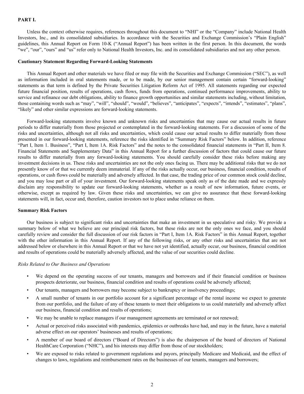 • We depend on the operating success of our tenants, managers and borrowers and if their financial condition or business prospects deteriorate, our business, financial condition and results of operations could be adversely affected; • Our tenants, managers and borrowers may become subject to bankruptcy or insolvency proceedings; • A small number of tenants in our portfolio account for a significant percentage of the rental income we expect to generate from our portfolio, and the failure of any of these tenants to meet their obligations to us could materially and adversely affect our business, financial condition and results of operations; • We may be unable to replace managers if our management agreements are terminated or not renewed; • Actual or perceived risks associated with pandemics, epidemics or outbreaks have had, and may in the future, have a material adverse effect on our operators’ businesses and results of operations; • A member of our board of directors (“Board of Directors”) is also the chairperson of the board of directors of National HealthCare Corporation (“NHC”), and his interests may differ from those of our stockholders; • We are exposed to risks related to government regulations and payors, principally Medicare and Medicaid, and the effect of changes to laws, regulations and reimbursement rates on the businesses of our tenants, managers and borrowers; PART I. Unless the context otherwise requires, references throughout this document to “NHI” or the “Company” include National Health Investors, Inc., and its consolidated subsidiaries. In accordance with the Securities and Exchange Commission’s “Plain English” guidelines, this Annual Report on Form 10-K (“Annual Report”) has been written in the first person. In this document, the words “we”, “our”, “ours” and “us” refer only to National Health Investors, Inc. and its consolidated subsidiaries and not any other person. Cautionary Statement Regarding Forward-Looking Statements This Annual Report and other materials we have filed or may file with the Securities and Exchange Commission (“SEC”), as well as information included in oral statements made, or to be made, by our senior management contain certain “forward-looking” statements as that term is defined by the Private Securities Litigation Reform Act of 1995. All statements regarding our expected future financial position, results of operations, cash flows, funds from operations, continued performance improvements, ability to service and refinance our debt obligations, ability to finance growth opportunities and similar statements including, without limitation, those containing words such as “may”, “will”, “should”, “would”, “believes”, “anticipates”, “expects”, “intends”, “estimates”, “plans”, “likely” and other similar expressions are forward-looking statements. Forward-looking statements involve known and unknown risks and uncertainties that may cause our actual results in future periods to differ materially from those projected or contemplated in the forward-looking statements. For a discussion of some of the risks and uncertainties, although not all risks and uncertainties, which could cause our actual results to differ materially from those presented in our forward-looking statements, reference the risks identified in “Summary Risk Factors” below. In addition, reference “Part I, Item 1. Business”, “Part I, Item 1A. Risk Factors” and the notes to the consolidated financial statements in “Part II, Item 8. Financial Statements and Supplementary Data” in this Annual Report for a further discussion of factors that could cause our future results to differ materially from any forward-looking statements. You should carefully consider these risks before making any investment decisions in us. These risks and uncertainties are not the only ones facing us. There may be additional risks that we do not presently know of or that we currently deem immaterial. If any of the risks actually occur, our business, financial condition, results of operations, or cash flows could be materially and adversely affected. In that case, the trading price of our common stock could decline, and you may lose part or all of your investment. Our forward-looking statements speak only as of the date made and we expressly disclaim any responsibility to update our forward-looking statements, whether as a result of new information, future events, or otherwise, except as required by law. Given these risks and uncertainties, we can give no assurance that these forward-looking statements will, in fact, occur and, therefore, caution investors not to place undue reliance on them. Summary Risk Factors Our business is subject to significant risks and uncertainties that make an investment in us speculative and risky. We provide a summary below of what we believe are our principal risk factors, but these risks are not the only ones we face, and you should carefully review and consider the full discussion of our risk factors in “Part I, Item 1A. Risk Factors” in this Annual Report, together with the other information in this Annual Report. If any of the following risks, or any other risks and uncertainties that are not addressed below or elsewhere in this Annual Report or that we have not yet identified, actually occur, our business, financial condition and results of operations could be materially adversely affected, and the value of our securities could decline. Risks Related to Our Business and Operations 2