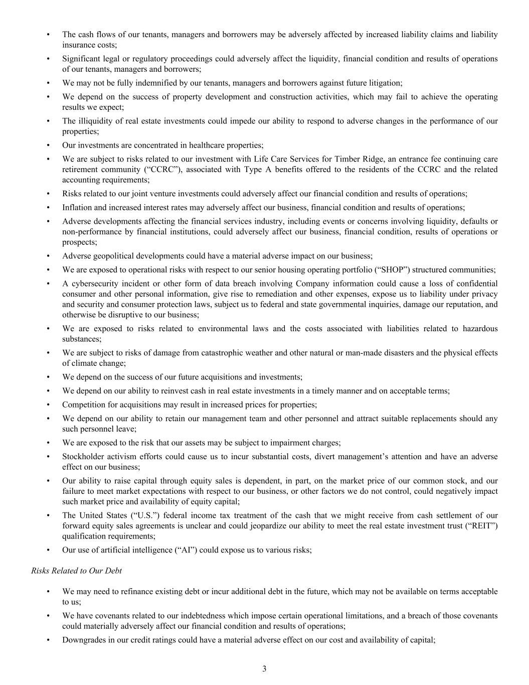 • The cash flows of our tenants, managers and borrowers may be adversely affected by increased liability claims and liability insurance costs; • Significant legal or regulatory proceedings could adversely affect the liquidity, financial condition and results of operations of our tenants, managers and borrowers; • We may not be fully indemnified by our tenants, managers and borrowers against future litigation; • We depend on the success of property development and construction activities, which may fail to achieve the operating results we expect; • The illiquidity of real estate investments could impede our ability to respond to adverse changes in the performance of our properties; • Our investments are concentrated in healthcare properties; • We are subject to risks related to our investment with Life Care Services for Timber Ridge, an entrance fee continuing care retirement community (“CCRC”), associated with Type A benefits offered to the residents of the CCRC and the related accounting requirements; • Risks related to our joint venture investments could adversely affect our financial condition and results of operations; • Inflation and increased interest rates may adversely affect our business, financial condition and results of operations; • Adverse developments affecting the financial services industry, including events or concerns involving liquidity, defaults or non-performance by financial institutions, could adversely affect our business, financial condition, results of operations or prospects; • Adverse geopolitical developments could have a material adverse impact on our business; • We are exposed to operational risks with respect to our senior housing operating portfolio (“SHOP”) structured communities; • A cybersecurity incident or other form of data breach involving Company information could cause a loss of confidential consumer and other personal information, give rise to remediation and other expenses, expose us to liability under privacy and security and consumer protection laws, subject us to federal and state governmental inquiries, damage our reputation, and otherwise be disruptive to our business; • We are exposed to risks related to environmental laws and the costs associated with liabilities related to hazardous substances; • We are subject to risks of damage from catastrophic weather and other natural or man-made disasters and the physical effects of climate change; • We depend on the success of our future acquisitions and investments; • We depend on our ability to reinvest cash in real estate investments in a timely manner and on acceptable terms; • Competition for acquisitions may result in increased prices for properties; • We depend on our ability to retain our management team and other personnel and attract suitable replacements should any such personnel leave; • We are exposed to the risk that our assets may be subject to impairment charges; • Stockholder activism efforts could cause us to incur substantial costs, divert management’s attention and have an adverse effect on our business; • Our ability to raise capital through equity sales is dependent, in part, on the market price of our common stock, and our failure to meet market expectations with respect to our business, or other factors we do not control, could negatively impact such market price and availability of equity capital; • The United States (“U.S.”) federal income tax treatment of the cash that we might receive from cash settlement of our forward equity sales agreements is unclear and could jeopardize our ability to meet the real estate investment trust (“REIT”) qualification requirements; • Our use of artificial intelligence (“AI”) could expose us to various risks; Risks Related to Our Debt • We may need to refinance existing debt or incur additional debt in the future, which may not be available on terms acceptable to us; • We have covenants related to our indebtedness which impose certain operational limitations, and a breach of those covenants could materially adversely affect our financial condition and results of operations; • Downgrades in our credit ratings could have a material adverse effect on our cost and availability of capital; 3