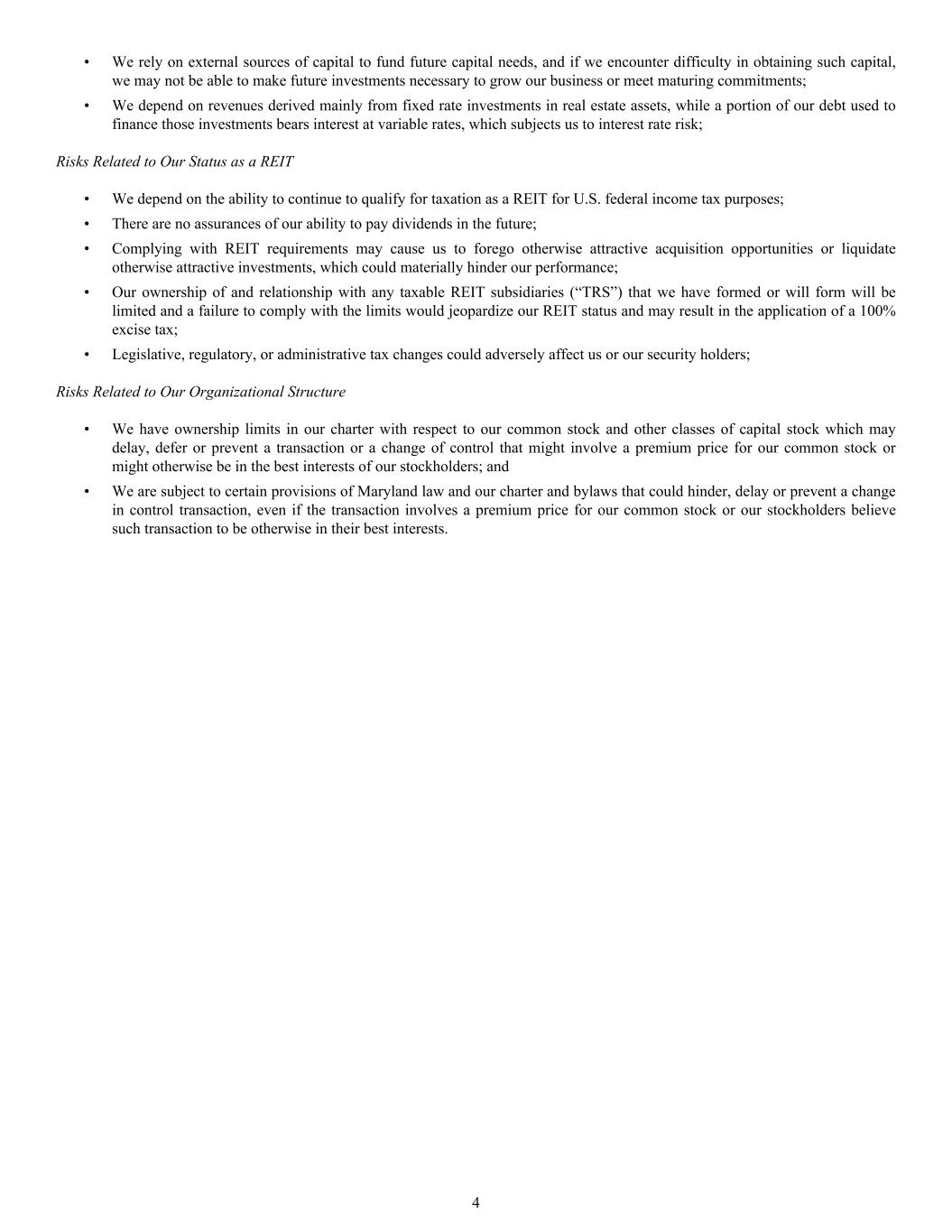 • We rely on external sources of capital to fund future capital needs, and if we encounter difficulty in obtaining such capital, we may not be able to make future investments necessary to grow our business or meet maturing commitments; • We depend on revenues derived mainly from fixed rate investments in real estate assets, while a portion of our debt used to finance those investments bears interest at variable rates, which subjects us to interest rate risk; Risks Related to Our Status as a REIT • We depend on the ability to continue to qualify for taxation as a REIT for U.S. federal income tax purposes; • There are no assurances of our ability to pay dividends in the future; • Complying with REIT requirements may cause us to forego otherwise attractive acquisition opportunities or liquidate otherwise attractive investments, which could materially hinder our performance; • Our ownership of and relationship with any taxable REIT subsidiaries (“TRS”) that we have formed or will form will be limited and a failure to comply with the limits would jeopardize our REIT status and may result in the application of a 100% excise tax; • Legislative, regulatory, or administrative tax changes could adversely affect us or our security holders; Risks Related to Our Organizational Structure • We have ownership limits in our charter with respect to our common stock and other classes of capital stock which may delay, defer or prevent a transaction or a change of control that might involve a premium price for our common stock or might otherwise be in the best interests of our stockholders; and • We are subject to certain provisions of Maryland law and our charter and bylaws that could hinder, delay or prevent a change in control transaction, even if the transaction involves a premium price for our common stock or our stockholders believe such transaction to be otherwise in their best interests. 4