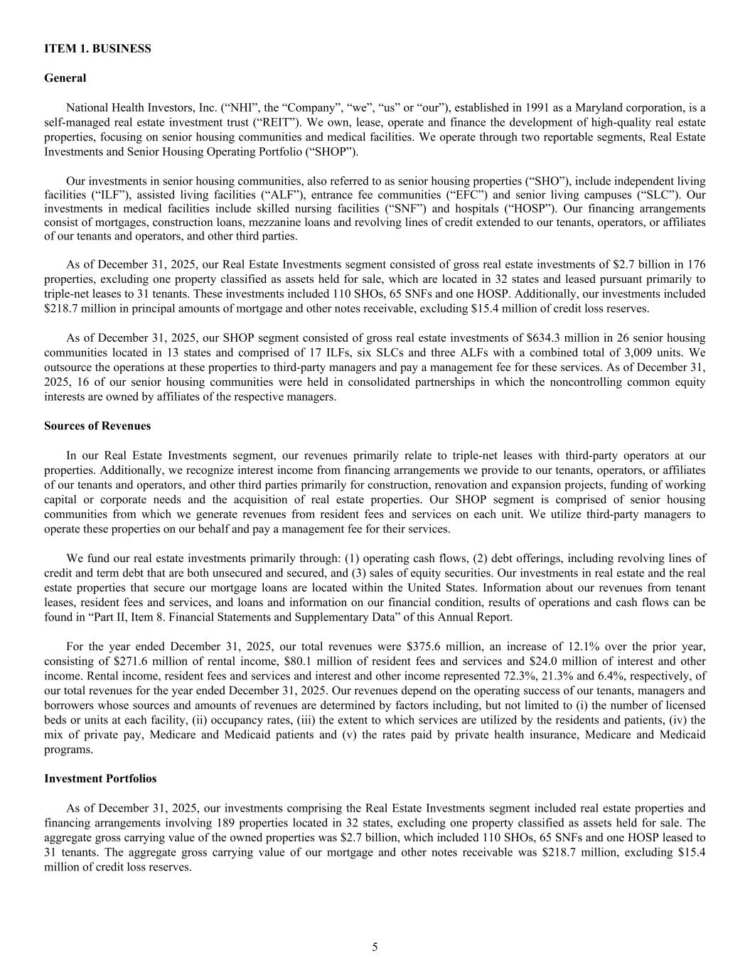 ITEM 1. BUSINESS General National Health Investors, Inc. (“NHI”, the “Company”, “we”, “us” or “our”), established in 1991 as a Maryland corporation, is a self-managed real estate investment trust (“REIT”). We own, lease, operate and finance the development of high-quality real estate properties, focusing on senior housing communities and medical facilities. We operate through two reportable segments, Real Estate Investments and Senior Housing Operating Portfolio (“SHOP”). Our investments in senior housing communities, also referred to as senior housing properties (“SHO”), include independent living facilities (“ILF”), assisted living facilities (“ALF”), entrance fee communities (“EFC”) and senior living campuses (“SLC”). Our investments in medical facilities include skilled nursing facilities (“SNF”) and hospitals (“HOSP”). Our financing arrangements consist of mortgages, construction loans, mezzanine loans and revolving lines of credit extended to our tenants, operators, or affiliates of our tenants and operators, and other third parties. As of December 31, 2025, our Real Estate Investments segment consisted of gross real estate investments of $2.7 billion in 176 properties, excluding one property classified as assets held for sale, which are located in 32 states and leased pursuant primarily to triple-net leases to 31 tenants. These investments included 110 SHOs, 65 SNFs and one HOSP. Additionally, our investments included $218.7 million in principal amounts of mortgage and other notes receivable, excluding $15.4 million of credit loss reserves. As of December 31, 2025, our SHOP segment consisted of gross real estate investments of $634.3 million in 26 senior housing communities located in 13 states and comprised of 17 ILFs, six SLCs and three ALFs with a combined total of 3,009 units. We outsource the operations at these properties to third-party managers and pay a management fee for these services. As of December 31, 2025, 16 of our senior housing communities were held in consolidated partnerships in which the noncontrolling common equity interests are owned by affiliates of the respective managers. Sources of Revenues In our Real Estate Investments segment, our revenues primarily relate to triple-net leases with third-party operators at our properties. Additionally, we recognize interest income from financing arrangements we provide to our tenants, operators, or affiliates of our tenants and operators, and other third parties primarily for construction, renovation and expansion projects, funding of working capital or corporate needs and the acquisition of real estate properties. Our SHOP segment is comprised of senior housing communities from which we generate revenues from resident fees and services on each unit. We utilize third-party managers to operate these properties on our behalf and pay a management fee for their services. We fund our real estate investments primarily through: (1) operating cash flows, (2) debt offerings, including revolving lines of credit and term debt that are both unsecured and secured, and (3) sales of equity securities. Our investments in real estate and the real estate properties that secure our mortgage loans are located within the United States. Information about our revenues from tenant leases, resident fees and services, and loans and information on our financial condition, results of operations and cash flows can be found in “Part II, Item 8. Financial Statements and Supplementary Data” of this Annual Report. For the year ended December 31, 2025, our total revenues were $375.6 million, an increase of 12.1% over the prior year, consisting of $271.6 million of rental income, $80.1 million of resident fees and services and $24.0 million of interest and other income. Rental income, resident fees and services and interest and other income represented 72.3%, 21.3% and 6.4%, respectively, of our total revenues for the year ended December 31, 2025. Our revenues depend on the operating success of our tenants, managers and borrowers whose sources and amounts of revenues are determined by factors including, but not limited to (i) the number of licensed beds or units at each facility, (ii) occupancy rates, (iii) the extent to which services are utilized by the residents and patients, (iv) the mix of private pay, Medicare and Medicaid patients and (v) the rates paid by private health insurance, Medicare and Medicaid programs. Investment Portfolios As of December 31, 2025, our investments comprising the Real Estate Investments segment included real estate properties and financing arrangements involving 189 properties located in 32 states, excluding one property classified as assets held for sale. The aggregate gross carrying value of the owned properties was $2.7 billion, which included 110 SHOs, 65 SNFs and one HOSP leased to 31 tenants. The aggregate gross carrying value of our mortgage and other notes receivable was $218.7 million, excluding $15.4 million of credit loss reserves. 5