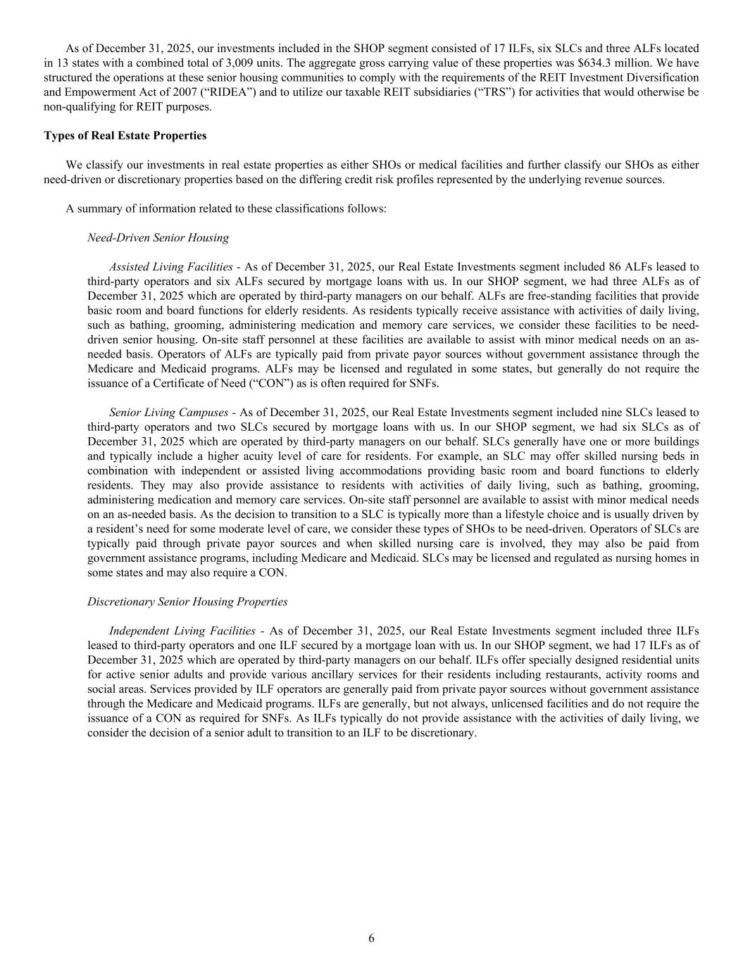 A summary of information related to these classifications follows: Need-Driven Senior Housing Assisted Living Facilities - As of December 31, 2025, our Real Estate Investments segment included 86 ALFs leased to third-party operators and six ALFs secured by mortgage loans with us. In our SHOP segment, we had three ALFs as of December 31, 2025 which are operated by third-party managers on our behalf. ALFs are free-standing facilities that provide basic room and board functions for elderly residents. As residents typically receive assistance with activities of daily living, such as bathing, grooming, administering medication and memory care services, we consider these facilities to be need- driven senior housing. On-site staff personnel at these facilities are available to assist with minor medical needs on an as- needed basis. Operators of ALFs are typically paid from private payor sources without government assistance through the Medicare and Medicaid programs. ALFs may be licensed and regulated in some states, but generally do not require the issuance of a Certificate of Need (“CON”) as is often required for SNFs. Senior Living Campuses - As of December 31, 2025, our Real Estate Investments segment included nine SLCs leased to third-party operators and two SLCs secured by mortgage loans with us. In our SHOP segment, we had six SLCs as of December 31, 2025 which are operated by third-party managers on our behalf. SLCs generally have one or more buildings and typically include a higher acuity level of care for residents. For example, an SLC may offer skilled nursing beds in combination with independent or assisted living accommodations providing basic room and board functions to elderly residents. They may also provide assistance to residents with activities of daily living, such as bathing, grooming, administering medication and memory care services. On-site staff personnel are available to assist with minor medical needs on an as-needed basis. As the decision to transition to a SLC is typically more than a lifestyle choice and is usually driven by a resident’s need for some moderate level of care, we consider these types of SHOs to be need-driven. Operators of SLCs are typically paid through private payor sources and when skilled nursing care is involved, they may also be paid from government assistance programs, including Medicare and Medicaid. SLCs may be licensed and regulated as nursing homes in some states and may also require a CON. Discretionary Senior Housing Properties Independent Living Facilities - As of December 31, 2025, our Real Estate Investments segment included three ILFs leased to third-party operators and one ILF secured by a mortgage loan with us. In our SHOP segment, we had 17 ILFs as of December 31, 2025 which are operated by third-party managers on our behalf. ILFs offer specially designed residential units for active senior adults and provide various ancillary services for their residents including restaurants, activity rooms and social areas. Services provided by ILF operators are generally paid from private payor sources without government assistance through the Medicare and Medicaid programs. ILFs are generally, but not always, unlicensed facilities and do not require the issuance of a CON as required for SNFs. As ILFs typically do not provide assistance with the activities of daily living, we consider the decision of a senior adult to transition to an ILF to be discretionary. As of December 31, 2025, our investments included in the SHOP segment consisted of 17 ILFs, six SLCs and three ALFs located in 13 states with a combined total of 3,009 units. The aggregate gross carrying value of these properties was $634.3 million. We have structured the operations at these senior housing communities to comply with the requirements of the REIT Investment Diversification and Empowerment Act of 2007 (“RIDEA”) and to utilize our taxable REIT subsidiaries (“TRS”) for activities that would otherwise be non-qualifying for REIT purposes. Types of Real Estate Properties We classify our investments in real estate properties as either SHOs or medical facilities and further classify our SHOs as either need-driven or discretionary properties based on the differing credit risk profiles represented by the underlying revenue sources. 6