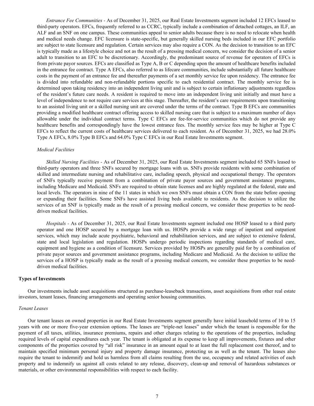 Entrance Fee Communities - As of December 31, 2025, our Real Estate Investments segment included 12 EFCs leased to third-party operators. EFCs, frequently referred to as CCRC, typically include a combination of detached cottages, an ILF, an ALF and an SNF on one campus. These communities appeal to senior adults because there is no need to relocate when health and medical needs change. EFC licensure is state-specific, but generally skilled nursing beds included in our EFC portfolio are subject to state licensure and regulation. Certain services may also require a CON. As the decision to transition to an EFC is typically made as a lifestyle choice and not as the result of a pressing medical concern, we consider the decision of a senior adult to transition to an EFC to be discretionary. Accordingly, the predominant source of revenue for operators of EFCs is from private payor sources. EFCs are classified as Type A, B or C depending upon the amount of healthcare benefits included in the entrance fee contract. Type A EFCs, also referred to as lifecare communities, include substantially all future healthcare costs in the payment of an entrance fee and thereafter payments of a set monthly service fee upon residency. The entrance fee is divided into refundable and non-refundable portions specific to each residential contract. The monthly service fee is determined upon taking residency into an independent living unit and is subject to certain inflationary adjustments regardless of the resident’s future care needs. A resident is required to move into an independent living unit initially and must have a level of independence to not require care services at this stage. Thereafter, the resident’s care requirements upon transitioning to an assisted living unit or a skilled nursing unit are covered under the terms of the contract. Type B EFCs are communities providing a modified healthcare contract offering access to skilled nursing care that is subject to a maximum number of days allowable under the individual contract terms. Type C EFCs are fee-for-service communities which do not provide any healthcare benefits and correspondingly have the lowest entrance fees. The monthly service fees may be higher at Type C EFCs to reflect the current costs of healthcare services delivered to each resident. As of December 31, 2025, we had 28.0% Type A EFCs, 8.0% Type B EFCs and 64.0% Type C EFCs in our Real Estate Investments segment. Medical Facilities Skilled Nursing Facilities - As of December 31, 2025, our Real Estate Investments segment included 65 SNFs leased to third-party operators and three SNFs secured by mortgage loans with us. SNFs provide residents with some combination of skilled and intermediate nursing and rehabilitative care, including speech, physical and occupational therapy. The operators of SNFs typically receive payment from a combination of private payor sources and government assistance programs, including Medicare and Medicaid. SNFs are required to obtain state licenses and are highly regulated at the federal, state and local levels. The operators in nine of the 11 states in which we own SNFs must obtain a CON from the state before opening or expanding their facilities. Some SNFs have assisted living beds available to residents. As the decision to utilize the services of an SNF is typically made as the result of a pressing medical concern, we consider these properties to be need- driven medical facilities. Hospitals - As of December 31, 2025, our Real Estate Investments segment included one HOSP leased to a third party operator and one HOSP secured by a mortgage loan with us. HOSPs provide a wide range of inpatient and outpatient services, which may include acute psychiatric, behavioral and rehabilitation services, and are subject to extensive federal, state and local legislation and regulation. HOSPs undergo periodic inspections regarding standards of medical care, equipment and hygiene as a condition of licensure. Services provided by HOSPs are generally paid for by a combination of private payor sources and government assistance programs, including Medicare and Medicaid. As the decision to utilize the services of a HOSP is typically made as the result of a pressing medical concern, we consider these properties to be need- driven medical facilities. Types of Investments Our investments include asset acquisitions structured as purchase-leaseback transactions, asset acquisitions from other real estate investors, tenant leases, financing arrangements and operating senior housing communities. Tenant Leases Our tenant leases on owned properties in our Real Estate Investments segment generally have initial leasehold terms of 10 to 15 years with one or more five-year extension options. The leases are “triple-net leases” under which the tenant is responsible for the payment of all taxes, utilities, insurance premiums, repairs and other charges relating to the operations of the properties, including required levels of capital expenditures each year. The tenant is obligated at its expense to keep all improvements, fixtures and other components of the properties covered by “all risk” insurance in an amount equal to at least the full replacement cost thereof, and to maintain specified minimum personal injury and property damage insurance, protecting us as well as the tenant. The leases also require the tenant to indemnify and hold us harmless from all claims resulting from the use, occupancy and related activities of each property and to indemnify us against all costs related to any release, discovery, clean-up and removal of hazardous substances or materials, or other environmental responsibilities with respect to each facility. 7