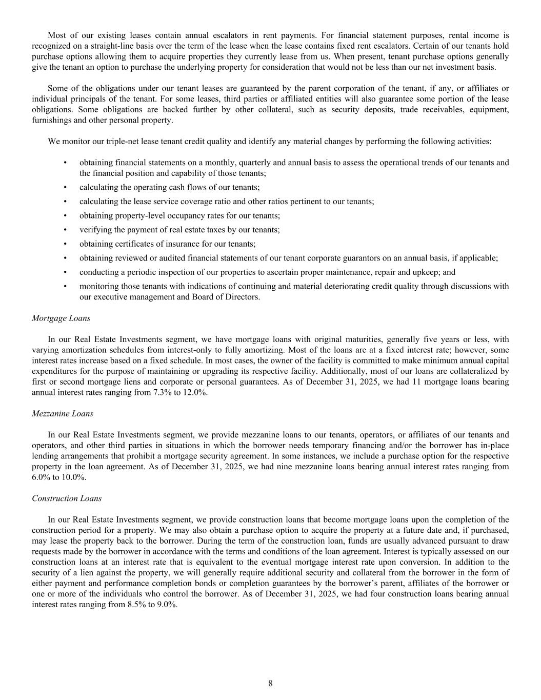 • obtaining financial statements on a monthly, quarterly and annual basis to assess the operational trends of our tenants and the financial position and capability of those tenants; • calculating the operating cash flows of our tenants; • calculating the lease service coverage ratio and other ratios pertinent to our tenants; • obtaining property-level occupancy rates for our tenants; • verifying the payment of real estate taxes by our tenants; • obtaining certificates of insurance for our tenants; • obtaining reviewed or audited financial statements of our tenant corporate guarantors on an annual basis, if applicable; • conducting a periodic inspection of our properties to ascertain proper maintenance, repair and upkeep; and • monitoring those tenants with indications of continuing and material deteriorating credit quality through discussions with our executive management and Board of Directors. Mortgage Loans In our Real Estate Investments segment, we have mortgage loans with original maturities, generally five years or less, with varying amortization schedules from interest-only to fully amortizing. Most of the loans are at a fixed interest rate; however, some interest rates increase based on a fixed schedule. In most cases, the owner of the facility is committed to make minimum annual capital expenditures for the purpose of maintaining or upgrading its respective facility. Additionally, most of our loans are collateralized by first or second mortgage liens and corporate or personal guarantees. As of December 31, 2025, we had 11 mortgage loans bearing annual interest rates ranging from 7.3% to 12.0%. Mezzanine Loans In our Real Estate Investments segment, we provide mezzanine loans to our tenants, operators, or affiliates of our tenants and operators, and other third parties in situations in which the borrower needs temporary financing and/or the borrower has in-place lending arrangements that prohibit a mortgage security agreement. In some instances, we include a purchase option for the respective property in the loan agreement. As of December 31, 2025, we had nine mezzanine loans bearing annual interest rates ranging from 6.0% to 10.0%. Construction Loans In our Real Estate Investments segment, we provide construction loans that become mortgage loans upon the completion of the construction period for a property. We may also obtain a purchase option to acquire the property at a future date and, if purchased, may lease the property back to the borrower. During the term of the construction loan, funds are usually advanced pursuant to draw requests made by the borrower in accordance with the terms and conditions of the loan agreement. Interest is typically assessed on our construction loans at an interest rate that is equivalent to the eventual mortgage interest rate upon conversion. In addition to the security of a lien against the property, we will generally require additional security and collateral from the borrower in the form of either payment and performance completion bonds or completion guarantees by the borrower’s parent, affiliates of the borrower or one or more of the individuals who control the borrower. As of December 31, 2025, we had four construction loans bearing annual interest rates ranging from 8.5% to 9.0%. Most of our existing leases contain annual escalators in rent payments. For financial statement purposes, rental income is recognized on a straight-line basis over the term of the lease when the lease contains fixed rent escalators. Certain of our tenants hold purchase options allowing them to acquire properties they currently lease from us. When present, tenant purchase options generally give the tenant an option to purchase the underlying property for consideration that would not be less than our net investment basis. Some of the obligations under our tenant leases are guaranteed by the parent corporation of the tenant, if any, or affiliates or individual principals of the tenant. For some leases, third parties or affiliated entities will also guarantee some portion of the lease obligations. Some obligations are backed further by other collateral, such as security deposits, trade receivables, equipment, furnishings and other personal property. We monitor our triple-net lease tenant credit quality and identify any material changes by performing the following activities: 8