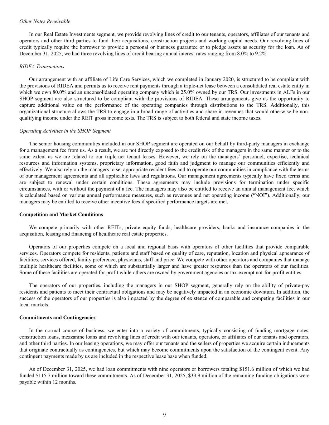Other Notes Receivable In our Real Estate Investments segment, we provide revolving lines of credit to our tenants, operators, affiliates of our tenants and operators and other third parties to fund their acquisitions, construction projects and working capital needs. Our revolving lines of credit typically require the borrower to provide a personal or business guarantee or to pledge assets as security for the loan. As of December 31, 2025, we had three revolving lines of credit bearing annual interest rates ranging from 8.0% to 9.2%. RIDEA Transactions Our arrangement with an affiliate of Life Care Services, which we completed in January 2020, is structured to be compliant with the provisions of RIDEA and permits us to receive rent payments through a triple-net lease between a consolidated real estate entity in which we own 80.0% and an unconsolidated operating company which is 25.0% owned by our TRS. Our investments in ALFs in our SHOP segment are also structured to be compliant with the provisions of RIDEA. These arrangements give us the opportunity to capture additional value on the performance of the operating companies through distributions to the TRS. Additionally, this organizational structure allows the TRS to engage in a broad range of activities and share in revenues that would otherwise be non- qualifying income under the REIT gross income tests. The TRS is subject to both federal and state income taxes. Operating Activities in the SHOP Segment The senior housing communities included in our SHOP segment are operated on our behalf by third-party managers in exchange for a management fee from us. As a result, we are not directly exposed to the credit risk of the managers in the same manner or to the same extent as we are related to our triple-net tenant leases. However, we rely on the managers’ personnel, expertise, technical resources and information systems, proprietary information, good faith and judgment to manage our communities efficiently and effectively. We also rely on the managers to set appropriate resident fees and to operate our communities in compliance with the terms of our management agreements and all applicable laws and regulations. Our management agreements typically have fixed terms and are subject to renewal under certain conditions. These agreements may include provisions for termination under specific circumstances, with or without the payment of a fee. The managers may also be entitled to receive an annual management fee, which is calculated based on various annual performance measures, such as revenues and net operating income (“NOI”). Additionally, our managers may be entitled to receive other incentive fees if specified performance targets are met. Competition and Market Conditions We compete primarily with other REITs, private equity funds, healthcare providers, banks and insurance companies in the acquisition, leasing and financing of healthcare real estate properties. Operators of our properties compete on a local and regional basis with operators of other facilities that provide comparable services. Operators compete for residents, patients and staff based on quality of care, reputation, location and physical appearance of facilities, services offered, family preference, physicians, staff and price. We compete with other operators and companies that manage multiple healthcare facilities, some of which are substantially larger and have greater resources than the operators of our facilities. Some of these facilities are operated for profit while others are owned by government agencies or tax-exempt not-for-profit entities. The operators of our properties, including the managers in our SHOP segment, generally rely on the ability of private-pay residents and patients to meet their contractual obligations and may be negatively impacted in an economic downturn. In addition, the success of the operators of our properties is also impacted by the degree of existence of comparable and competing facilities in our local markets. Commitments and Contingencies In the normal course of business, we enter into a variety of commitments, typically consisting of funding mortgage notes, construction loans, mezzanine loans and revolving lines of credit with our tenants, operators, or affiliates of our tenants and operators, and other third parties. In our leasing operations, we may offer our tenants and the sellers of properties we acquire certain inducements that originate contractually as contingencies, but which may become commitments upon the satisfaction of the contingent event. Any contingent payments made by us are included in the respective lease base when funded. As of December 31, 2025, we had loan commitments with nine operators or borrowers totaling $151.6 million of which we had funded $115.7 million toward these commitments. As of December 31, 2025, $33.9 million of the remaining funding obligations were payable within 12 months. 9