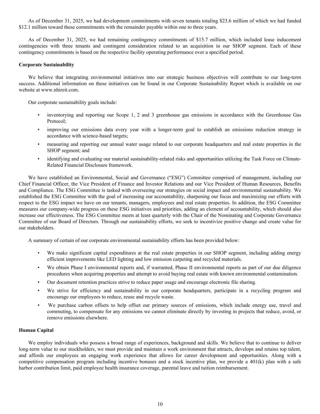 Our corporate sustainability goals include: • inventorying and reporting our Scope 1, 2 and 3 greenhouse gas emissions in accordance with the Greenhouse Gas Protocol; • improving our emissions data every year with a longer-term goal to establish an emissions reduction strategy in accordance with science-based targets; • measuring and reporting our annual water usage related to our corporate headquarters and real estate properties in the SHOP segment; and • identifying and evaluating our material sustainability-related risks and opportunities utilizing the Task Force on Climate- Related Financial Disclosure framework. We have established an Environmental, Social and Governance (“ESG”) Committee comprised of management, including our Chief Financial Officer, the Vice President of Finance and Investor Relations and our Vice President of Human Resources, Benefits and Compliance. The ESG Committee is tasked with overseeing our strategies on social impact and environmental sustainability. We established the ESG Committee with the goal of increasing our accountability, sharpening our focus and maximizing our efforts with respect to the ESG impact we have on our tenants, managers, employees and real estate properties. In addition, the ESG Committee measures our company-wide progress on these ESG initiatives and priorities, adding an element of accountability, which should also increase our effectiveness. The ESG Committee meets at least quarterly with the Chair of the Nominating and Corporate Governance Committee of our Board of Directors. Through our sustainability efforts, we seek to incentivize positive change and create value for our stakeholders. A summary of certain of our corporate environmental sustainability efforts has been provided below: • We make significant capital expenditures at the real estate properties in our SHOP segment, including adding energy efficient improvements like LED lighting and low emission carpeting and recycled materials. • We obtain Phase I environmental reports and, if warranted, Phase II environmental reports as part of our due diligence procedures when acquiring properties and attempt to avoid buying real estate with known environmental contamination. • Our document retention practices strive to reduce paper usage and encourage electronic file sharing. • We strive for efficiency and sustainability in our corporate headquarters, participate in a recycling program and encourage our employees to reduce, reuse and recycle waste. • We purchase carbon offsets to help offset our primary sources of emissions, which include energy use, travel and commuting, to compensate for any emissions we cannot eliminate directly by investing in projects that reduce, avoid, or remove emissions elsewhere. Human Capital We employ individuals who possess a broad range of experiences, background and skills. We believe that to continue to deliver long-term value to our stockholders, we must provide and maintain a work environment that attracts, develops and retains top talent, and affords our employees an engaging work experience that allows for career development and opportunities. Along with a competitive compensation program including incentive bonuses and a stock incentive plan, we provide a 401(k) plan with a safe harbor contribution limit, paid employee health insurance coverage, parental leave and tuition reimbursement. As of December 31, 2025, we had development commitments with seven tenants totaling $23.6 million of which we had funded $12.1 million toward these commitments with the remainder payable within one to three years. As of December 31, 2025, we had remaining contingency commitments of $15.7 million, which included lease inducement contingencies with three tenants and contingent consideration related to an acquisition in our SHOP segment. Each of these contingency commitments is based on the respective facility operating performance over a specified period. Corporate Sustainability We believe that integrating environmental initiatives into our strategic business objectives will contribute to our long-term success. Additional information on these initiatives can be found in our Corporate Sustainability Report which is available on our website at www.nhireit.com. 10