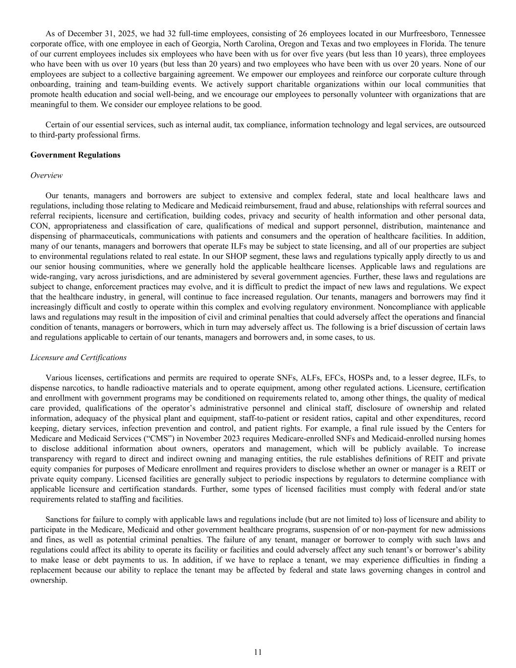 As of December 31, 2025, we had 32 full-time employees, consisting of 26 employees located in our Murfreesboro, Tennessee corporate office, with one employee in each of Georgia, North Carolina, Oregon and Texas and two employees in Florida. The tenure of our current employees includes six employees who have been with us for over five years (but less than 10 years), three employees who have been with us over 10 years (but less than 20 years) and two employees who have been with us over 20 years. None of our employees are subject to a collective bargaining agreement. We empower our employees and reinforce our corporate culture through onboarding, training and team-building events. We actively support charitable organizations within our local communities that promote health education and social well-being, and we encourage our employees to personally volunteer with organizations that are meaningful to them. We consider our employee relations to be good. Certain of our essential services, such as internal audit, tax compliance, information technology and legal services, are outsourced to third-party professional firms. Government Regulations Overview Our tenants, managers and borrowers are subject to extensive and complex federal, state and local healthcare laws and regulations, including those relating to Medicare and Medicaid reimbursement, fraud and abuse, relationships with referral sources and referral recipients, licensure and certification, building codes, privacy and security of health information and other personal data, CON, appropriateness and classification of care, qualifications of medical and support personnel, distribution, maintenance and dispensing of pharmaceuticals, communications with patients and consumers and the operation of healthcare facilities. In addition, many of our tenants, managers and borrowers that operate ILFs may be subject to state licensing, and all of our properties are subject to environmental regulations related to real estate. In our SHOP segment, these laws and regulations typically apply directly to us and our senior housing communities, where we generally hold the applicable healthcare licenses. Applicable laws and regulations are wide-ranging, vary across jurisdictions, and are administered by several government agencies. Further, these laws and regulations are subject to change, enforcement practices may evolve, and it is difficult to predict the impact of new laws and regulations. We expect that the healthcare industry, in general, will continue to face increased regulation. Our tenants, managers and borrowers may find it increasingly difficult and costly to operate within this complex and evolving regulatory environment. Noncompliance with applicable laws and regulations may result in the imposition of civil and criminal penalties that could adversely affect the operations and financial condition of tenants, managers or borrowers, which in turn may adversely affect us. The following is a brief discussion of certain laws and regulations applicable to certain of our tenants, managers and borrowers and, in some cases, to us. Licensure and Certifications Various licenses, certifications and permits are required to operate SNFs, ALFs, EFCs, HOSPs and, to a lesser degree, ILFs, to dispense narcotics, to handle radioactive materials and to operate equipment, among other regulated actions. Licensure, certification and enrollment with government programs may be conditioned on requirements related to, among other things, the quality of medical care provided, qualifications of the operator’s administrative personnel and clinical staff, disclosure of ownership and related information, adequacy of the physical plant and equipment, staff-to-patient or resident ratios, capital and other expenditures, record keeping, dietary services, infection prevention and control, and patient rights. For example, a final rule issued by the Centers for Medicare and Medicaid Services (“CMS”) in November 2023 requires Medicare-enrolled SNFs and Medicaid-enrolled nursing homes to disclose additional information about owners, operators and management, which will be publicly available. To increase transparency with regard to direct and indirect owning and managing entities, the rule establishes definitions of REIT and private equity companies for purposes of Medicare enrollment and requires providers to disclose whether an owner or manager is a REIT or private equity company. Licensed facilities are generally subject to periodic inspections by regulators to determine compliance with applicable licensure and certification standards. Further, some types of licensed facilities must comply with federal and/or state requirements related to staffing and facilities. Sanctions for failure to comply with applicable laws and regulations include (but are not limited to) loss of licensure and ability to participate in the Medicare, Medicaid and other government healthcare programs, suspension of or non-payment for new admissions and fines, as well as potential criminal penalties. The failure of any tenant, manager or borrower to comply with such laws and regulations could affect its ability to operate its facility or facilities and could adversely affect any such tenant’s or borrower’s ability to make lease or debt payments to us. In addition, if we have to replace a tenant, we may experience difficulties in finding a replacement because our ability to replace the tenant may be affected by federal and state laws governing changes in control and ownership. 11