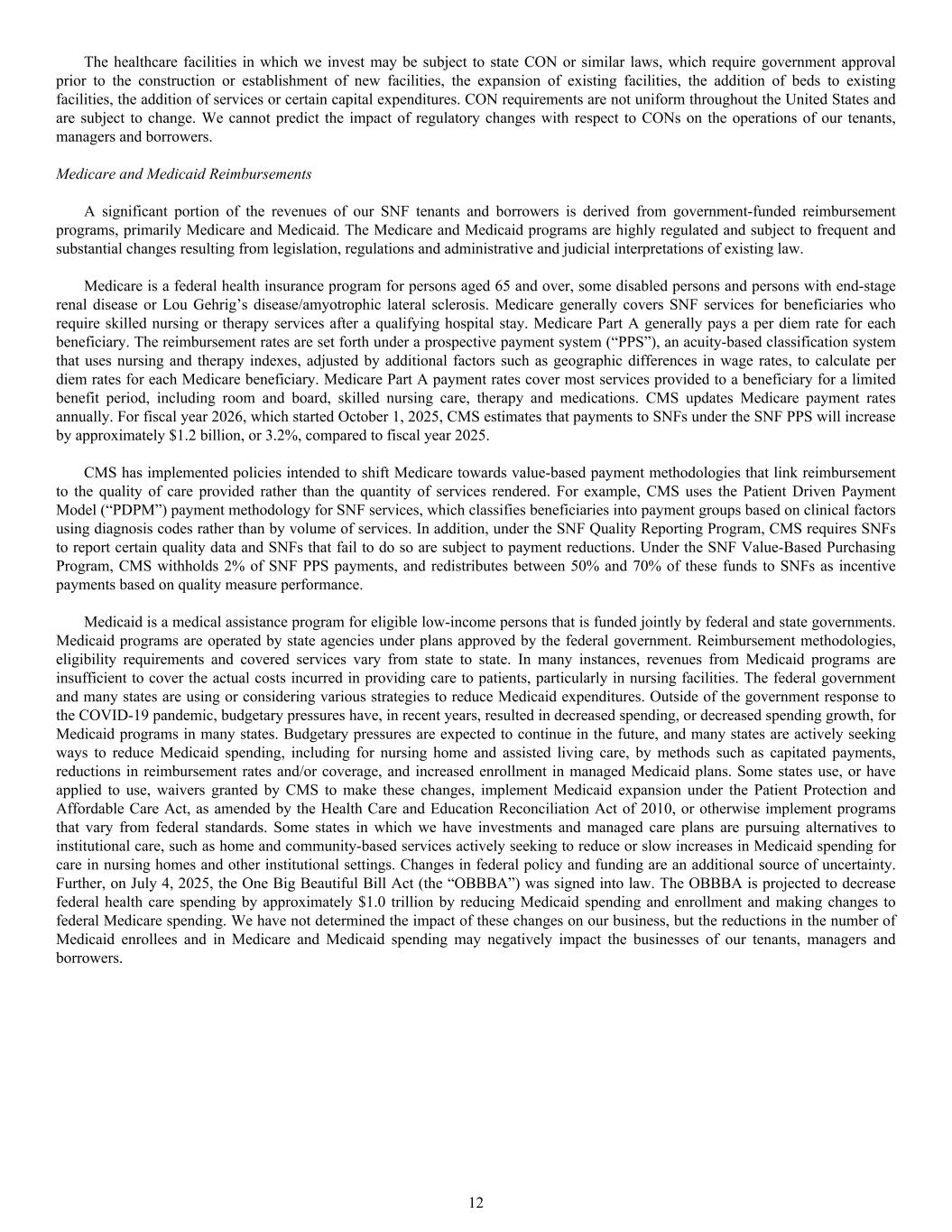The healthcare facilities in which we invest may be subject to state CON or similar laws, which require government approval prior to the construction or establishment of new facilities, the expansion of existing facilities, the addition of beds to existing facilities, the addition of services or certain capital expenditures. CON requirements are not uniform throughout the United States and are subject to change. We cannot predict the impact of regulatory changes with respect to CONs on the operations of our tenants, managers and borrowers. Medicare and Medicaid Reimbursements A significant portion of the revenues of our SNF tenants and borrowers is derived from government-funded reimbursement programs, primarily Medicare and Medicaid. The Medicare and Medicaid programs are highly regulated and subject to frequent and substantial changes resulting from legislation, regulations and administrative and judicial interpretations of existing law. Medicare is a federal health insurance program for persons aged 65 and over, some disabled persons and persons with end-stage renal disease or Lou Gehrig’s disease/amyotrophic lateral sclerosis. Medicare generally covers SNF services for beneficiaries who require skilled nursing or therapy services after a qualifying hospital stay. Medicare Part A generally pays a per diem rate for each beneficiary. The reimbursement rates are set forth under a prospective payment system (“PPS”), an acuity-based classification system that uses nursing and therapy indexes, adjusted by additional factors such as geographic differences in wage rates, to calculate per diem rates for each Medicare beneficiary. Medicare Part A payment rates cover most services provided to a beneficiary for a limited benefit period, including room and board, skilled nursing care, therapy and medications. CMS updates Medicare payment rates annually. For fiscal year 2026, which started October 1, 2025, CMS estimates that payments to SNFs under the SNF PPS will increase by approximately $1.2 billion, or 3.2%, compared to fiscal year 2025. CMS has implemented policies intended to shift Medicare towards value-based payment methodologies that link reimbursement to the quality of care provided rather than the quantity of services rendered. For example, CMS uses the Patient Driven Payment Model (“PDPM”) payment methodology for SNF services, which classifies beneficiaries into payment groups based on clinical factors using diagnosis codes rather than by volume of services. In addition, under the SNF Quality Reporting Program, CMS requires SNFs to report certain quality data and SNFs that fail to do so are subject to payment reductions. Under the SNF Value-Based Purchasing Program, CMS withholds 2% of SNF PPS payments, and redistributes between 50% and 70% of these funds to SNFs as incentive payments based on quality measure performance. Medicaid is a medical assistance program for eligible low-income persons that is funded jointly by federal and state governments. Medicaid programs are operated by state agencies under plans approved by the federal government. Reimbursement methodologies, eligibility requirements and covered services vary from state to state. In many instances, revenues from Medicaid programs are insufficient to cover the actual costs incurred in providing care to patients, particularly in nursing facilities. The federal government and many states are using or considering various strategies to reduce Medicaid expenditures. Outside of the government response to the COVID-19 pandemic, budgetary pressures have, in recent years, resulted in decreased spending, or decreased spending growth, for Medicaid programs in many states. Budgetary pressures are expected to continue in the future, and many states are actively seeking ways to reduce Medicaid spending, including for nursing home and assisted living care, by methods such as capitated payments, reductions in reimbursement rates and/or coverage, and increased enrollment in managed Medicaid plans. Some states use, or have applied to use, waivers granted by CMS to make these changes, implement Medicaid expansion under the Patient Protection and Affordable Care Act, as amended by the Health Care and Education Reconciliation Act of 2010, or otherwise implement programs that vary from federal standards. Some states in which we have investments and managed care plans are pursuing alternatives to institutional care, such as home and community-based services actively seeking to reduce or slow increases in Medicaid spending for care in nursing homes and other institutional settings. Changes in federal policy and funding are an additional source of uncertainty. Further, on July 4, 2025, the One Big Beautiful Bill Act (the “OBBBA”) was signed into law. The OBBBA is projected to decrease federal health care spending by approximately $1.0 trillion by reducing Medicaid spending and enrollment and making changes to federal Medicare spending. We have not determined the impact of these changes on our business, but the reductions in the number of Medicaid enrollees and in Medicare and Medicaid spending may negatively impact the businesses of our tenants, managers and borrowers. 12