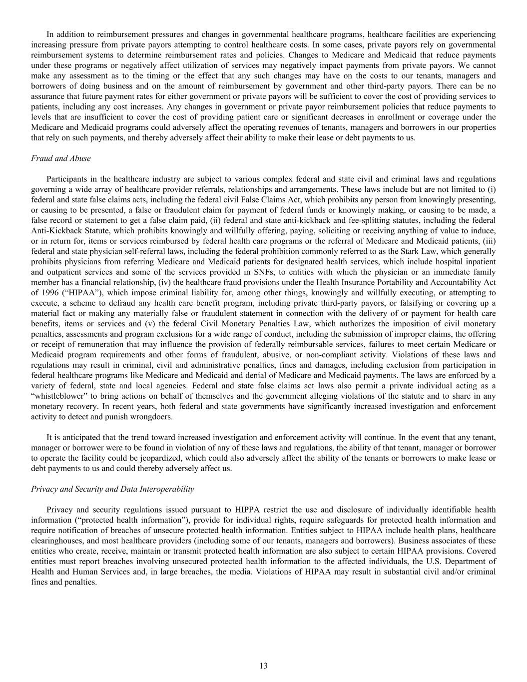 In addition to reimbursement pressures and changes in governmental healthcare programs, healthcare facilities are experiencing increasing pressure from private payors attempting to control healthcare costs. In some cases, private payors rely on governmental reimbursement systems to determine reimbursement rates and policies. Changes to Medicare and Medicaid that reduce payments under these programs or negatively affect utilization of services may negatively impact payments from private payors. We cannot make any assessment as to the timing or the effect that any such changes may have on the costs to our tenants, managers and borrowers of doing business and on the amount of reimbursement by government and other third-party payors. There can be no assurance that future payment rates for either government or private payors will be sufficient to cover the cost of providing services to patients, including any cost increases. Any changes in government or private payor reimbursement policies that reduce payments to levels that are insufficient to cover the cost of providing patient care or significant decreases in enrollment or coverage under the Medicare and Medicaid programs could adversely affect the operating revenues of tenants, managers and borrowers in our properties that rely on such payments, and thereby adversely affect their ability to make their lease or debt payments to us. Fraud and Abuse Participants in the healthcare industry are subject to various complex federal and state civil and criminal laws and regulations governing a wide array of healthcare provider referrals, relationships and arrangements. These laws include but are not limited to (i) federal and state false claims acts, including the federal civil False Claims Act, which prohibits any person from knowingly presenting, or causing to be presented, a false or fraudulent claim for payment of federal funds or knowingly making, or causing to be made, a false record or statement to get a false claim paid, (ii) federal and state anti-kickback and fee-splitting statutes, including the federal Anti-Kickback Statute, which prohibits knowingly and willfully offering, paying, soliciting or receiving anything of value to induce, or in return for, items or services reimbursed by federal health care programs or the referral of Medicare and Medicaid patients, (iii) federal and state physician self-referral laws, including the federal prohibition commonly referred to as the Stark Law, which generally prohibits physicians from referring Medicare and Medicaid patients for designated health services, which include hospital inpatient and outpatient services and some of the services provided in SNFs, to entities with which the physician or an immediate family member has a financial relationship, (iv) the healthcare fraud provisions under the Health Insurance Portability and Accountability Act of 1996 (“HIPAA”), which impose criminal liability for, among other things, knowingly and willfully executing, or attempting to execute, a scheme to defraud any health care benefit program, including private third-party payors, or falsifying or covering up a material fact or making any materially false or fraudulent statement in connection with the delivery of or payment for health care benefits, items or services and (v) the federal Civil Monetary Penalties Law, which authorizes the imposition of civil monetary penalties, assessments and program exclusions for a wide range of conduct, including the submission of improper claims, the offering or receipt of remuneration that may influence the provision of federally reimbursable services, failures to meet certain Medicare or Medicaid program requirements and other forms of fraudulent, abusive, or non-compliant activity. Violations of these laws and regulations may result in criminal, civil and administrative penalties, fines and damages, including exclusion from participation in federal healthcare programs like Medicare and Medicaid and denial of Medicare and Medicaid payments. The laws are enforced by a variety of federal, state and local agencies. Federal and state false claims act laws also permit a private individual acting as a “whistleblower” to bring actions on behalf of themselves and the government alleging violations of the statute and to share in any monetary recovery. In recent years, both federal and state governments have significantly increased investigation and enforcement activity to detect and punish wrongdoers. It is anticipated that the trend toward increased investigation and enforcement activity will continue. In the event that any tenant, manager or borrower were to be found in violation of any of these laws and regulations, the ability of that tenant, manager or borrower to operate the facility could be jeopardized, which could also adversely affect the ability of the tenants or borrowers to make lease or debt payments to us and could thereby adversely affect us. Privacy and Security and Data Interoperability Privacy and security regulations issued pursuant to HIPPA restrict the use and disclosure of individually identifiable health information (“protected health information”), provide for individual rights, require safeguards for protected health information and require notification of breaches of unsecure protected health information. Entities subject to HIPAA include health plans, healthcare clearinghouses, and most healthcare providers (including some of our tenants, managers and borrowers). Business associates of these entities who create, receive, maintain or transmit protected health information are also subject to certain HIPAA provisions. Covered entities must report breaches involving unsecured protected health information to the affected individuals, the U.S. Department of Health and Human Services and, in large breaches, the media. Violations of HIPAA may result in substantial civil and/or criminal fines and penalties. 13