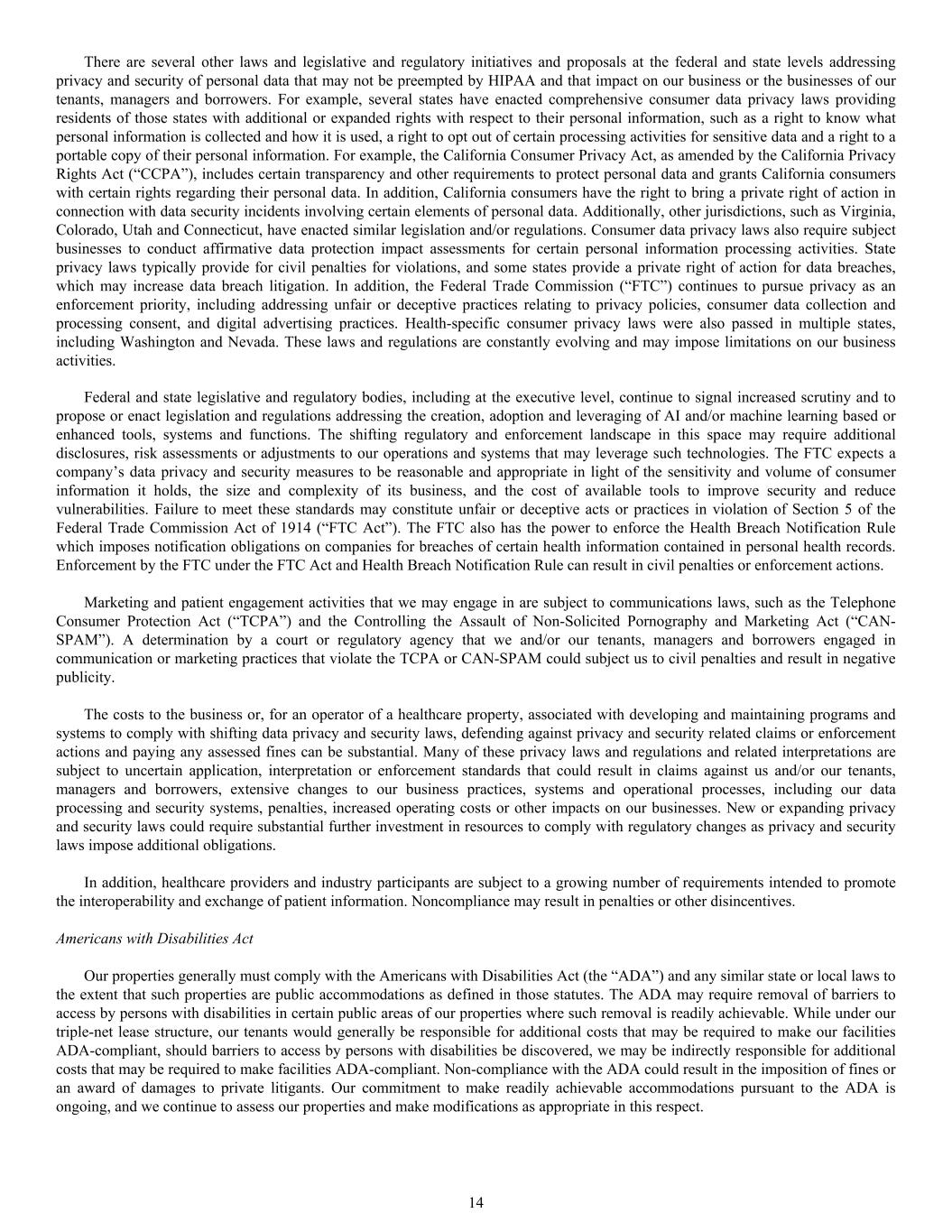 There are several other laws and legislative and regulatory initiatives and proposals at the federal and state levels addressing privacy and security of personal data that may not be preempted by HIPAA and that impact on our business or the businesses of our tenants, managers and borrowers. For example, several states have enacted comprehensive consumer data privacy laws providing residents of those states with additional or expanded rights with respect to their personal information, such as a right to know what personal information is collected and how it is used, a right to opt out of certain processing activities for sensitive data and a right to a portable copy of their personal information. For example, the California Consumer Privacy Act, as amended by the California Privacy Rights Act (“CCPA”), includes certain transparency and other requirements to protect personal data and grants California consumers with certain rights regarding their personal data. In addition, California consumers have the right to bring a private right of action in connection with data security incidents involving certain elements of personal data. Additionally, other jurisdictions, such as Virginia, Colorado, Utah and Connecticut, have enacted similar legislation and/or regulations. Consumer data privacy laws also require subject businesses to conduct affirmative data protection impact assessments for certain personal information processing activities. State privacy laws typically provide for civil penalties for violations, and some states provide a private right of action for data breaches, which may increase data breach litigation. In addition, the Federal Trade Commission (“FTC”) continues to pursue privacy as an enforcement priority, including addressing unfair or deceptive practices relating to privacy policies, consumer data collection and processing consent, and digital advertising practices. Health-specific consumer privacy laws were also passed in multiple states, including Washington and Nevada. These laws and regulations are constantly evolving and may impose limitations on our business activities. Federal and state legislative and regulatory bodies, including at the executive level, continue to signal increased scrutiny and to propose or enact legislation and regulations addressing the creation, adoption and leveraging of AI and/or machine learning based or enhanced tools, systems and functions. The shifting regulatory and enforcement landscape in this space may require additional disclosures, risk assessments or adjustments to our operations and systems that may leverage such technologies. The FTC expects a company’s data privacy and security measures to be reasonable and appropriate in light of the sensitivity and volume of consumer information it holds, the size and complexity of its business, and the cost of available tools to improve security and reduce vulnerabilities. Failure to meet these standards may constitute unfair or deceptive acts or practices in violation of Section 5 of the Federal Trade Commission Act of 1914 (“FTC Act”). The FTC also has the power to enforce the Health Breach Notification Rule which imposes notification obligations on companies for breaches of certain health information contained in personal health records. Enforcement by the FTC under the FTC Act and Health Breach Notification Rule can result in civil penalties or enforcement actions. Marketing and patient engagement activities that we may engage in are subject to communications laws, such as the Telephone Consumer Protection Act (“TCPA”) and the Controlling the Assault of Non-Solicited Pornography and Marketing Act (“CAN- SPAM”). A determination by a court or regulatory agency that we and/or our tenants, managers and borrowers engaged in communication or marketing practices that violate the TCPA or CAN-SPAM could subject us to civil penalties and result in negative publicity. The costs to the business or, for an operator of a healthcare property, associated with developing and maintaining programs and systems to comply with shifting data privacy and security laws, defending against privacy and security related claims or enforcement actions and paying any assessed fines can be substantial. Many of these privacy laws and regulations and related interpretations are subject to uncertain application, interpretation or enforcement standards that could result in claims against us and/or our tenants, managers and borrowers, extensive changes to our business practices, systems and operational processes, including our data processing and security systems, penalties, increased operating costs or other impacts on our businesses. New or expanding privacy and security laws could require substantial further investment in resources to comply with regulatory changes as privacy and security laws impose additional obligations. In addition, healthcare providers and industry participants are subject to a growing number of requirements intended to promote the interoperability and exchange of patient information. Noncompliance may result in penalties or other disincentives. Americans with Disabilities Act Our properties generally must comply with the Americans with Disabilities Act (the “ADA”) and any similar state or local laws to the extent that such properties are public accommodations as defined in those statutes. The ADA may require removal of barriers to access by persons with disabilities in certain public areas of our properties where such removal is readily achievable. While under our triple-net lease structure, our tenants would generally be responsible for additional costs that may be required to make our facilities ADA-compliant, should barriers to access by persons with disabilities be discovered, we may be indirectly responsible for additional costs that may be required to make facilities ADA-compliant. Non-compliance with the ADA could result in the imposition of fines or an award of damage