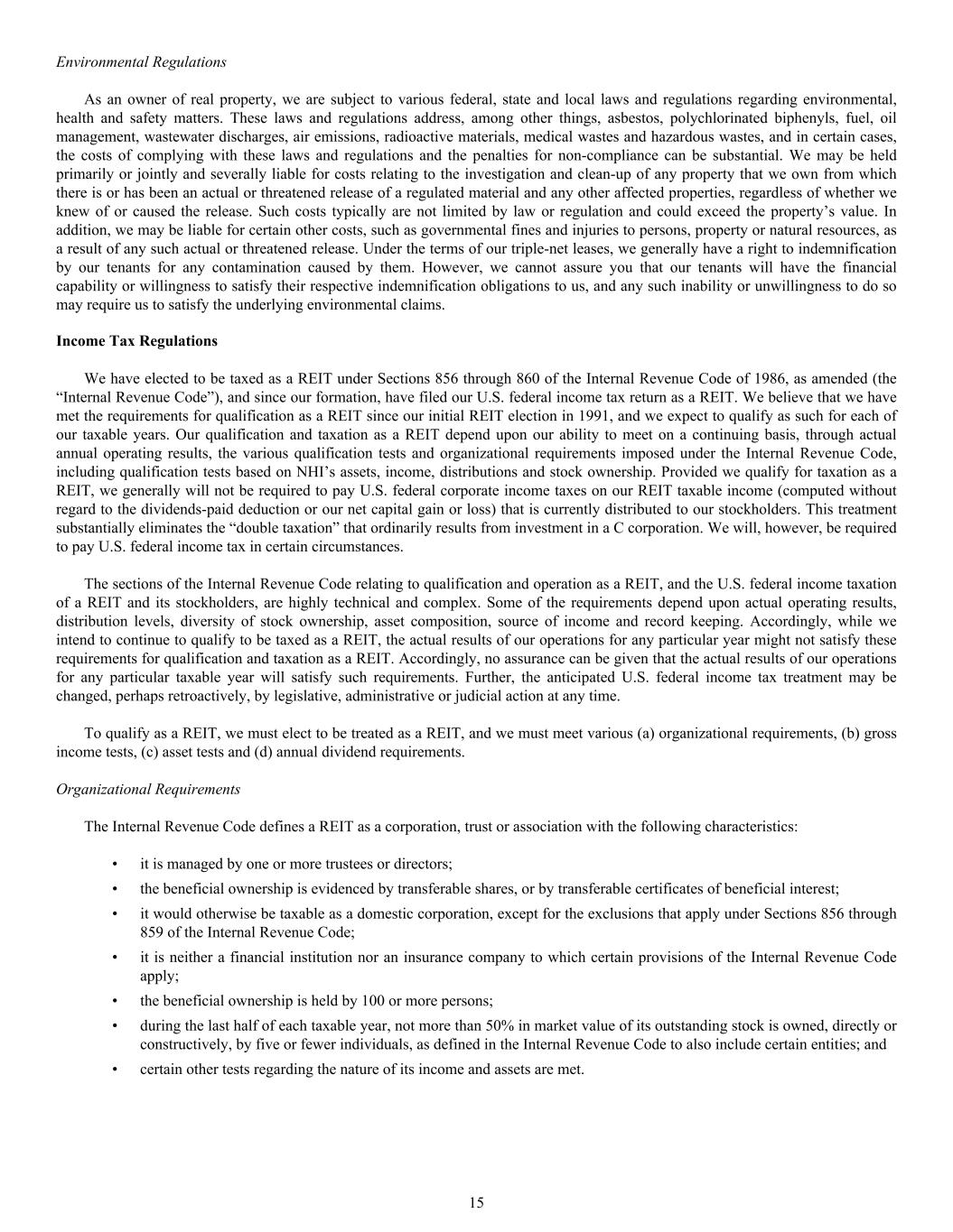 The Internal Revenue Code defines a REIT as a corporation, trust or association with the following characteristics: • it is managed by one or more trustees or directors; • the beneficial ownership is evidenced by transferable shares, or by transferable certificates of beneficial interest; • it would otherwise be taxable as a domestic corporation, except for the exclusions that apply under Sections 856 through 859 of the Internal Revenue Code; • it is neither a financial institution nor an insurance company to which certain provisions of the Internal Revenue Code apply; • the beneficial ownership is held by 100 or more persons; • during the last half of each taxable year, not more than 50% in market value of its outstanding stock is owned, directly or constructively, by five or fewer individuals, as defined in the Internal Revenue Code to also include certain entities; and • certain other tests regarding the nature of its income and assets are met. Environmental Regulations As an owner of real property, we are subject to various federal, state and local laws and regulations regarding environmental, health and safety matters. These laws and regulations address, among other things, asbestos, polychlorinated biphenyls, fuel, oil management, wastewater discharges, air emissions, radioactive materials, medical wastes and hazardous wastes, and in certain cases, the costs of complying with these laws and regulations and the penalties for non-compliance can be substantial. We may be held primarily or jointly and severally liable for costs relating to the investigation and clean-up of any property that we own from which there is or has been an actual or threatened release of a regulated material and any other affected properties, regardless of whether we knew of or caused the release. Such costs typically are not limited by law or regulation and could exceed the property’s value. In addition, we may be liable for certain other costs, such as governmental fines and injuries to persons, property or natural resources, as a result of any such actual or threatened release. Under the terms of our triple-net leases, we generally have a right to indemnification by our tenants for any contamination caused by them. However, we cannot assure you that our tenants will have the financial capability or willingness to satisfy their respective indemnification obligations to us, and any such inability or unwillingness to do so may require us to satisfy the underlying environmental claims. Income Tax Regulations We have elected to be taxed as a REIT under Sections 856 through 860 of the Internal Revenue Code of 1986, as amended (the “Internal Revenue Code”), and since our formation, have filed our U.S. federal income tax return as a REIT. We believe that we have met the requirements for qualification as a REIT since our initial REIT election in 1991, and we expect to qualify as such for each of our taxable years. Our qualification and taxation as a REIT depend upon our ability to meet on a continuing basis, through actual annual operating results, the various qualification tests and organizational requirements imposed under the Internal Revenue Code, including qualification tests based on NHI’s assets, income, distributions and stock ownership. Provided we qualify for taxation as a REIT, we generally will not be required to pay U.S. federal corporate income taxes on our REIT taxable income (computed without regard to the dividends-paid deduction or our net capital gain or loss) that is currently distributed to our stockholders. This treatment substantially eliminates the “double taxation” that ordinarily results from investment in a C corporation. We will, however, be required to pay U.S. federal income tax in certain circumstances. The sections of the Internal Revenue Code relating to qualification and operation as a REIT, and the U.S. federal income taxation of a REIT and its stockholders, are highly technical and complex. Some of the requirements depend upon actual operating results, distribution levels, diversity of stock ownership, asset composition, source of income and record keeping. Accordingly, while we intend to continue to qualify to be taxed as a REIT, the actual results of our operations for any particular year might not satisfy these requirements for qualification and taxation as a REIT. Accordingly, no assurance can be given that the actual results of our operations for any particular taxable year will satisfy such requirements. Further, the anticipated U.S. federal income tax treatment may be changed, perhaps retroactively, by legislative, administrative or judicial action at any time. To qualify as a REIT, we must elect to be treated as a REIT, and we must meet various (a) organizational requirements, (b) gross income tests, (c) asset tests and (d) annual dividend requirements. Organizational Requirements 15