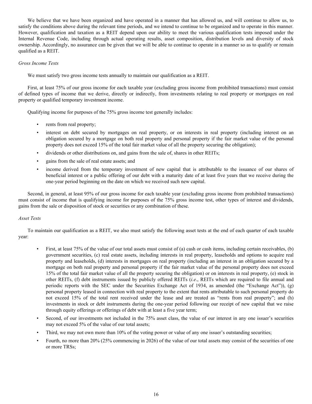 Qualifying income for purposes of the 75% gross income test generally includes: • rents from real property; • interest on debt secured by mortgages on real property, or on interests in real property (including interest on an obligation secured by a mortgage on both real property and personal property if the fair market value of the personal property does not exceed 15% of the total fair market value of all the property securing the obligation); • dividends or other distributions on, and gains from the sale of, shares in other REITs; • gains from the sale of real estate assets; and • income derived from the temporary investment of new capital that is attributable to the issuance of our shares of beneficial interest or a public offering of our debt with a maturity date of at least five years that we receive during the one-year period beginning on the date on which we received such new capital. Second, in general, at least 95% of our gross income for each taxable year (excluding gross income from prohibited transactions) must consist of income that is qualifying income for purposes of the 75% gross income test, other types of interest and dividends, gains from the sale or disposition of stock or securities or any combination of these. Asset Tests To maintain our qualification as a REIT, we also must satisfy the following asset tests at the end of each quarter of each taxable year: • First, at least 75% of the value of our total assets must consist of (a) cash or cash items, including certain receivables, (b) government securities, (c) real estate assets, including interests in real property, leaseholds and options to acquire real property and leaseholds, (d) interests in mortgages on real property (including an interest in an obligation secured by a mortgage on both real property and personal property if the fair market value of the personal property does not exceed 15% of the total fair market value of all the property securing the obligation) or on interests in real property, (e) stock in other REITs, (f) debt instruments issued by publicly offered REITs (i.e., REITs which are required to file annual and periodic reports with the SEC under the Securities Exchange Act of 1934, as amended (the “Exchange Act”)), (g) personal property leased in connection with real property to the extent that rents attributable to such personal property do not exceed 15% of the total rent received under the lease and are treated as “rents from real property”; and (h) investments in stock or debt instruments during the one-year period following our receipt of new capital that we raise through equity offerings or offerings of debt with at least a five year term; • Second, of our investments not included in the 75% asset class, the value of our interest in any one issuer’s securities may not exceed 5% of the value of our total assets; • Third, we may not own more than 10% of the voting power or value of any one issuer’s outstanding securities; • Fourth, no more than 20% (25% commencing in 2026) of the value of our total assets may consist of the securities of one or more TRSs; We believe that we have been organized and have operated in a manner that has allowed us, and will continue to allow us, to satisfy the conditions above during the relevant time periods, and we intend to continue to be organized and to operate in this manner. However, qualification and taxation as a REIT depend upon our ability to meet the various qualification tests imposed under the Internal Revenue Code, including through actual operating results, asset composition, distribution levels and diversity of stock ownership. Accordingly, no assurance can be given that we will be able to continue to operate in a manner so as to qualify or remain qualified as a REIT. Gross Income Tests We must satisfy two gross income tests annually to maintain our qualification as a REIT. First, at least 75% of our gross income for each taxable year (excluding gross income from prohibited transactions) must consist of defined types of income that we derive, directly or indirectly, from investments relating to real property or mortgages on real property or qualified temporary investment income. 16