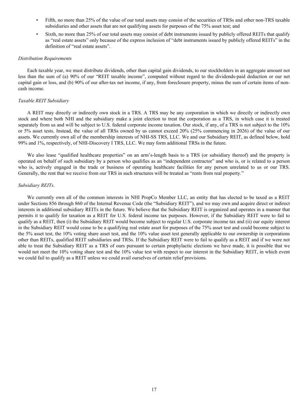 • Fifth, no more than 25% of the value of our total assets may consist of the securities of TRSs and other non-TRS taxable subsidiaries and other assets that are not qualifying assets for purposes of the 75% asset test; and • Sixth, no more than 25% of our total assets may consist of debt instruments issued by publicly offered REITs that qualify as “real estate assets” only because of the express inclusion of “debt instruments issued by publicly offered REITs” in the definition of “real estate assets”. Distribution Requirements Each taxable year, we must distribute dividends, other than capital gain dividends, to our stockholders in an aggregate amount not less than the sum of (a) 90% of our “REIT taxable income”, computed without regard to the dividends-paid deduction or our net capital gain or loss, and (b) 90% of our after-tax net income, if any, from foreclosure property, minus the sum of certain items of non- cash income. Taxable REIT Subsidiary A REIT may directly or indirectly own stock in a TRS. A TRS may be any corporation in which we directly or indirectly own stock and where both NHI and the subsidiary make a joint election to treat the corporation as a TRS, in which case it is treated separately from us and will be subject to U.S. federal corporate income taxation. Our stock, if any, of a TRS is not subject to the 10% or 5% asset tests. Instead, the value of all TRSs owned by us cannot exceed 20% (25% commencing in 2026) of the value of our assets. We currently own all of the membership interests of NHI-SS TRS, LLC. We and our Subsidiary REIT, as defined below, hold 99% and 1%, respectively, of NHI-Discovery I TRS, LLC. We may form additional TRSs in the future. We also lease “qualified healthcare properties” on an arm’s-length basis to a TRS (or subsidiary thereof) and the property is operated on behalf of such subsidiary by a person who qualifies as an “independent contractor” and who is, or is related to a person who is, actively engaged in the trade or business of operating healthcare facilities for any person unrelated to us or our TRS. Generally, the rent that we receive from our TRS in such structures will be treated as “rents from real property.” Subsidiary REITs. We currently own all of the common interests in NHI PropCo Member LLC, an entity that has elected to be taxed as a REIT under Sections 856 through 860 of the Internal Revenue Code (the “Subsidiary REIT”), and we may own and acquire direct or indirect interests in additional subsidiary REITs in the future. We believe that the Subsidiary REIT is organized and operates in a manner that permits it to qualify for taxation as a REIT for U.S. federal income tax purposes. However, if the Subsidiary REIT were to fail to qualify as a REIT, then (i) the Subsidiary REIT would become subject to regular U.S. corporate income tax and (ii) our equity interest in the Subsidiary REIT would cease to be a qualifying real estate asset for purposes of the 75% asset test and could become subject to the 5% asset test, the 10% voting share asset test, and the 10% value asset test generally applicable to our ownership in corporations other than REITs, qualified REIT subsidiaries and TRSs. If the Subsidiary REIT were to fail to qualify as a REIT and if we were not able to treat the Subsidiary REIT as a TRS of ours pursuant to certain prophylactic elections we have made, it is possible that we would not meet the 10% voting share test and the 10% value test with respect to our interest in the Subsidiary REIT, in which event we could fail to qualify as a REIT unless we could avail ourselves of certain relief provisions. 17