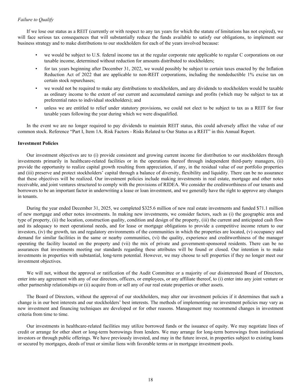 • we would be subject to U.S. federal income tax at the regular corporate rate applicable to regular C corporations on our taxable income, determined without reduction for amounts distributed to stockholders; • for tax years beginning after December 31, 2022, we would possibly be subject to certain taxes enacted by the Inflation Reduction Act of 2022 that are applicable to non-REIT corporations, including the nondeductible 1% excise tax on certain stock repurchases; • we would not be required to make any distributions to stockholders, and any dividends to stockholders would be taxable as ordinary income to the extent of our current and accumulated earnings and profits (which may be subject to tax at preferential rates to individual stockholders); and • unless we are entitled to relief under statutory provisions, we could not elect to be subject to tax as a REIT for four taxable years following the year during which we were disqualified. In the event we are no longer required to pay dividends to maintain REIT status, this could adversely affect the value of our common stock. Reference “Part I, Item 1A. Risk Factors - Risks Related to Our Status as a REIT” in this Annual Report. Investment Policies Our investment objectives are to (i) provide consistent and growing current income for distribution to our stockholders through investments primarily in healthcare-related facilities or in the operations thereof through independent third-party managers, (ii) provide the opportunity to realize capital growth resulting from appreciation, if any, in the residual value of our portfolio properties and (iii) preserve and protect stockholders’ capital through a balance of diversity, flexibility and liquidity. There can be no assurance that these objectives will be realized. Our investment policies include making investments in real estate, mortgage and other notes receivable, and joint ventures structured to comply with the provisions of RIDEA. We consider the creditworthiness of our tenants and borrowers to be an important factor in underwriting a lease or loan investment, and we generally have the right to approve any changes in tenants. During the year ended December 31, 2025, we completed $325.6 million of new real estate investments and funded $71.1 million of new mortgage and other notes investments. In making new investments, we consider factors, such as (i) the geographic area and type of property, (ii) the location, construction quality, condition and design of the property, (iii) the current and anticipated cash flow and its adequacy to meet operational needs, and for lease or mortgage obligations to provide a competitive income return to our investors, (iv) the growth, tax and regulatory environments of the communities in which the properties are located, (v) occupancy and demand for similar facilities in the same or nearby communities, (vi) the quality, experience and creditworthiness of the manager operating the facility located on the property and (vii) the mix of private and government-sponsored residents. There can be no assurances that investments meeting our standards regarding these attributes will be found or closed. Our intention is to make investments in properties with substantial, long-term potential. However, we may choose to sell properties if they no longer meet our investment objectives. We will not, without the approval or ratification of the Audit Committee or a majority of our disinterested Board of Directors, enter into any agreement with any of our directors, officers, or employees, or any affiliate thereof, to (i) enter into any joint venture or other partnership relationships or (ii) acquire from or sell any of our real estate properties or other assets. The Board of Directors, without the approval of our stockholders, may alter our investment policies if it determines that such a change is in our best interests and our stockholders’ best interests. The methods of implementing our investment policies may vary as new investment and financing techniques are developed or for other reasons. Management may recommend changes in investment criteria from time to time. Our investments in healthcare-related facilities may utilize borrowed funds or the issuance of equity. We may negotiate lines of credit or arrange for other short or long-term borrowings from lenders. We may arrange for long-term borrowings from institutional investors or through public offerings. We have previously invested, and may in the future invest, in properties subject to existing loans or secured by mortgages, deeds of trust or similar liens with favorable terms or in mortgage investment pools. Failure to Qualify If we lose our status as a REIT (currently or with respect to any tax years for which the statute of limitations has not expired), we will face serious tax consequences that will substantially reduce the funds available to satisfy our obligations, to implement our business strategy and to make distributions to our stockholders for each of the years involved because: 18