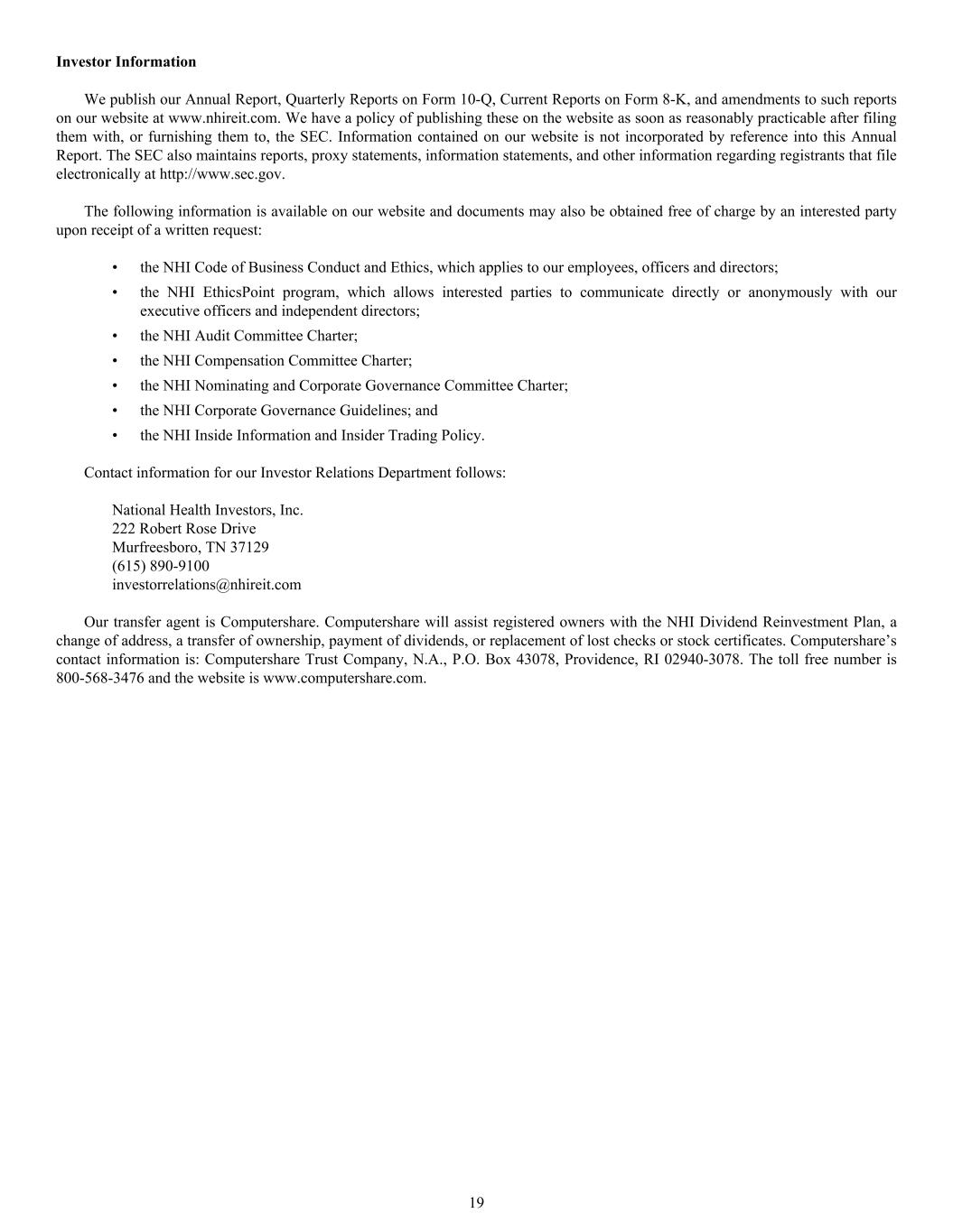 • the NHI Code of Business Conduct and Ethics, which applies to our employees, officers and directors; • the NHI EthicsPoint program, which allows interested parties to communicate directly or anonymously with our executive officers and independent directors; • the NHI Audit Committee Charter; • the NHI Compensation Committee Charter; • the NHI Nominating and Corporate Governance Committee Charter; • the NHI Corporate Governance Guidelines; and • the NHI Inside Information and Insider Trading Policy. Contact information for our Investor Relations Department follows: National Health Investors, Inc. 222 Robert Rose Drive Murfreesboro, TN 37129 (615) 890-9100 investorrelations@nhireit.com Our transfer agent is Computershare. Computershare will assist registered owners with the NHI Dividend Reinvestment Plan, a change of address, a transfer of ownership, payment of dividends, or replacement of lost checks or stock certificates. Computershare’s contact information is: Computershare Trust Company, N.A., P.O. Box 43078, Providence, RI 02940-3078. The toll free number is 800-568-3476 and the website is www.computershare.com. Investor Information We publish our Annual Report, Quarterly Reports on Form 10-Q, Current Reports on Form 8-K, and amendments to such reports on our website at www.nhireit.com. We have a policy of publishing these on the website as soon as reasonably practicable after filing them with, or furnishing them to, the SEC. Information contained on our website is not incorporated by reference into this Annual Report. The SEC also maintains reports, proxy statements, information statements, and other information regarding registrants that file electronically at http://www.sec.gov. The following information is available on our website and documents may also be obtained free of charge by an interested party upon receipt of a written request: 19