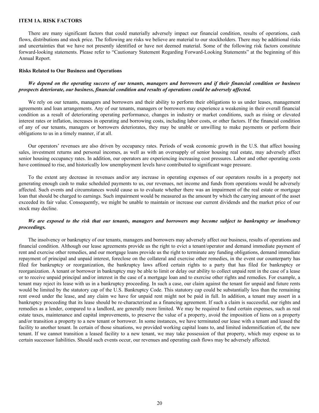 ITEM 1A. RISK FACTORS There are many significant factors that could materially adversely impact our financial condition, results of operations, cash flows, distributions and stock price. The following are risks we believe are material to our stockholders. There may be additional risks and uncertainties that we have not presently identified or have not deemed material. Some of the following risk factors constitute forward-looking statements. Please refer to “Cautionary Statement Regarding Forward-Looking Statements” at the beginning of this Annual Report. Risks Related to Our Business and Operations We depend on the operating success of our tenants, managers and borrowers and if their financial condition or business prospects deteriorate, our business, financial condition and results of operations could be adversely affected. We rely on our tenants, managers and borrowers and their ability to perform their obligations to us under leases, management agreements and loan arrangements. Any of our tenants, managers or borrowers may experience a weakening in their overall financial condition as a result of deteriorating operating performance, changes in industry or market conditions, such as rising or elevated interest rates or inflation, increases in operating and borrowing costs, including labor costs, or other factors. If the financial condition of any of our tenants, managers or borrowers deteriorates, they may be unable or unwilling to make payments or perform their obligations to us in a timely manner, if at all. Our operators’ revenues are also driven by occupancy rates. Periods of weak economic growth in the U.S. that affect housing sales, investment returns and personal incomes, as well as with an oversupply of senior housing real estate, may adversely affect senior housing occupancy rates. In addition, our operators are experiencing increasing cost pressures. Labor and other operating costs have continued to rise, and historically low unemployment levels have contributed to significant wage pressure. To the extent any decrease in revenues and/or any increase in operating expenses of our operators results in a property not generating enough cash to make scheduled payments to us, our revenues, net income and funds from operations would be adversely affected. Such events and circumstances would cause us to evaluate whether there was an impairment of the real estate or mortgage loan that should be charged to earnings. Such impairment would be measured as the amount by which the carrying amount of the asset exceeded its fair value. Consequently, we might be unable to maintain or increase our current dividends and the market price of our stock may decline. We are exposed to the risk that our tenants, managers and borrowers may become subject to bankruptcy or insolvency proceedings. The insolvency or bankruptcy of our tenants, managers and borrowers may adversely affect our business, results of operations and financial condition. Although our lease agreements provide us the right to evict a tenant/operator and demand immediate payment of rent and exercise other remedies, and our mortgage loans provide us the right to terminate any funding obligations, demand immediate repayment of principal and unpaid interest, foreclose on the collateral and exercise other remedies, in the event our counterparty has filed for bankruptcy or reorganization, the bankruptcy laws afford certain rights to a party that has filed for bankruptcy or reorganization. A tenant or borrower in bankruptcy may be able to limit or delay our ability to collect unpaid rent in the case of a lease or to receive unpaid principal and/or interest in the case of a mortgage loan and to exercise other rights and remedies. For example, a tenant may reject its lease with us in a bankruptcy proceeding. In such a case, our claim against the tenant for unpaid and future rents would be limited by the statutory cap of the U.S. Bankruptcy Code. This statutory cap could be substantially less than the remaining rent owed under the lease, and any claim we have for unpaid rent might not be paid in full. In addition, a tenant may assert in a bankruptcy proceeding that its lease should be re-characterized as a financing agreement. If such a claim is successful, our rights and remedies as a lender, compared to a landlord, are generally more limited. We may be required to fund certain expenses, such as real estate taxes, maintenance and capital improvements, to preserve the value of a property, avoid the imposition of liens on a property and/or transition a property to a new tenant or borrower. In some instances, we have terminated our lease with a tenant and leased the facility to another tenant. In certain of those situations, we provided working capital loans to, and limited indemnification of, the new tenant. If we cannot transition a leased facility to a new tenant, we may take possession of that property, which may expose us to certain successor liabilities. Should such events occur, our revenues and operating cash flows may be adversely affected. 20