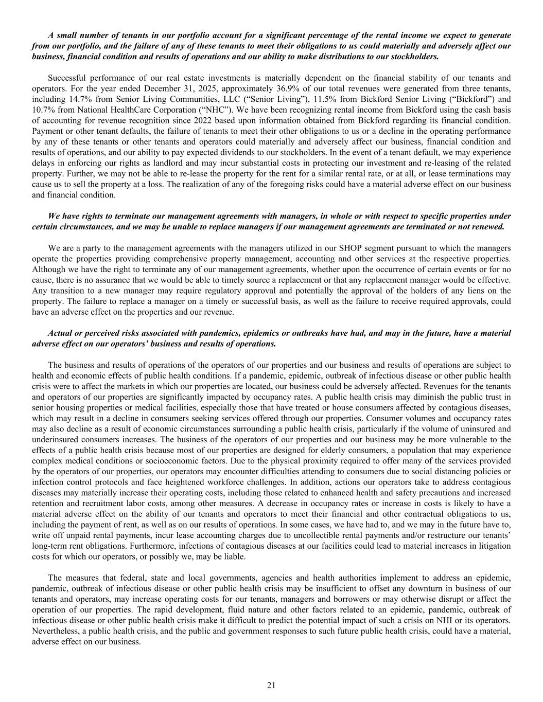 A small number of tenants in our portfolio account for a significant percentage of the rental income we expect to generate from our portfolio, and the failure of any of these tenants to meet their obligations to us could materially and adversely affect our business, financial condition and results of operations and our ability to make distributions to our stockholders. Successful performance of our real estate investments is materially dependent on the financial stability of our tenants and operators. For the year ended December 31, 2025, approximately 36.9% of our total revenues were generated from three tenants, including 14.7% from Senior Living Communities, LLC (“Senior Living”), 11.5% from Bickford Senior Living (“Bickford”) and 10.7% from National HealthCare Corporation (“NHC”). We have been recognizing rental income from Bickford using the cash basis of accounting for revenue recognition since 2022 based upon information obtained from Bickford regarding its financial condition. Payment or other tenant defaults, the failure of tenants to meet their other obligations to us or a decline in the operating performance by any of these tenants or other tenants and operators could materially and adversely affect our business, financial condition and results of operations, and our ability to pay expected dividends to our stockholders. In the event of a tenant default, we may experience delays in enforcing our rights as landlord and may incur substantial costs in protecting our investment and re-leasing of the related property. Further, we may not be able to re-lease the property for the rent for a similar rental rate, or at all, or lease terminations may cause us to sell the property at a loss. The realization of any of the foregoing risks could have a material adverse effect on our business and financial condition. We have rights to terminate our management agreements with managers, in whole or with respect to specific properties under certain circumstances, and we may be unable to replace managers if our management agreements are terminated or not renewed. We are a party to the management agreements with the managers utilized in our SHOP segment pursuant to which the managers operate the properties providing comprehensive property management, accounting and other services at the respective properties. Although we have the right to terminate any of our management agreements, whether upon the occurrence of certain events or for no cause, there is no assurance that we would be able to timely source a replacement or that any replacement manager would be effective. Any transition to a new manager may require regulatory approval and potentially the approval of the holders of any liens on the property. The failure to replace a manager on a timely or successful basis, as well as the failure to receive required approvals, could have an adverse effect on the properties and our revenue. Actual or perceived risks associated with pandemics, epidemics or outbreaks have had, and may in the future, have a material adverse effect on our operators’ business and results of operations. The business and results of operations of the operators of our properties and our business and results of operations are subject to health and economic effects of public health conditions. If a pandemic, epidemic, outbreak of infectious disease or other public health crisis were to affect the markets in which our properties are located, our business could be adversely affected. Revenues for the tenants and operators of our properties are significantly impacted by occupancy rates. A public health crisis may diminish the public trust in senior housing properties or medical facilities, especially those that have treated or house consumers affected by contagious diseases, which may result in a decline in consumers seeking services offered through our properties. Consumer volumes and occupancy rates may also decline as a result of economic circumstances surrounding a public health crisis, particularly if the volume of uninsured and underinsured consumers increases. The business of the operators of our properties and our business may be more vulnerable to the effects of a public health crisis because most of our properties are designed for elderly consumers, a population that may experience complex medical conditions or socioeconomic factors. Due to the physical proximity required to offer many of the services provided by the operators of our properties, our operators may encounter difficulties attending to consumers due to social distancing policies or infection control protocols and face heightened workforce challenges. In addition, actions our operators take to address contagious diseases may materially increase their operating costs, including those related to enhanced health and safety precautions and increased retention and recruitment labor costs, among other measures. A decrease in occupancy rates or increase in costs is likely to have a material adverse effect on the ability of our tenants and operators to meet their financial and other contractual obligations to us, including the payment of rent, as well as on our results of operations. In some cases, we have had to, and we may in the future have to, write off unpaid rental payments, incur lease accounting charges due to uncollectible rental payments and/or restructure our tenants’ long-term rent obligations. Furthermore, infections of contagious diseases at our facilities could lead to material increases in litigation costs for which our operators, or possibly we, may be liable. The measures that federal, state and local governments, agencies and health authorities implement to address an epidemic, pandemic, outbreak of infectious disease or other public health crisis may be insufficient to offset any downturn in business of our tenants and operators, may increase operating costs for our tenants, managers and borrowers or may otherwise disrupt or affect th