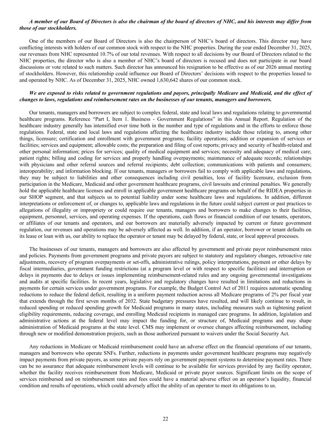A member of our Board of Directors is also the chairman of the board of directors of NHC, and his interests may differ from those of our stockholders. One of the members of our Board of Directors is also the chairperson of NHC’s board of directors. This director may have conflicting interests with holders of our common stock with respect to the NHC properties. During the year ended December 31, 2025, our revenues from NHC represented 10.7% of our total revenues. With respect to all decisions by our Board of Directors related to the NHC properties, the director who is also a member of NHC’s board of directors is recused and does not participate in our board discussions or vote related to such matters. Such director has announced his resignation to be effective as of our 2026 annual meeting of stockholders. However, this relationship could influence our Board of Directors’ decisions with respect to the properties leased to and operated by NHC. As of December 31, 2025, NHC owned 1,630,642 shares of our common stock. We are exposed to risks related to government regulations and payors, principally Medicare and Medicaid, and the effect of changes to laws, regulations and reimbursement rates on the businesses of our tenants, managers and borrowers. Our tenants, managers and borrowers are subject to complex federal, state and local laws and regulations relating to governmental healthcare programs. Reference “Part I, Item 1. Business - Government Regulations” in this Annual Report. Regulation of the healthcare industry generally has intensified over time both in the number and type of regulations and in the efforts to enforce those regulations. Federal, state and local laws and regulations affecting the healthcare industry include those relating to, among other things, licensure; certification and enrollment with government programs; facility operations; addition or expansion of services or facilities; services and equipment; allowable costs; the preparation and filing of cost reports; privacy and security of health-related and other personal information; prices for services; quality of medical equipment and services; necessity and adequacy of medical care; patient rights; billing and coding for services and properly handling overpayments; maintenance of adequate records; relationships with physicians and other referral sources and referral recipients; debt collection; communications with patients and consumers; interoperability; and information blocking. If our tenants, managers or borrowers fail to comply with applicable laws and regulations, they may be subject to liabilities and other consequences including civil penalties, loss of facility licensure, exclusion from participation in the Medicare, Medicaid and other government healthcare programs, civil lawsuits and criminal penalties. We generally hold the applicable healthcare licenses and enroll in applicable government healthcare programs on behalf of the RIDEA properties in our SHOP segment, and that subjects us to potential liability under some healthcare laws and regulations. In addition, different interpretations or enforcement of, or changes to, applicable laws and regulations in the future could subject current or past practices to allegations of illegality or impropriety or could require our tenants, managers and borrowers to make changes to their facilities, equipment, personnel, services, and operating expenses. If the operations, cash flows or financial condition of our tenants, operators, or affiliates of our tenants and operators, and our borrowers are materially adversely impacted by current or future government regulation, our revenues and operations may be adversely affected as well. In addition, if an operator, borrower or tenant defaults on its lease or loan with us, our ability to replace the operator or tenant may be delayed by federal, state, or local approval processes. The businesses of our tenants, managers and borrowers are also affected by government and private payor reimbursement rates and policies. Payments from government programs and private payors are subject to statutory and regulatory changes, retroactive rate adjustments, recovery of program overpayments or set-offs, administrative rulings, policy interpretations, payment or other delays by fiscal intermediaries, government funding restrictions (at a program level or with respect to specific facilities) and interruption or delays in payments due to delays or issues implementing reimbursement-related rules and any ongoing governmental investigations and audits at specific facilities. In recent years, legislative and regulatory changes have resulted in limitations and reductions in payments for certain services under government programs. For example, the Budget Control Act of 2011 requires automatic spending reductions to reduce the federal deficit, resulting in a uniform payment reduction across all Medicare programs of 2% per fiscal year that extends through the first seven months of 2032. State budgetary pressures have resulted, and will likely continue to result, in reduced spending or reduced spending growth for Medicaid programs in many states, including measures such as tightening patient eligibility requirements, reducing coverage, and enrolling Medicaid recipients in managed care programs. In addition, legislation and administrative actions at the federal level may impact the funding for, or structure of, Medicaid programs and may shape administration of Medicaid programs at the state level. CMS may implement or oversee changes affecting reimbursement, including through new or modified demonstration projects, such as those authorized pursuant to waivers under the Social Security Act. Any reductions in Medicare or Medicaid reimbursement could have an adverse effect on the financial operations of our tenants, managers and borrowers who operate SNFs. Further, reductions in payments under government healthcare programs may negatively impact p