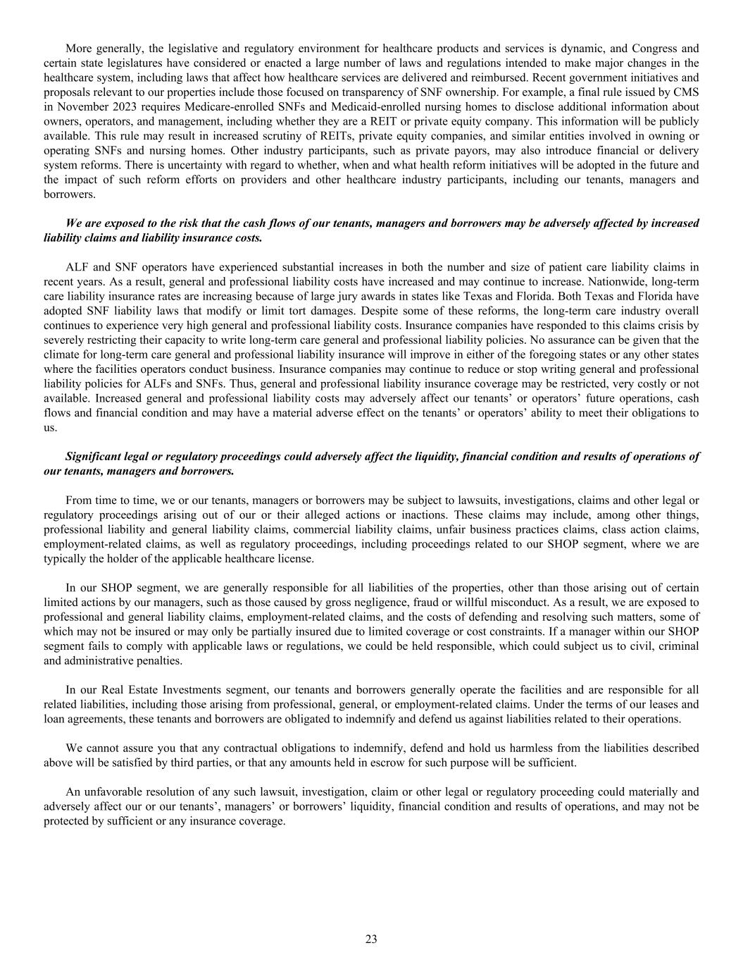 More generally, the legislative and regulatory environment for healthcare products and services is dynamic, and Congress and certain state legislatures have considered or enacted a large number of laws and regulations intended to make major changes in the healthcare system, including laws that affect how healthcare services are delivered and reimbursed. Recent government initiatives and proposals relevant to our properties include those focused on transparency of SNF ownership. For example, a final rule issued by CMS in November 2023 requires Medicare-enrolled SNFs and Medicaid-enrolled nursing homes to disclose additional information about owners, operators, and management, including whether they are a REIT or private equity company. This information will be publicly available. This rule may result in increased scrutiny of REITs, private equity companies, and similar entities involved in owning or operating SNFs and nursing homes. Other industry participants, such as private payors, may also introduce financial or delivery system reforms. There is uncertainty with regard to whether, when and what health reform initiatives will be adopted in the future and the impact of such reform efforts on providers and other healthcare industry participants, including our tenants, managers and borrowers. We are exposed to the risk that the cash flows of our tenants, managers and borrowers may be adversely affected by increased liability claims and liability insurance costs. ALF and SNF operators have experienced substantial increases in both the number and size of patient care liability claims in recent years. As a result, general and professional liability costs have increased and may continue to increase. Nationwide, long-term care liability insurance rates are increasing because of large jury awards in states like Texas and Florida. Both Texas and Florida have adopted SNF liability laws that modify or limit tort damages. Despite some of these reforms, the long-term care industry overall continues to experience very high general and professional liability costs. Insurance companies have responded to this claims crisis by severely restricting their capacity to write long-term care general and professional liability policies. No assurance can be given that the climate for long-term care general and professional liability insurance will improve in either of the foregoing states or any other states where the facilities operators conduct business. Insurance companies may continue to reduce or stop writing general and professional liability policies for ALFs and SNFs. Thus, general and professional liability insurance coverage may be restricted, very costly or not available. Increased general and professional liability costs may adversely affect our tenants’ or operators’ future operations, cash flows and financial condition and may have a material adverse effect on the tenants’ or operators’ ability to meet their obligations to us. Significant legal or regulatory proceedings could adversely affect the liquidity, financial condition and results of operations of our tenants, managers and borrowers. From time to time, we or our tenants, managers or borrowers may be subject to lawsuits, investigations, claims and other legal or regulatory proceedings arising out of our or their alleged actions or inactions. These claims may include, among other things, professional liability and general liability claims, commercial liability claims, unfair business practices claims, class action claims, employment-related claims, as well as regulatory proceedings, including proceedings related to our SHOP segment, where we are typically the holder of the applicable healthcare license. In our SHOP segment, we are generally responsible for all liabilities of the properties, other than those arising out of certain limited actions by our managers, such as those caused by gross negligence, fraud or willful misconduct. As a result, we are exposed to professional and general liability claims, employment-related claims, and the costs of defending and resolving such matters, some of which may not be insured or may only be partially insured due to limited coverage or cost constraints. If a manager within our SHOP segment fails to comply with applicable laws or regulations, we could be held responsible, which could subject us to civil, criminal and administrative penalties. In our Real Estate Investments segment, our tenants and borrowers generally operate the facilities and are responsible for all related liabilities, including those arising from professional, general, or employment-related claims. Under the terms of our leases and loan agreements, these tenants and borrowers are obligated to indemnify and defend us against liabilities related to their operations. We cannot assure you that any contractual obligations to indemnify, defend and hold us harmless from the liabilities described above will be satisfied by third parties, or that any amounts held in escrow for such purpose will be sufficient. An unfavorable resolution of any such lawsuit, investigation, claim or other legal or regulatory proceeding could materially and adversely affect our or our tenants’, managers’ or borrowers’ liquidity, financial condition and results of operations, and may not be protected by sufficient or any insurance coverage. 23