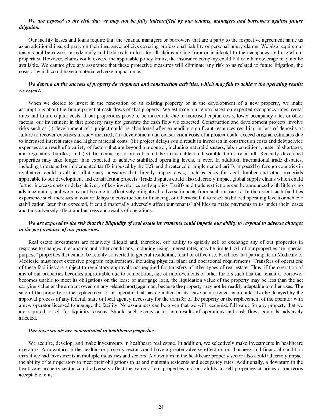 We are exposed to the risk that we may not be fully indemnified by our tenants, managers and borrowers against future litigation. Our facility leases and loans require that the tenants, managers or borrowers that are a party to the respective agreement name us as an additional insured party on their insurance policies covering professional liability or personal injury claims. We also require our tenants and borrowers to indemnify and hold us harmless for all claims arising from or incidental to the occupancy and use of our properties. However, claims could exceed the applicable policy limits, the insurance company could fail or other coverage may not be available. We cannot give any assurance that these protective measures will eliminate any risk to us related to future litigation, the costs of which could have a material adverse impact on us. We depend on the success of property development and construction activities, which may fail to achieve the operating results we expect. When we decide to invest in the renovation of an existing property or in the development of a new property, we make assumptions about the future potential cash flows of that property. We estimate our return based on expected occupancy rates, rental rates and future capital costs. If our projections prove to be inaccurate due to increased capital costs, lower occupancy rates or other factors, our investment in that property may not generate the cash flow we expected. Construction and development projects involve risks such as (i) development of a project could be abandoned after expending significant resources resulting in loss of deposits or failure to recover expenses already incurred; (ii) development and construction costs of a project could exceed original estimates due to increased interest rates and higher material costs; (iii) project delays could result in increases in construction costs and debt service expenses as a result of a variety of factors that are beyond our control, including natural disasters, labor conditions, material shortages, and regulatory hurdles; and (iv) financing for a project could be unavailable on favorable terms or at all. Recently developed properties may take longer than expected to achieve stabilized operating levels, if ever. In addition, international trade disputes, including threatened or implemented tariffs imposed by the U.S. and threatened or implemented tariffs imposed by foreign countries in retaliation, could result in inflationary pressures that directly impact costs, such as costs for steel, lumber and other materials applicable to our development and construction projects. Trade disputes could also adversely impact global supply chains which could further increase costs or delay delivery of key inventories and supplies. Tariffs and trade restrictions can be announced with little or no advance notice, and we may not be able to effectively mitigate all adverse impacts from such measures. To the extent such facilities experience such increases in cost or delays in construction or financing, or otherwise fail to reach stabilized operating levels or achieve stabilization later than expected, it could materially adversely affect our tenants’ abilities to make payments to us under their leases and thus adversely affect our business and results of operations. We are exposed to the risk that the illiquidity of real estate investments could impede our ability to respond to adverse changes in the performance of our properties. Real estate investments are relatively illiquid and, therefore, our ability to quickly sell or exchange any of our properties in response to changes in economic and other conditions, including rising interest rates, may be limited. All of our properties are "special purpose" properties that cannot be readily converted to general residential, retail or office use. Facilities that participate in Medicare or Medicaid must meet extensive program requirements, including physical plant and operational requirements. Transfers of operations of these facilities are subject to regulatory approvals not required for transfers of other types of real estate. Thus, if the operation of any of our properties becomes unprofitable due to competition, age of improvements or other factors such that our tenant or borrower becomes unable to meet its obligations on the lease or mortgage loan, the liquidation value of the property may be less than the net carrying value or the amount owed on any related mortgage loan, because the property may not be readily adaptable to other uses. The sale of the property or the replacement of an operator that has defaulted on its lease or mortgage loan could also be delayed by the approval process of any federal, state or local agency necessary for the transfer of the property or the replacement of the operator with a new operator licensed to manage the facility. No assurances can be given that we will recognize full value for any property that we are required to sell for liquidity reasons. Should such events occur, our results of operations and cash flows could be adversely affected. Our investments are concentrated in healthcare properties. We acquire, develop, and make investments in healthcare real estate. In addition, we selectively make investments in healthcare operators. A downturn in the healthcare property sector could have a greater adverse effect on our business and financial condition than if we had investments in multiple industries and sectors. A downturn in the healthcare property sector also could adversely impact the ability of our operators to meet their obligations to us and maintain residents and occupancy rates. Additionally, a downturn in the healthcare property sector could adversely affect the value of our properties and our ability to sell properties at prices or on terms acceptable to us. 24