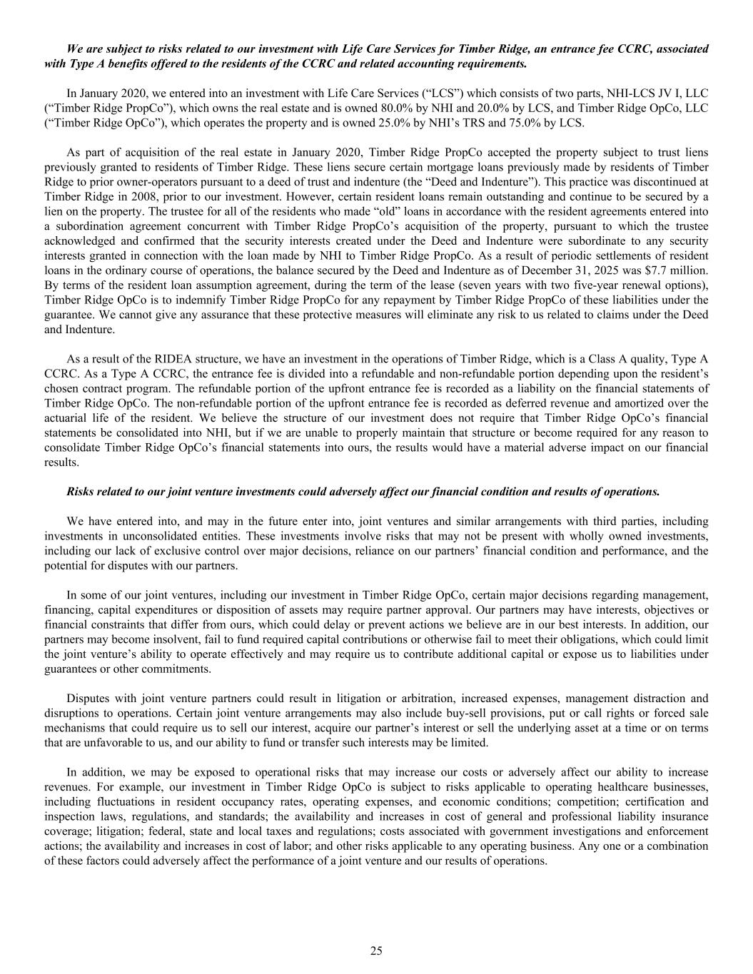 We are subject to risks related to our investment with Life Care Services for Timber Ridge, an entrance fee CCRC, associated with Type A benefits offered to the residents of the CCRC and related accounting requirements. In January 2020, we entered into an investment with Life Care Services (“LCS”) which consists of two parts, NHI-LCS JV I, LLC (“Timber Ridge PropCo”), which owns the real estate and is owned 80.0% by NHI and 20.0% by LCS, and Timber Ridge OpCo, LLC (“Timber Ridge OpCo”), which operates the property and is owned 25.0% by NHI’s TRS and 75.0% by LCS. As part of acquisition of the real estate in January 2020, Timber Ridge PropCo accepted the property subject to trust liens previously granted to residents of Timber Ridge. These liens secure certain mortgage loans previously made by residents of Timber Ridge to prior owner-operators pursuant to a deed of trust and indenture (the “Deed and Indenture”). This practice was discontinued at Timber Ridge in 2008, prior to our investment. However, certain resident loans remain outstanding and continue to be secured by a lien on the property. The trustee for all of the residents who made “old” loans in accordance with the resident agreements entered into a subordination agreement concurrent with Timber Ridge PropCo’s acquisition of the property, pursuant to which the trustee acknowledged and confirmed that the security interests created under the Deed and Indenture were subordinate to any security interests granted in connection with the loan made by NHI to Timber Ridge PropCo. As a result of periodic settlements of resident loans in the ordinary course of operations, the balance secured by the Deed and Indenture as of December 31, 2025 was $7.7 million. By terms of the resident loan assumption agreement, during the term of the lease (seven years with two five-year renewal options), Timber Ridge OpCo is to indemnify Timber Ridge PropCo for any repayment by Timber Ridge PropCo of these liabilities under the guarantee. We cannot give any assurance that these protective measures will eliminate any risk to us related to claims under the Deed and Indenture. As a result of the RIDEA structure, we have an investment in the operations of Timber Ridge, which is a Class A quality, Type A CCRC. As a Type A CCRC, the entrance fee is divided into a refundable and non-refundable portion depending upon the resident’s chosen contract program. The refundable portion of the upfront entrance fee is recorded as a liability on the financial statements of Timber Ridge OpCo. The non-refundable portion of the upfront entrance fee is recorded as deferred revenue and amortized over the actuarial life of the resident. We believe the structure of our investment does not require that Timber Ridge OpCo’s financial statements be consolidated into NHI, but if we are unable to properly maintain that structure or become required for any reason to consolidate Timber Ridge OpCo’s financial statements into ours, the results would have a material adverse impact on our financial results. Risks related to our joint venture investments could adversely affect our financial condition and results of operations. We have entered into, and may in the future enter into, joint ventures and similar arrangements with third parties, including investments in unconsolidated entities. These investments involve risks that may not be present with wholly owned investments, including our lack of exclusive control over major decisions, reliance on our partners’ financial condition and performance, and the potential for disputes with our partners. In some of our joint ventures, including our investment in Timber Ridge OpCo, certain major decisions regarding management, financing, capital expenditures or disposition of assets may require partner approval. Our partners may have interests, objectives or financial constraints that differ from ours, which could delay or prevent actions we believe are in our best interests. In addition, our partners may become insolvent, fail to fund required capital contributions or otherwise fail to meet their obligations, which could limit the joint venture’s ability to operate effectively and may require us to contribute additional capital or expose us to liabilities under guarantees or other commitments. Disputes with joint venture partners could result in litigation or arbitration, increased expenses, management distraction and disruptions to operations. Certain joint venture arrangements may also include buy-sell provisions, put or call rights or forced sale mechanisms that could require us to sell our interest, acquire our partner’s interest or sell the underlying asset at a time or on terms that are unfavorable to us, and our ability to fund or transfer such interests may be limited. In addition, we may be exposed to operational risks that may increase our costs or adversely affect our ability to increase revenues. For example, our investment in Timber Ridge OpCo is subject to risks applicable to operating healthcare businesses, including fluctuations in resident occupancy rates, operating expenses, and economic conditions; competition; certification and inspection laws, regulations, and standards; the availability and increases in cost of general and professional liability insurance coverage; litigation; federal, state and local taxes and regulations; costs associated with government investigations and enforcement actions; the availability and increases in cost of labor; and other risks applicable to any operating business. Any one or a combination of these factors could adversely affect the performance of a joint venture and our results of operations. 25