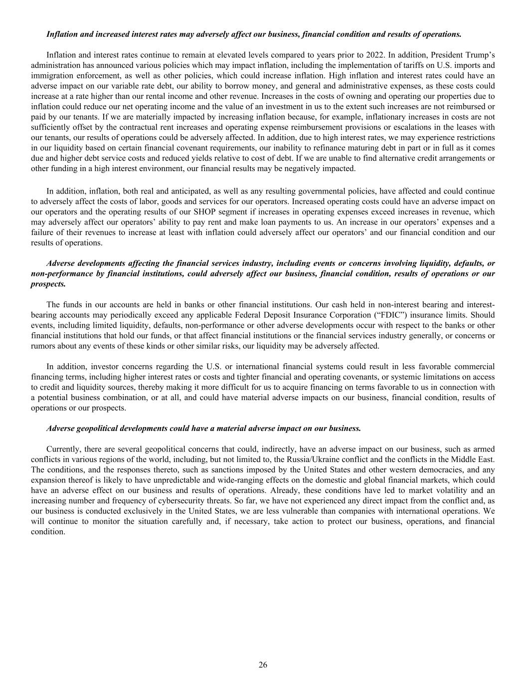 Inflation and increased interest rates may adversely affect our business, financial condition and results of operations. Inflation and interest rates continue to remain at elevated levels compared to years prior to 2022. In addition, President Trump’s administration has announced various policies which may impact inflation, including the implementation of tariffs on U.S. imports and immigration enforcement, as well as other policies, which could increase inflation. High inflation and interest rates could have an adverse impact on our variable rate debt, our ability to borrow money, and general and administrative expenses, as these costs could increase at a rate higher than our rental income and other revenue. Increases in the costs of owning and operating our properties due to inflation could reduce our net operating income and the value of an investment in us to the extent such increases are not reimbursed or paid by our tenants. If we are materially impacted by increasing inflation because, for example, inflationary increases in costs are not sufficiently offset by the contractual rent increases and operating expense reimbursement provisions or escalations in the leases with our tenants, our results of operations could be adversely affected. In addition, due to high interest rates, we may experience restrictions in our liquidity based on certain financial covenant requirements, our inability to refinance maturing debt in part or in full as it comes due and higher debt service costs and reduced yields relative to cost of debt. If we are unable to find alternative credit arrangements or other funding in a high interest environment, our financial results may be negatively impacted. In addition, inflation, both real and anticipated, as well as any resulting governmental policies, have affected and could continue to adversely affect the costs of labor, goods and services for our operators. Increased operating costs could have an adverse impact on our operators and the operating results of our SHOP segment if increases in operating expenses exceed increases in revenue, which may adversely affect our operators’ ability to pay rent and make loan payments to us. An increase in our operators’ expenses and a failure of their revenues to increase at least with inflation could adversely affect our operators’ and our financial condition and our results of operations. Adverse developments affecting the financial services industry, including events or concerns involving liquidity, defaults, or non-performance by financial institutions, could adversely affect our business, financial condition, results of operations or our prospects. The funds in our accounts are held in banks or other financial institutions. Our cash held in non-interest bearing and interest- bearing accounts may periodically exceed any applicable Federal Deposit Insurance Corporation (“FDIC”) insurance limits. Should events, including limited liquidity, defaults, non-performance or other adverse developments occur with respect to the banks or other financial institutions that hold our funds, or that affect financial institutions or the financial services industry generally, or concerns or rumors about any events of these kinds or other similar risks, our liquidity may be adversely affected. In addition, investor concerns regarding the U.S. or international financial systems could result in less favorable commercial financing terms, including higher interest rates or costs and tighter financial and operating covenants, or systemic limitations on access to credit and liquidity sources, thereby making it more difficult for us to acquire financing on terms favorable to us in connection with a potential business combination, or at all, and could have material adverse impacts on our business, financial condition, results of operations or our prospects. Adverse geopolitical developments could have a material adverse impact on our business. Currently, there are several geopolitical concerns that could, indirectly, have an adverse impact on our business, such as armed conflicts in various regions of the world, including, but not limited to, the Russia/Ukraine conflict and the conflicts in the Middle East. The conditions, and the responses thereto, such as sanctions imposed by the United States and other western democracies, and any expansion thereof is likely to have unpredictable and wide-ranging effects on the domestic and global financial markets, which could have an adverse effect on our business and results of operations. Already, these conditions have led to market volatility and an increasing number and frequency of cybersecurity threats. So far, we have not experienced any direct impact from the conflict and, as our business is conducted exclusively in the United States, we are less vulnerable than companies with international operations. We will continue to monitor the situation carefully and, if necessary, take action to protect our business, operations, and financial condition. 26