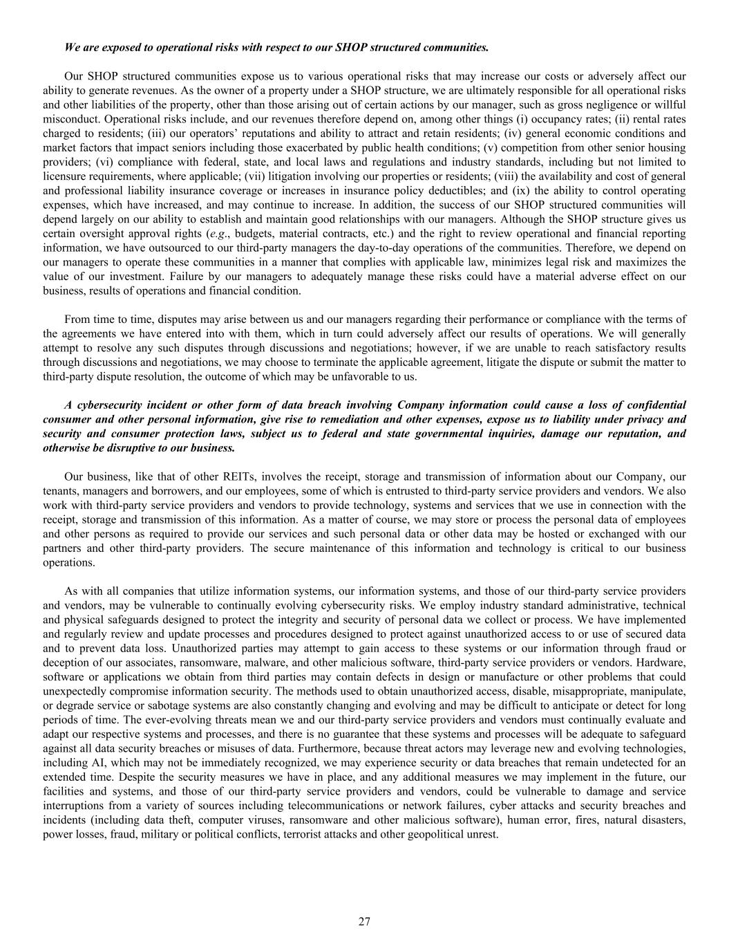 We are exposed to operational risks with respect to our SHOP structured communities. Our SHOP structured communities expose us to various operational risks that may increase our costs or adversely affect our ability to generate revenues. As the owner of a property under a SHOP structure, we are ultimately responsible for all operational risks and other liabilities of the property, other than those arising out of certain actions by our manager, such as gross negligence or willful misconduct. Operational risks include, and our revenues therefore depend on, among other things (i) occupancy rates; (ii) rental rates charged to residents; (iii) our operators’ reputations and ability to attract and retain residents; (iv) general economic conditions and market factors that impact seniors including those exacerbated by public health conditions; (v) competition from other senior housing providers; (vi) compliance with federal, state, and local laws and regulations and industry standards, including but not limited to licensure requirements, where applicable; (vii) litigation involving our properties or residents; (viii) the availability and cost of general and professional liability insurance coverage or increases in insurance policy deductibles; and (ix) the ability to control operating expenses, which have increased, and may continue to increase. In addition, the success of our SHOP structured communities will depend largely on our ability to establish and maintain good relationships with our managers. Although the SHOP structure gives us certain oversight approval rights (e.g., budgets, material contracts, etc.) and the right to review operational and financial reporting information, we have outsourced to our third-party managers the day-to-day operations of the communities. Therefore, we depend on our managers to operate these communities in a manner that complies with applicable law, minimizes legal risk and maximizes the value of our investment. Failure by our managers to adequately manage these risks could have a material adverse effect on our business, results of operations and financial condition. From time to time, disputes may arise between us and our managers regarding their performance or compliance with the terms of the agreements we have entered into with them, which in turn could adversely affect our results of operations. We will generally attempt to resolve any such disputes through discussions and negotiations; however, if we are unable to reach satisfactory results through discussions and negotiations, we may choose to terminate the applicable agreement, litigate the dispute or submit the matter to third-party dispute resolution, the outcome of which may be unfavorable to us. A cybersecurity incident or other form of data breach involving Company information could cause a loss of confidential consumer and other personal information, give rise to remediation and other expenses, expose us to liability under privacy and security and consumer protection laws, subject us to federal and state governmental inquiries, damage our reputation, and otherwise be disruptive to our business. Our business, like that of other REITs, involves the receipt, storage and transmission of information about our Company, our tenants, managers and borrowers, and our employees, some of which is entrusted to third-party service providers and vendors. We also work with third-party service providers and vendors to provide technology, systems and services that we use in connection with the receipt, storage and transmission of this information. As a matter of course, we may store or process the personal data of employees and other persons as required to provide our services and such personal data or other data may be hosted or exchanged with our partners and other third-party providers. The secure maintenance of this information and technology is critical to our business operations. As with all companies that utilize information systems, our information systems, and those of our third-party service providers and vendors, may be vulnerable to continually evolving cybersecurity risks. We employ industry standard administrative, technical and physical safeguards designed to protect the integrity and security of personal data we collect or process. We have implemented and regularly review and update processes and procedures designed to protect against unauthorized access to or use of secured data and to prevent data loss. Unauthorized parties may attempt to gain access to these systems or our information through fraud or deception of our associates, ransomware, malware, and other malicious software, third-party service providers or vendors. Hardware, software or applications we obtain from third parties may contain defects in design or manufacture or other problems that could unexpectedly compromise information security. The methods used to obtain unauthorized access, disable, misappropriate, manipulate, or degrade service or sabotage systems are also constantly changing and evolving and may be difficult to anticipate or detect for long periods of time. The ever-evolving threats mean we and our third-party service providers and vendors must continually evaluate and adapt our respective systems and processes, and there is no guarantee that these systems and processes will be adequate to safeguard against all data security breaches or misuses of data. Furthermore, because threat actors may leverage new and evolving technologies, including AI, which may not be immediately recognized, we may experience security or data breaches that remain undetected for an extended time. Despite the security measures we have in place, and any additional measures we may implement in the future, our facilities and systems, and those of our third-party service providers and vendors, could be vulnerable to damage and service interruptions from a variety of sources including telecommunications or network failures, cyber attacks and secur