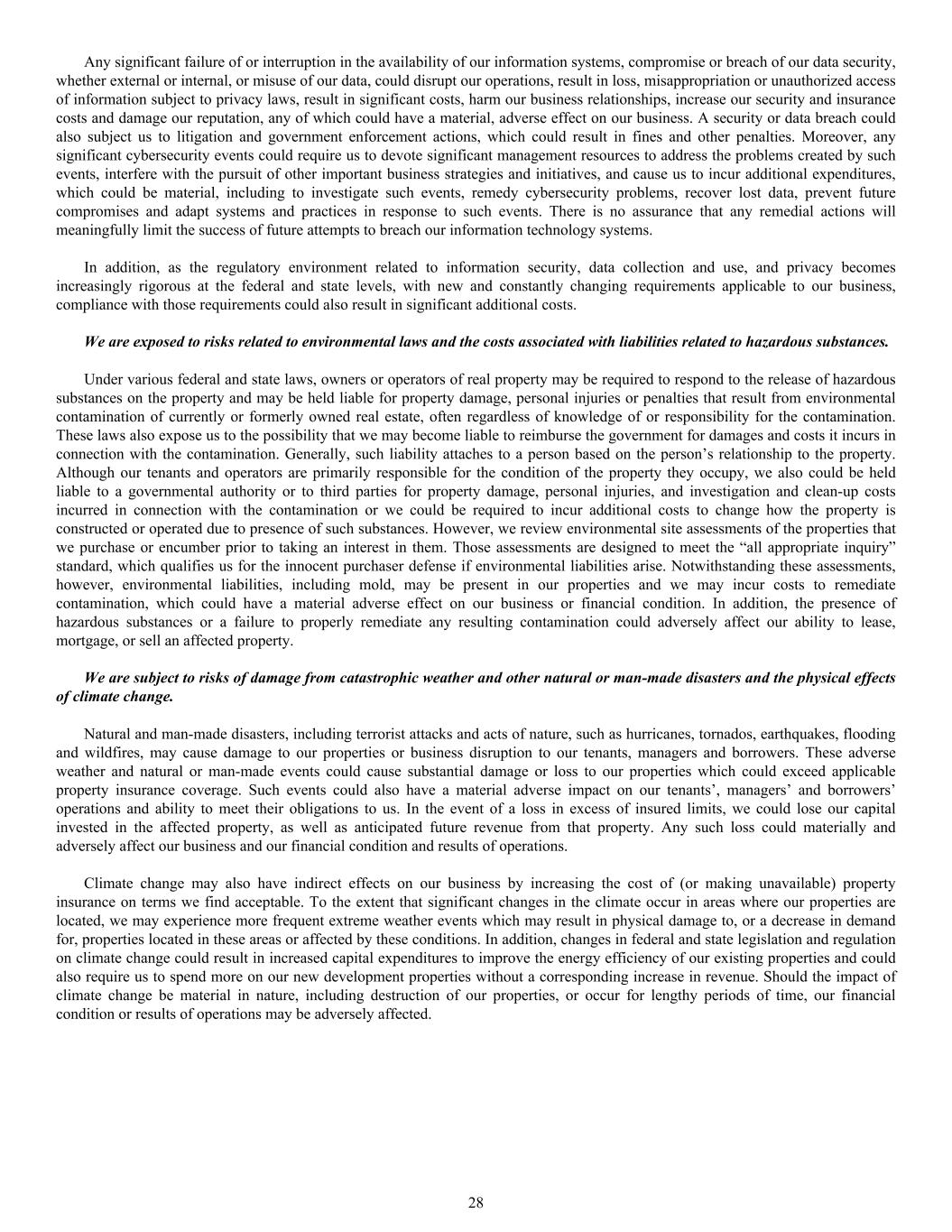 Any significant failure of or interruption in the availability of our information systems, compromise or breach of our data security, whether external or internal, or misuse of our data, could disrupt our operations, result in loss, misappropriation or unauthorized access of information subject to privacy laws, result in significant costs, harm our business relationships, increase our security and insurance costs and damage our reputation, any of which could have a material, adverse effect on our business. A security or data breach could also subject us to litigation and government enforcement actions, which could result in fines and other penalties. Moreover, any significant cybersecurity events could require us to devote significant management resources to address the problems created by such events, interfere with the pursuit of other important business strategies and initiatives, and cause us to incur additional expenditures, which could be material, including to investigate such events, remedy cybersecurity problems, recover lost data, prevent future compromises and adapt systems and practices in response to such events. There is no assurance that any remedial actions will meaningfully limit the success of future attempts to breach our information technology systems. In addition, as the regulatory environment related to information security, data collection and use, and privacy becomes increasingly rigorous at the federal and state levels, with new and constantly changing requirements applicable to our business, compliance with those requirements could also result in significant additional costs. We are exposed to risks related to environmental laws and the costs associated with liabilities related to hazardous substances. Under various federal and state laws, owners or operators of real property may be required to respond to the release of hazardous substances on the property and may be held liable for property damage, personal injuries or penalties that result from environmental contamination of currently or formerly owned real estate, often regardless of knowledge of or responsibility for the contamination. These laws also expose us to the possibility that we may become liable to reimburse the government for damages and costs it incurs in connection with the contamination. Generally, such liability attaches to a person based on the person’s relationship to the property. Although our tenants and operators are primarily responsible for the condition of the property they occupy, we also could be held liable to a governmental authority or to third parties for property damage, personal injuries, and investigation and clean-up costs incurred in connection with the contamination or we could be required to incur additional costs to change how the property is constructed or operated due to presence of such substances. However, we review environmental site assessments of the properties that we purchase or encumber prior to taking an interest in them. Those assessments are designed to meet the “all appropriate inquiry” standard, which qualifies us for the innocent purchaser defense if environmental liabilities arise. Notwithstanding these assessments, however, environmental liabilities, including mold, may be present in our properties and we may incur costs to remediate contamination, which could have a material adverse effect on our business or financial condition. In addition, the presence of hazardous substances or a failure to properly remediate any resulting contamination could adversely affect our ability to lease, mortgage, or sell an affected property. We are subject to risks of damage from catastrophic weather and other natural or man-made disasters and the physical effects of climate change. Natural and man-made disasters, including terrorist attacks and acts of nature, such as hurricanes, tornados, earthquakes, flooding and wildfires, may cause damage to our properties or business disruption to our tenants, managers and borrowers. These adverse weather and natural or man-made events could cause substantial damage or loss to our properties which could exceed applicable property insurance coverage. Such events could also have a material adverse impact on our tenants’, managers’ and borrowers’ operations and ability to meet their obligations to us. In the event of a loss in excess of insured limits, we could lose our capital invested in the affected property, as well as anticipated future revenue from that property. Any such loss could materially and adversely affect our business and our financial condition and results of operations. Climate change may also have indirect effects on our business by increasing the cost of (or making unavailable) property insurance on terms we find acceptable. To the extent that significant changes in the climate occur in areas where our properties are located, we may experience more frequent extreme weather events which may result in physical damage to, or a decrease in demand for, properties located in these areas or affected by these conditions. In addition, changes in federal and state legislation and regulation on climate change could result in increased capital expenditures to improve the energy efficiency of our existing properties and could also require us to spend more on our new development properties without a corresponding increase in revenue. Should the impact of climate change be material in nature, including destruction of our properties, or occur for lengthy periods of time, our financial condition or results of operations may be adversely affected. 28