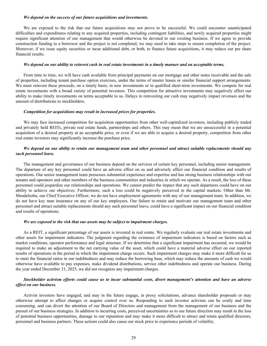 We depend on the success of our future acquisitions and investments. We are exposed to the risk that our future acquisitions may not prove to be successful. We could encounter unanticipated difficulties and expenditures relating to any acquired properties, including contingent liabilities, and newly acquired properties might require significant attention of our management that would otherwise be devoted to our existing business. If we agree to provide construction funding to a borrower and the project is not completed, we may need to take steps to ensure completion of the project. Moreover, if we issue equity securities or incur additional debt, or both, to finance future acquisitions, it may reduce our per share financial results. We depend on our ability to reinvest cash in real estate investments in a timely manner and on acceptable terms. From time to time, we will have cash available from principal payments on our mortgage and other notes receivable and the sale of properties, including tenant purchase option exercises, under the terms of master leases or similar financial support arrangements. We must reinvest these proceeds, on a timely basis, in new investments or in qualified short-term investments. We compete for real estate investments with a broad variety of potential investors. This competition for attractive investments may negatively affect our ability to make timely investments on terms acceptable to us. Delays in reinvesting our cash may negatively impact revenues and the amount of distributions to stockholders. Competition for acquisitions may result in increased prices for properties. We may face increased competition for acquisition opportunities from other well-capitalized investors, including publicly traded and privately held REITs, private real estate funds, partnerships and others. This may mean that we are unsuccessful in a potential acquisition of a desired property at an acceptable price, or even if we are able to acquire a desired property, competition from other real estate investors may significantly increase the purchase price. We depend on our ability to retain our management team and other personnel and attract suitable replacements should any such personnel leave. The management and governance of our business depend on the services of certain key personnel, including senior management. The departure of any key personnel could have an adverse effect on us and adversely affect our financial condition and results of operations. Our senior management team possesses substantial experience and expertise and has strong business relationships with our tenants and operators and other members of the business communities and industries in which we operate. As a result, the loss of these personnel could jeopardize our relationships and operations. We cannot predict the impact that any such departures could have on our ability to achieve our objectives. Furthermore, such a loss could be negatively perceived in the capital markets. Other than Mr. Mendelsohn, our Chief Executive Officer, we do not have employment agreements with any of our management team. In addition, we do not have key man insurance on any of our key employees. Our failure to retain and motivate our management team and other personnel and attract suitable replacements should any such personnel leave, could have a significant impact on our financial condition and results of operations. We are exposed to the risk that our assets may be subject to impairment charges. As a REIT, a significant percentage of our assets is invested in real estate. We regularly evaluate our real estate investments and other assets for impairment indicators. The judgment regarding the existence of impairment indicators is based on factors such as market conditions, operator performance and legal structure. If we determine that a significant impairment has occurred, we would be required to make an adjustment to the net carrying value of the asset, which could have a material adverse effect on our reported results of operations in the period in which the impairment charge occurs. Such impairment charges may make it more difficult for us to meet the financial ratios in our indebtedness and may reduce the borrowing base, which may reduce the amounts of cash we would otherwise have available to pay expenses, make dividend distributions, service other indebtedness and operate our business. During the year ended December 31, 2025, we did not recognize any impairment charges. Stockholder activism efforts could cause us to incur substantial costs, divert management’s attention and have an adverse effect on our business. Activist investors have engaged, and may in the future engage, in proxy solicitations, advance shareholder proposals or may otherwise attempt to affect changes or acquire control over us. Responding to such investor activism can be costly and time consuming, and can divert the attention of our Board of Directors and management from the management of our business and the pursuit of our business strategies. In addition to incurring costs, perceived uncertainties as to our future direction may result in the loss of potential business opportunities, damage to our reputation and may make it more difficult to attract and retain qualified directors, personnel and business partners. These actions could also cause our stock price to experience periods of volatility. 29