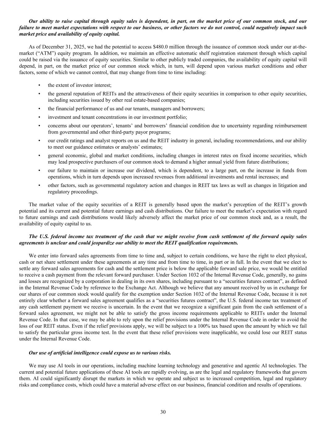 • the extent of investor interest; • the general reputation of REITs and the attractiveness of their equity securities in comparison to other equity securities, including securities issued by other real estate-based companies; • the financial performance of us and our tenants, managers and borrowers; • investment and tenant concentrations in our investment portfolio; • concerns about our operators’, tenants’ and borrowers’ financial condition due to uncertainty regarding reimbursement from governmental and other third-party payor programs; • our credit ratings and analyst reports on us and the REIT industry in general, including recommendations, and our ability to meet our guidance estimates or analysts’ estimates; • general economic, global and market conditions, including changes in interest rates on fixed income securities, which may lead prospective purchasers of our common stock to demand a higher annual yield from future distributions; • our failure to maintain or increase our dividend, which is dependent, to a large part, on the increase in funds from operations, which in turn depends upon increased revenues from additional investments and rental increases; and • other factors, such as governmental regulatory action and changes in REIT tax laws as well as changes in litigation and regulatory proceedings. The market value of the equity securities of a REIT is generally based upon the market’s perception of the REIT’s growth potential and its current and potential future earnings and cash distributions. Our failure to meet the market’s expectation with regard to future earnings and cash distributions would likely adversely affect the market price of our common stock and, as a result, the availability of equity capital to us. The U.S. federal income tax treatment of the cash that we might receive from cash settlement of the forward equity sales agreements is unclear and could jeopardize our ability to meet the REIT qualification requirements. We enter into forward sales agreements from time to time and, subject to certain conditions, we have the right to elect physical, cash or net share settlement under these agreements at any time and from time to time, in part or in full. In the event that we elect to settle any forward sales agreements for cash and the settlement price is below the applicable forward sale price, we would be entitled to receive a cash payment from the relevant forward purchaser. Under Section 1032 of the Internal Revenue Code, generally, no gains and losses are recognized by a corporation in dealing in its own shares, including pursuant to a “securities futures contract”, as defined in the Internal Revenue Code by reference to the Exchange Act. Although we believe that any amount received by us in exchange for our shares of our common stock would qualify for the exemption under Section 1032 of the Internal Revenue Code, because it is not entirely clear whether a forward sales agreement qualifies as a “securities futures contract”, the U.S. federal income tax treatment of any cash settlement payment we receive is uncertain. In the event that we recognize a significant gain from the cash settlement of a forward sales agreement, we might not be able to satisfy the gross income requirements applicable to REITs under the Internal Revenue Code. In that case, we may be able to rely upon the relief provisions under the Internal Revenue Code in order to avoid the loss of our REIT status. Even if the relief provisions apply, we will be subject to a 100% tax based upon the amount by which we fail to satisfy the particular gross income test. In the event that these relief provisions were inapplicable, we could lose our REIT status under the Internal Revenue Code. Our use of artificial intelligence could expose us to various risks. We may use AI tools in our operations, including machine learning technology and generative and agentic AI technologies. The current and potential future applications of these AI tools are rapidly evolving, as are the legal and regulatory frameworks that govern them. AI could significantly disrupt the markets in which we operate and subject us to increased competition, legal and regulatory risks and compliance costs, which could have a material adverse effect on our business, financial condition and results of operations. Our ability to raise capital through equity sales is dependent, in part, on the market price of our common stock, and our failure to meet market expectations with respect to our business, or other factors we do not control, could negatively impact such market price and availability of equity capital. As of December 31, 2025, we had the potential to access $480.0 million through the issuance of common stock under our at-the- market (“ATM”) equity program. In addition, we maintain an effective automatic shelf registration statement through which capital could be raised via the issuance of equity securities. Similar to other publicly traded companies, the availability of equity capital will depend, in part, on the market price of our common stock which, in turn, will depend upon various market conditions and other factors, some of which we cannot control, that may change from time to time including: 30