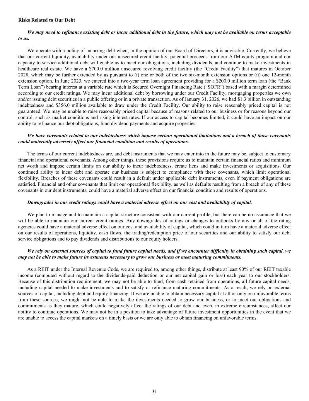 Risks Related to Our Debt We may need to refinance existing debt or incur additional debt in the future, which may not be available on terms acceptable to us. We operate with a policy of incurring debt when, in the opinion of our Board of Directors, it is advisable. Currently, we believe that our current liquidity, availability under our unsecured credit facility, potential proceeds from our ATM equity program and our capacity to service additional debt will enable us to meet our obligations, including dividends, and continue to make investments in healthcare real estate. We have a $700.0 million unsecured revolving credit facility (the “Credit Facility”) that matures in October 2028, which may be further extended by us pursuant to (i) one or both of the two six-month extension options or (ii) one 12-month extension option. In June 2023, we entered into a two-year term loan agreement providing for a $200.0 million term loan (the “Bank Term Loan”) bearing interest at a variable rate which is Secured Overnight Financing Rate (“SOFR”) based with a margin determined according to our credit ratings. We may incur additional debt by borrowing under our Credit Facility, mortgaging properties we own and/or issuing debt securities in a public offering or in a private transaction. As of January 31, 2026, we had $1.3 billion in outstanding indebtedness and $356.0 million available to draw under the Credit Facility. Our ability to raise reasonably priced capital is not guaranteed. We may be unable to raise reasonably priced capital because of reasons related to our business or for reasons beyond our control, such as market conditions and rising interest rates. If our access to capital becomes limited, it could have an impact on our ability to refinance our debt obligations, fund dividend payments and acquire properties. We have covenants related to our indebtedness which impose certain operational limitations and a breach of those covenants could materially adversely affect our financial condition and results of operations. The terms of our current indebtedness are, and debt instruments that we may enter into in the future may be, subject to customary financial and operational covenants. Among other things, these provisions require us to maintain certain financial ratios and minimum net worth and impose certain limits on our ability to incur indebtedness, create liens and make investments or acquisitions. Our continued ability to incur debt and operate our business is subject to compliance with these covenants, which limit operational flexibility. Breaches of these covenants could result in a default under applicable debt instruments, even if payment obligations are satisfied. Financial and other covenants that limit our operational flexibility, as well as defaults resulting from a breach of any of these covenants in our debt instruments, could have a material adverse effect on our financial condition and results of operations. Downgrades in our credit ratings could have a material adverse effect on our cost and availability of capital. We plan to manage and to maintain a capital structure consistent with our current profile, but there can be no assurance that we will be able to maintain our current credit ratings. Any downgrades of ratings or changes to outlooks by any or all of the rating agencies could have a material adverse effect on our cost and availability of capital, which could in turn have a material adverse effect on our results of operations, liquidity, cash flows, the trading/redemption price of our securities and our ability to satisfy our debt service obligations and to pay dividends and distributions to our equity holders. We rely on external sources of capital to fund future capital needs, and if we encounter difficulty in obtaining such capital, we may not be able to make future investments necessary to grow our business or meet maturing commitments. As a REIT under the Internal Revenue Code, we are required to, among other things, distribute at least 90% of our REIT taxable income (computed without regard to the dividends-paid deduction or our net capital gain or loss) each year to our stockholders. Because of this distribution requirement, we may not be able to fund, from cash retained from operations, all future capital needs, including capital needed to make investments and to satisfy or refinance maturing commitments. As a result, we rely on external sources of capital, including debt and equity financing. If we are unable to obtain necessary capital at all or only on unfavorable terms from these sources, we might not be able to make the investments needed to grow our business, or to meet our obligations and commitments as they mature, which could negatively affect the ratings of our debt and even, in extreme circumstances, affect our ability to continue operations. We may not be in a position to take advantage of future investment opportunities in the event that we are unable to access the capital markets on a timely basis or we are only able to obtain financing on unfavorable terms. 31