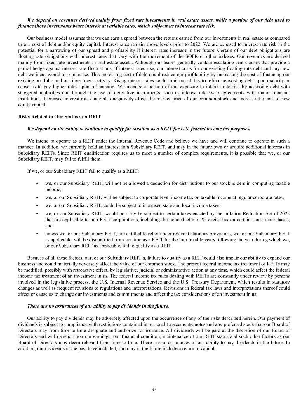 If we, or our Subsidiary REIT fail to qualify as a REIT: • we, or our Subsidiary REIT, will not be allowed a deduction for distributions to our stockholders in computing taxable income; • we, or our Subsidiary REIT, will be subject to corporate-level income tax on taxable income at regular corporate rates; • we, or our Subsidiary REIT, could be subject to increased state and local income taxes; • we, or our Subsidiary REIT, would possibly be subject to certain taxes enacted by the Inflation Reduction Act of 2022 that are applicable to non-REIT corporations, including the nondeductible 1% excise tax on certain stock repurchases; and • unless we, or our Subsidiary REIT, are entitled to relief under relevant statutory provisions, we, or our Subsidiary REIT as applicable, will be disqualified from taxation as a REIT for the four taxable years following the year during which we, or our Subsidiary REIT as applicable, fail to qualify as a REIT. Because of all these factors, our, or our Subsidiary REIT’s, failure to qualify as a REIT could also impair our ability to expand our business and could materially adversely affect the value of our common stock. The present federal income tax treatment of REITs may be modified, possibly with retroactive effect, by legislative, judicial or administrative action at any time, which could affect the federal income tax treatment of an investment in us. The federal income tax rules dealing with REITs are constantly under review by persons involved in the legislative process, the U.S. Internal Revenue Service and the U.S. Treasury Department, which results in statutory changes as well as frequent revisions to regulations and interpretations. Revisions in federal tax laws and interpretations thereof could affect or cause us to change our investments and commitments and affect the tax considerations of an investment in us. There are no assurances of our ability to pay dividends in the future. Our ability to pay dividends may be adversely affected upon the occurrence of any of the risks described herein. Our payment of dividends is subject to compliance with restrictions contained in our credit agreements, notes and any preferred stock that our Board of Directors may from time to time designate and authorize for issuance. All dividends will be paid at the discretion of our Board of Directors and will depend upon our earnings, our financial condition, maintenance of our REIT status and such other factors as our Board of Directors may deem relevant from time to time. There are no assurances of our ability to pay dividends in the future. In addition, our dividends in the past have included, and may in the future include a return of capital. We depend on revenues derived mainly from fixed rate investments in real estate assets, while a portion of our debt used to finance those investments bears interest at variable rates, which subjects us to interest rate risk. Our business model assumes that we can earn a spread between the returns earned from our investments in real estate as compared to our cost of debt and/or equity capital. Interest rates remain above levels prior to 2022. We are exposed to interest rate risk in the potential for a narrowing of our spread and profitability if interest rates increase in the future. Certain of our debt obligations are floating rate obligations with interest rates that vary with the movement of the SOFR or other indexes. Our revenues are derived mainly from fixed rate investments in real estate assets. Although our leases generally contain escalating rent clauses that provide a partial hedge against interest rate fluctuations, if interest rates rise, our interest costs for our existing floating rate debt and any new debt we incur would also increase. This increasing cost of debt could reduce our profitability by increasing the cost of financing our existing portfolio and our investment activity. Rising interest rates could limit our ability to refinance existing debt upon maturity or cause us to pay higher rates upon refinancing. We manage a portion of our exposure to interest rate risk by accessing debt with staggered maturities and through the use of derivative instruments, such as interest rate swap agreements with major financial institutions. Increased interest rates may also negatively affect the market price of our common stock and increase the cost of new equity capital. Risks Related to Our Status as a REIT We depend on the ability to continue to qualify for taxation as a REIT for U.S. federal income tax purposes. We intend to operate as a REIT under the Internal Revenue Code and believe we have and will continue to operate in such a manner. In addition, we currently hold an interest in a Subsidiary REIT, and may in the future own or acquire additional interests in Subsidiary REITs. Since REIT qualification requires us to meet a number of complex requirements, it is possible that we, or our Subsidiary REIT, may fail to fulfill them. 32
