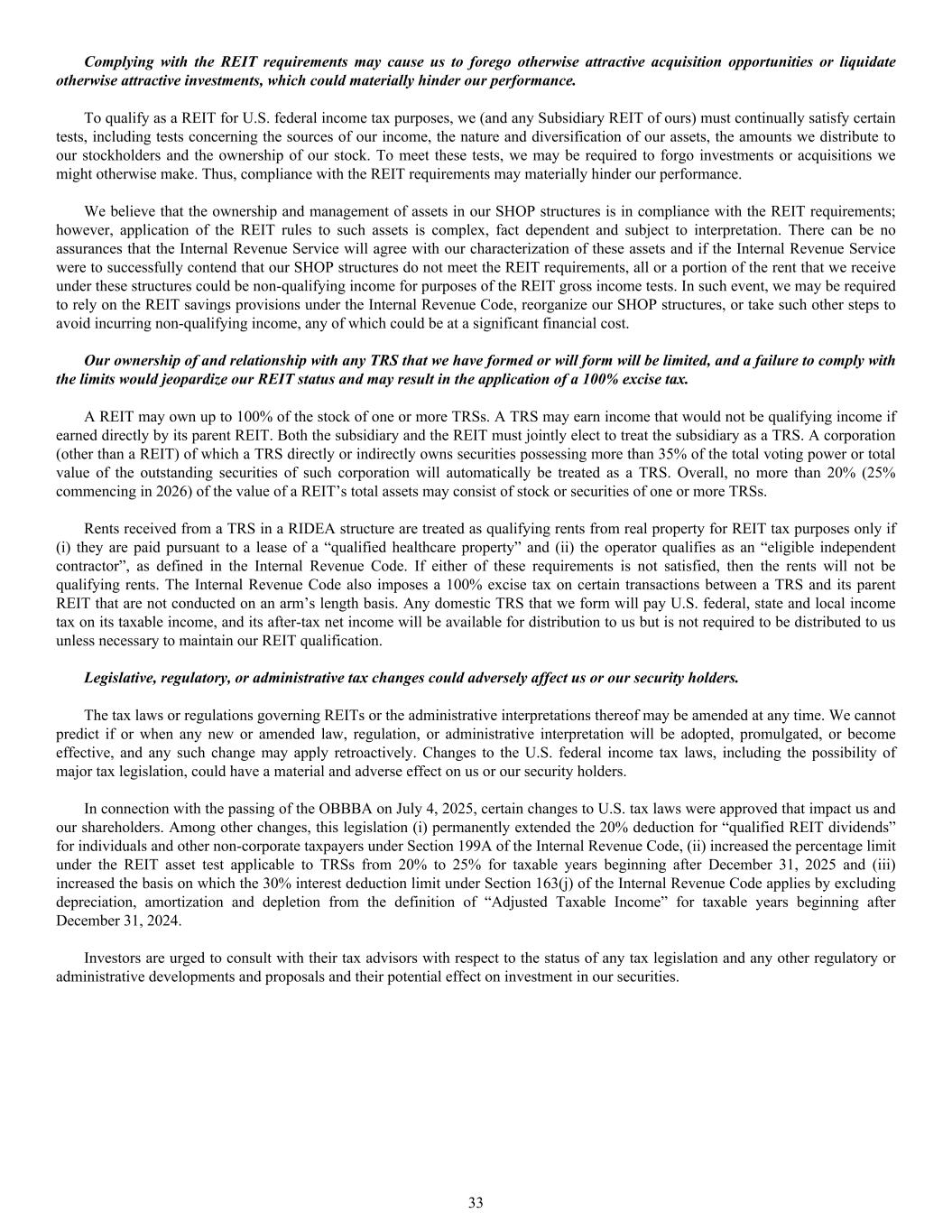 Complying with the REIT requirements may cause us to forego otherwise attractive acquisition opportunities or liquidate otherwise attractive investments, which could materially hinder our performance. To qualify as a REIT for U.S. federal income tax purposes, we (and any Subsidiary REIT of ours) must continually satisfy certain tests, including tests concerning the sources of our income, the nature and diversification of our assets, the amounts we distribute to our stockholders and the ownership of our stock. To meet these tests, we may be required to forgo investments or acquisitions we might otherwise make. Thus, compliance with the REIT requirements may materially hinder our performance. We believe that the ownership and management of assets in our SHOP structures is in compliance with the REIT requirements; however, application of the REIT rules to such assets is complex, fact dependent and subject to interpretation. There can be no assurances that the Internal Revenue Service will agree with our characterization of these assets and if the Internal Revenue Service were to successfully contend that our SHOP structures do not meet the REIT requirements, all or a portion of the rent that we receive under these structures could be non-qualifying income for purposes of the REIT gross income tests. In such event, we may be required to rely on the REIT savings provisions under the Internal Revenue Code, reorganize our SHOP structures, or take such other steps to avoid incurring non-qualifying income, any of which could be at a significant financial cost. Our ownership of and relationship with any TRS that we have formed or will form will be limited, and a failure to comply with the limits would jeopardize our REIT status and may result in the application of a 100% excise tax. A REIT may own up to 100% of the stock of one or more TRSs. A TRS may earn income that would not be qualifying income if earned directly by its parent REIT. Both the subsidiary and the REIT must jointly elect to treat the subsidiary as a TRS. A corporation (other than a REIT) of which a TRS directly or indirectly owns securities possessing more than 35% of the total voting power or total value of the outstanding securities of such corporation will automatically be treated as a TRS. Overall, no more than 20% (25% commencing in 2026) of the value of a REIT’s total assets may consist of stock or securities of one or more TRSs. Rents received from a TRS in a RIDEA structure are treated as qualifying rents from real property for REIT tax purposes only if (i) they are paid pursuant to a lease of a “qualified healthcare property” and (ii) the operator qualifies as an “eligible independent contractor”, as defined in the Internal Revenue Code. If either of these requirements is not satisfied, then the rents will not be qualifying rents. The Internal Revenue Code also imposes a 100% excise tax on certain transactions between a TRS and its parent REIT that are not conducted on an arm’s length basis. Any domestic TRS that we form will pay U.S. federal, state and local income tax on its taxable income, and its after-tax net income will be available for distribution to us but is not required to be distributed to us unless necessary to maintain our REIT qualification. Legislative, regulatory, or administrative tax changes could adversely affect us or our security holders. The tax laws or regulations governing REITs or the administrative interpretations thereof may be amended at any time. We cannot predict if or when any new or amended law, regulation, or administrative interpretation will be adopted, promulgated, or become effective, and any such change may apply retroactively. Changes to the U.S. federal income tax laws, including the possibility of major tax legislation, could have a material and adverse effect on us or our security holders. In connection with the passing of the OBBBA on July 4, 2025, certain changes to U.S. tax laws were approved that impact us and our shareholders. Among other changes, this legislation (i) permanently extended the 20% deduction for “qualified REIT dividends” for individuals and other non-corporate taxpayers under Section 199A of the Internal Revenue Code, (ii) increased the percentage limit under the REIT asset test applicable to TRSs from 20% to 25% for taxable years beginning after December 31, 2025 and (iii) increased the basis on which the 30% interest deduction limit under Section 163(j) of the Internal Revenue Code applies by excluding depreciation, amortization and depletion from the definition of “Adjusted Taxable Income” for taxable years beginning after December 31, 2024. Investors are urged to consult with their tax advisors with respect to the status of any tax legislation and any other regulatory or administrative developments and proposals and their potential effect on investment in our securities. 33