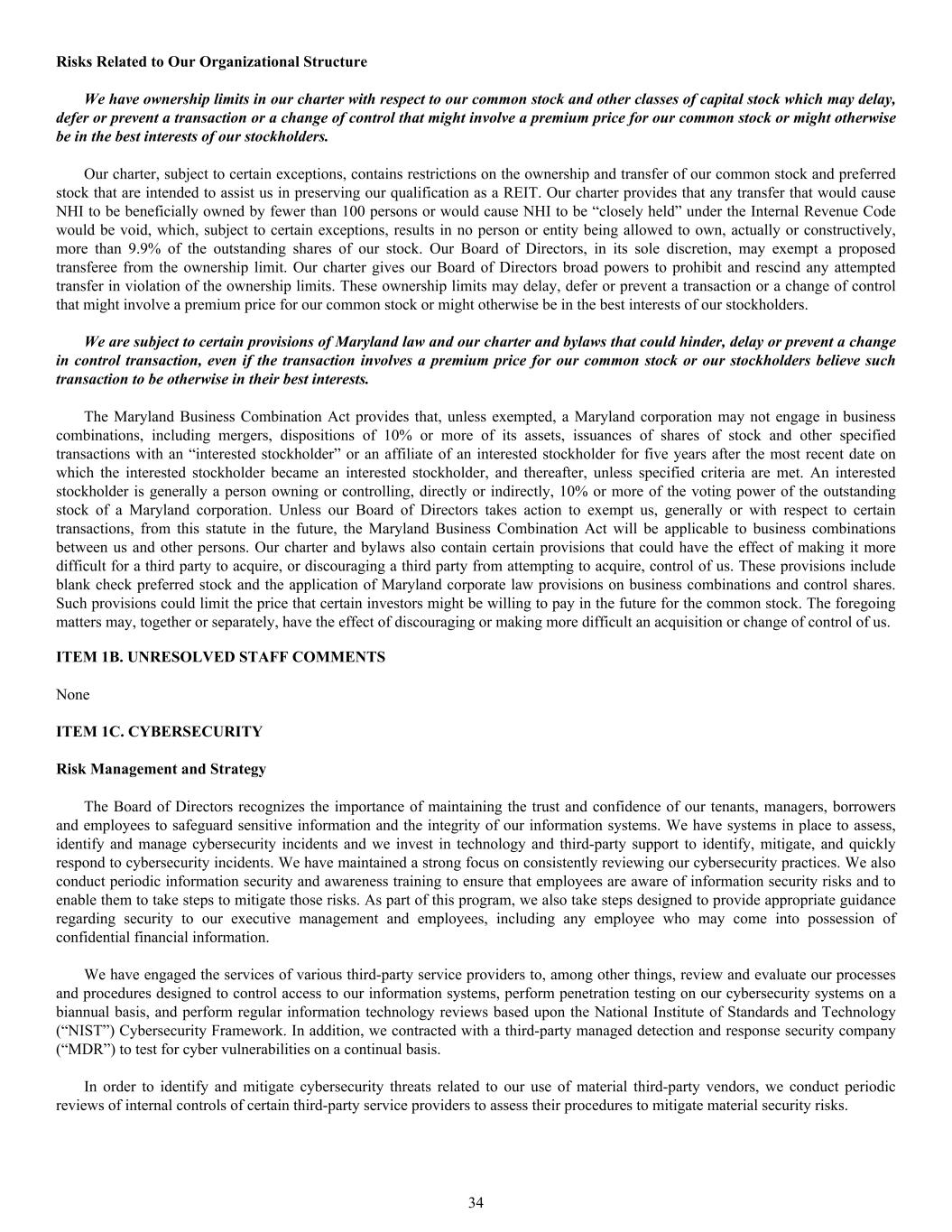 Risks Related to Our Organizational Structure We have ownership limits in our charter with respect to our common stock and other classes of capital stock which may delay, defer or prevent a transaction or a change of control that might involve a premium price for our common stock or might otherwise be in the best interests of our stockholders. Our charter, subject to certain exceptions, contains restrictions on the ownership and transfer of our common stock and preferred stock that are intended to assist us in preserving our qualification as a REIT. Our charter provides that any transfer that would cause NHI to be beneficially owned by fewer than 100 persons or would cause NHI to be “closely held” under the Internal Revenue Code would be void, which, subject to certain exceptions, results in no person or entity being allowed to own, actually or constructively, more than 9.9% of the outstanding shares of our stock. Our Board of Directors, in its sole discretion, may exempt a proposed transferee from the ownership limit. Our charter gives our Board of Directors broad powers to prohibit and rescind any attempted transfer in violation of the ownership limits. These ownership limits may delay, defer or prevent a transaction or a change of control that might involve a premium price for our common stock or might otherwise be in the best interests of our stockholders. We are subject to certain provisions of Maryland law and our charter and bylaws that could hinder, delay or prevent a change in control transaction, even if the transaction involves a premium price for our common stock or our stockholders believe such transaction to be otherwise in their best interests. The Maryland Business Combination Act provides that, unless exempted, a Maryland corporation may not engage in business combinations, including mergers, dispositions of 10% or more of its assets, issuances of shares of stock and other specified transactions with an “interested stockholder” or an affiliate of an interested stockholder for five years after the most recent date on which the interested stockholder became an interested stockholder, and thereafter, unless specified criteria are met. An interested stockholder is generally a person owning or controlling, directly or indirectly, 10% or more of the voting power of the outstanding stock of a Maryland corporation. Unless our Board of Directors takes action to exempt us, generally or with respect to certain transactions, from this statute in the future, the Maryland Business Combination Act will be applicable to business combinations between us and other persons. Our charter and bylaws also contain certain provisions that could have the effect of making it more difficult for a third party to acquire, or discouraging a third party from attempting to acquire, control of us. These provisions include blank check preferred stock and the application of Maryland corporate law provisions on business combinations and control shares. Such provisions could limit the price that certain investors might be willing to pay in the future for the common stock. The foregoing matters may, together or separately, have the effect of discouraging or making more difficult an acquisition or change of control of us. ITEM 1B. UNRESOLVED STAFF COMMENTS None ITEM 1C. CYBERSECURITY Risk Management and Strategy The Board of Directors recognizes the importance of maintaining the trust and confidence of our tenants, managers, borrowers and employees to safeguard sensitive information and the integrity of our information systems. We have systems in place to assess, identify and manage cybersecurity incidents and we invest in technology and third-party support to identify, mitigate, and quickly respond to cybersecurity incidents. We have maintained a strong focus on consistently reviewing our cybersecurity practices. We also conduct periodic information security and awareness training to ensure that employees are aware of information security risks and to enable them to take steps to mitigate those risks. As part of this program, we also take steps designed to provide appropriate guidance regarding security to our executive management and employees, including any employee who may come into possession of confidential financial information. We have engaged the services of various third-party service providers to, among other things, review and evaluate our processes and procedures designed to control access to our information systems, perform penetration testing on our cybersecurity systems on a biannual basis, and perform regular information technology reviews based upon the National Institute of Standards and Technology (“NIST”) Cybersecurity Framework. In addition, we contracted with a third-party managed detection and response security company (“MDR”) to test for cyber vulnerabilities on a continual basis. In order to identify and mitigate cybersecurity threats related to our use of material third-party vendors, we conduct periodic reviews of internal controls of certain third-party service providers to assess their procedures to mitigate material security risks. 34