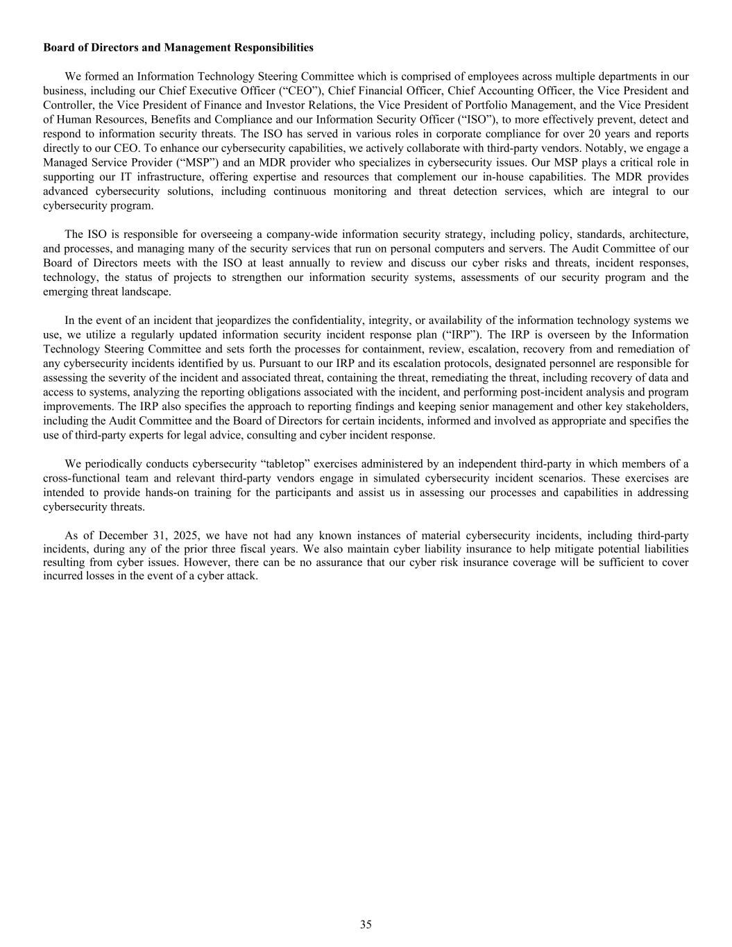 Board of Directors and Management Responsibilities We formed an Information Technology Steering Committee which is comprised of employees across multiple departments in our business, including our Chief Executive Officer (“CEO”), Chief Financial Officer, Chief Accounting Officer, the Vice President and Controller, the Vice President of Finance and Investor Relations, the Vice President of Portfolio Management, and the Vice President of Human Resources, Benefits and Compliance and our Information Security Officer (“ISO”), to more effectively prevent, detect and respond to information security threats. The ISO has served in various roles in corporate compliance for over 20 years and reports directly to our CEO. To enhance our cybersecurity capabilities, we actively collaborate with third-party vendors. Notably, we engage a Managed Service Provider (“MSP”) and an MDR provider who specializes in cybersecurity issues. Our MSP plays a critical role in supporting our IT infrastructure, offering expertise and resources that complement our in-house capabilities. The MDR provides advanced cybersecurity solutions, including continuous monitoring and threat detection services, which are integral to our cybersecurity program. The ISO is responsible for overseeing a company-wide information security strategy, including policy, standards, architecture, and processes, and managing many of the security services that run on personal computers and servers. The Audit Committee of our Board of Directors meets with the ISO at least annually to review and discuss our cyber risks and threats, incident responses, technology, the status of projects to strengthen our information security systems, assessments of our security program and the emerging threat landscape. In the event of an incident that jeopardizes the confidentiality, integrity, or availability of the information technology systems we use, we utilize a regularly updated information security incident response plan (“IRP”). The IRP is overseen by the Information Technology Steering Committee and sets forth the processes for containment, review, escalation, recovery from and remediation of any cybersecurity incidents identified by us. Pursuant to our IRP and its escalation protocols, designated personnel are responsible for assessing the severity of the incident and associated threat, containing the threat, remediating the threat, including recovery of data and access to systems, analyzing the reporting obligations associated with the incident, and performing post-incident analysis and program improvements. The IRP also specifies the approach to reporting findings and keeping senior management and other key stakeholders, including the Audit Committee and the Board of Directors for certain incidents, informed and involved as appropriate and specifies the use of third-party experts for legal advice, consulting and cyber incident response. We periodically conducts cybersecurity “tabletop” exercises administered by an independent third-party in which members of a cross-functional team and relevant third-party vendors engage in simulated cybersecurity incident scenarios. These exercises are intended to provide hands-on training for the participants and assist us in assessing our processes and capabilities in addressing cybersecurity threats. As of December 31, 2025, we have not had any known instances of material cybersecurity incidents, including third-party incidents, during any of the prior three fiscal years. We also maintain cyber liability insurance to help mitigate potential liabilities resulting from cyber issues. However, there can be no assurance that our cyber risk insurance coverage will be sufficient to cover incurred losses in the event of a cyber attack. 35