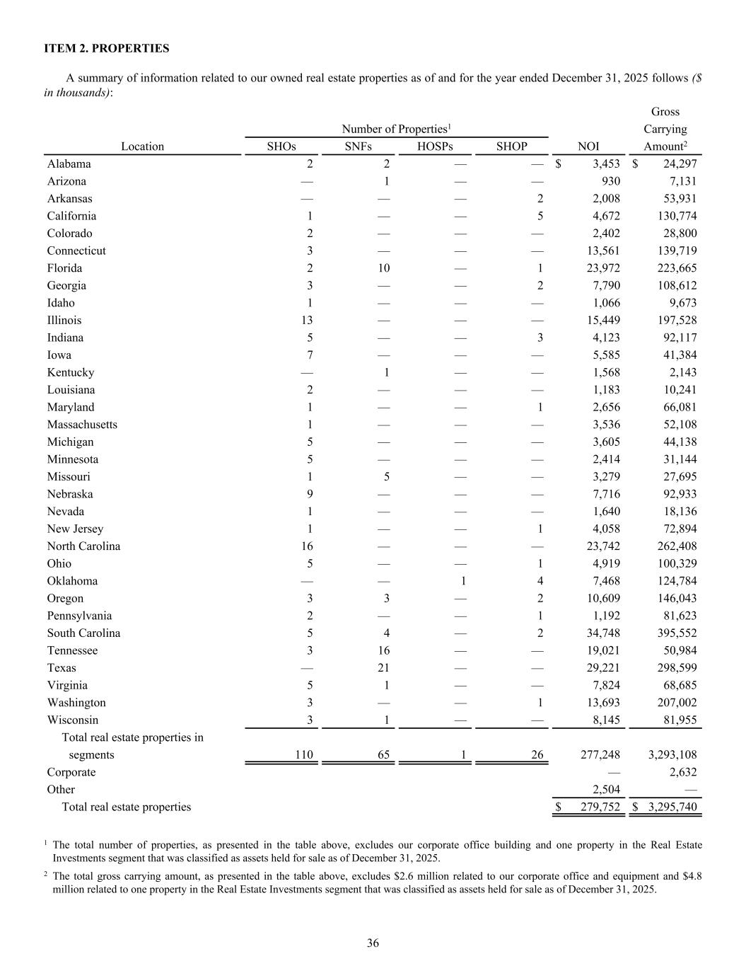 Gross Number of Properties1 Carrying Location SHOs SNFs HOSPs SHOP NOI Amount2 Alabama 2 2 — — $ 3,453 $ 24,297 Arizona — 1 — — 930 7,131 Arkansas — — — 2 2,008 53,931 California 1 — — 5 4,672 130,774 Colorado 2 — — — 2,402 28,800 Connecticut 3 — — — 13,561 139,719 Florida 2 10 — 1 23,972 223,665 Georgia 3 — — 2 7,790 108,612 Idaho 1 — — — 1,066 9,673 Illinois 13 — — — 15,449 197,528 Indiana 5 — — 3 4,123 92,117 Iowa 7 — — — 5,585 41,384 Kentucky — 1 — — 1,568 2,143 Louisiana 2 — — — 1,183 10,241 Maryland 1 — — 1 2,656 66,081 Massachusetts 1 — — — 3,536 52,108 Michigan 5 — — — 3,605 44,138 Minnesota 5 — — — 2,414 31,144 Missouri 1 5 — — 3,279 27,695 Nebraska 9 — — — 7,716 92,933 Nevada 1 — — — 1,640 18,136 New Jersey 1 — — 1 4,058 72,894 North Carolina 16 — — — 23,742 262,408 Ohio 5 — — 1 4,919 100,329 Oklahoma — — 1 4 7,468 124,784 Oregon 3 3 — 2 10,609 146,043 Pennsylvania 2 — — 1 1,192 81,623 South Carolina 5 4 — 2 34,748 395,552 Tennessee 3 16 — — 19,021 50,984 Texas — 21 — — 29,221 298,599 Virginia 5 1 — — 7,824 68,685 Washington 3 — — 1 13,693 207,002 Wisconsin 3 1 — — 8,145 81,955 Total real estate properties in segments 110 65 1 26 277,248 3,293,108 Corporate — 2,632 Other 2,504 — Total real estate properties $ 279,752 $ 3,295,740 1 The total number of properties, as presented in the table above, excludes our corporate office building and one property in the Real Estate Investments segment that was classified as assets held for sale as of December 31, 2025. 2 The total gross carrying amount, as presented in the table above, excludes $2.6 million related to our corporate office and equipment and $4.8 million related to one property in the Real Estate Investments segment that was classified as assets held for sale as of December 31, 2025. ITEM 2. PROPERTIES A summary of information related to our owned real estate properties as of and for the year ended December 31, 2025 follows ($ in thousands): 36