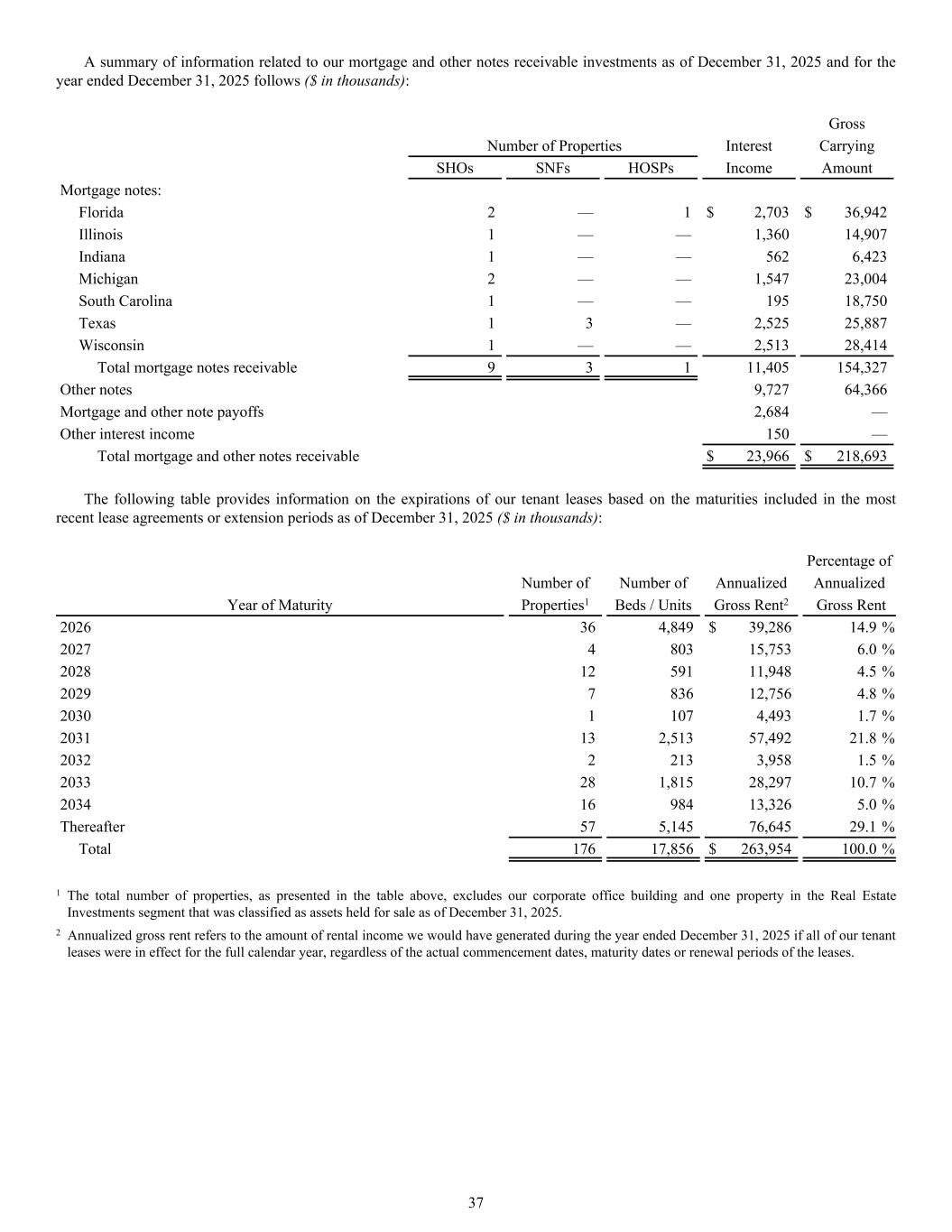 Gross Number of Properties Interest Carrying SHOs SNFs HOSPs Income Amount Mortgage notes: Florida 2 — 1 $ 2,703 $ 36,942 Illinois 1 — — 1,360 14,907 Indiana 1 — — 562 6,423 Michigan 2 — — 1,547 23,004 South Carolina 1 — — 195 18,750 Texas 1 3 — 2,525 25,887 Wisconsin 1 — — 2,513 28,414 Total mortgage notes receivable 9 3 1 11,405 154,327 Other notes 9,727 64,366 Mortgage and other note payoffs 2,684 — Other interest income 150 — Total mortgage and other notes receivable $ 23,966 $ 218,693 The following table provides information on the expirations of our tenant leases based on the maturities included in the most recent lease agreements or extension periods as of December 31, 2025 ($ in thousands): Percentage of Number of Number of Annualized Annualized Year of Maturity Properties1 Beds / Units Gross Rent2 Gross Rent 2026 36 4,849 $ 39,286 14.9 % 2027 4 803 15,753 6.0 % 2028 12 591 11,948 4.5 % 2029 7 836 12,756 4.8 % 2030 1 107 4,493 1.7 % 2031 13 2,513 57,492 21.8 % 2032 2 213 3,958 1.5 % 2033 28 1,815 28,297 10.7 % 2034 16 984 13,326 5.0 % Thereafter 57 5,145 76,645 29.1 % Total 176 17,856 $ 263,954 100.0 % 1 The total number of properties, as presented in the table above, excludes our corporate office building and one property in the Real Estate Investments segment that was classified as assets held for sale as of December 31, 2025. 2 Annualized gross rent refers to the amount of rental income we would have generated during the year ended December 31, 2025 if all of our tenant leases were in effect for the full calendar year, regardless of the actual commencement dates, maturity dates or renewal periods of the leases. A summary of information related to our mortgage and other notes receivable investments as of December 31, 2025 and for the year ended December 31, 2025 follows ($ in thousands): 37