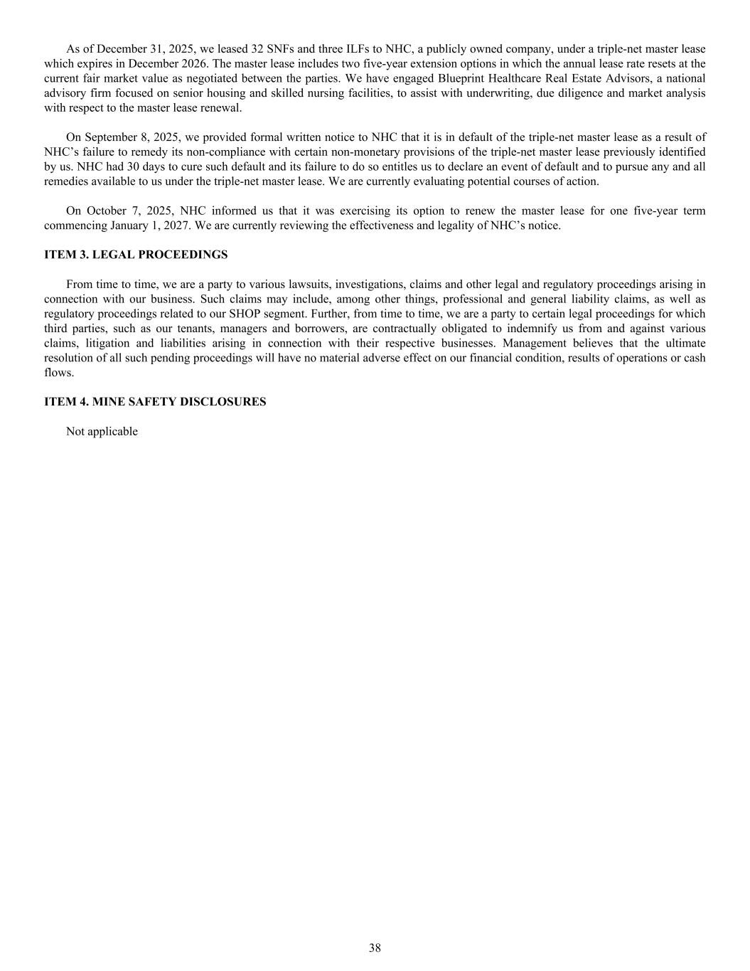 Not applicable As of December 31, 2025, we leased 32 SNFs and three ILFs to NHC, a publicly owned company, under a triple-net master lease which expires in December 2026. The master lease includes two five-year extension options in which the annual lease rate resets at the current fair market value as negotiated between the parties. We have engaged Blueprint Healthcare Real Estate Advisors, a national advisory firm focused on senior housing and skilled nursing facilities, to assist with underwriting, due diligence and market analysis with respect to the master lease renewal. On September 8, 2025, we provided formal written notice to NHC that it is in default of the triple-net master lease as a result of NHC’s failure to remedy its non-compliance with certain non-monetary provisions of the triple-net master lease previously identified by us. NHC had 30 days to cure such default and its failure to do so entitles us to declare an event of default and to pursue any and all remedies available to us under the triple-net master lease. We are currently evaluating potential courses of action. On October 7, 2025, NHC informed us that it was exercising its option to renew the master lease for one five-year term commencing January 1, 2027. We are currently reviewing the effectiveness and legality of NHC’s notice. ITEM 3. LEGAL PROCEEDINGS From time to time, we are a party to various lawsuits, investigations, claims and other legal and regulatory proceedings arising in connection with our business. Such claims may include, among other things, professional and general liability claims, as well as regulatory proceedings related to our SHOP segment. Further, from time to time, we are a party to certain legal proceedings for which third parties, such as our tenants, managers and borrowers, are contractually obligated to indemnify us from and against various claims, litigation and liabilities arising in connection with their respective businesses. Management believes that the ultimate resolution of all such pending proceedings will have no material adverse effect on our financial condition, results of operations or cash flows. ITEM 4. MINE SAFETY DISCLOSURES 38