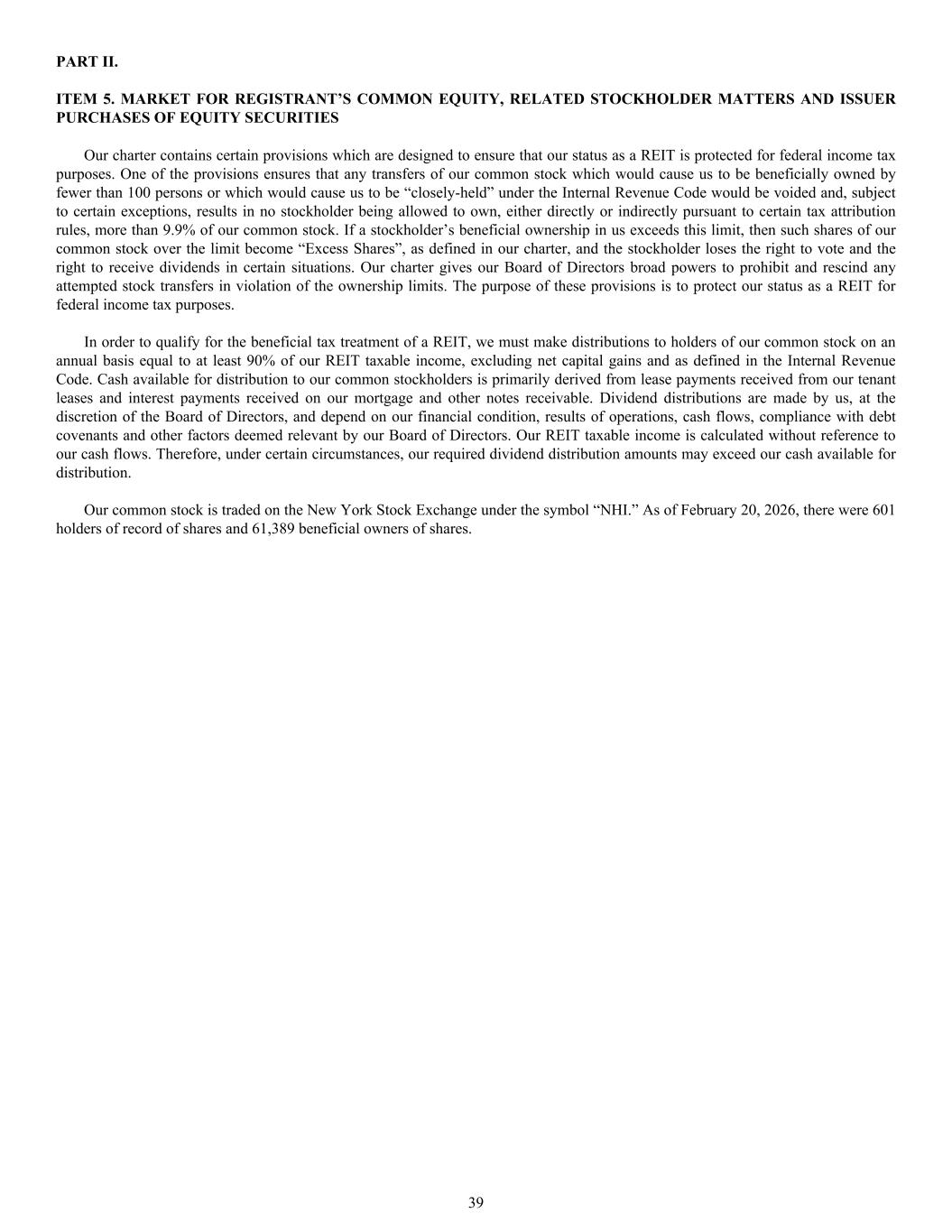 PART II. ITEM 5. MARKET FOR REGISTRANT’S COMMON EQUITY, RELATED STOCKHOLDER MATTERS AND ISSUER PURCHASES OF EQUITY SECURITIES Our charter contains certain provisions which are designed to ensure that our status as a REIT is protected for federal income tax purposes. One of the provisions ensures that any transfers of our common stock which would cause us to be beneficially owned by fewer than 100 persons or which would cause us to be “closely-held” under the Internal Revenue Code would be voided and, subject to certain exceptions, results in no stockholder being allowed to own, either directly or indirectly pursuant to certain tax attribution rules, more than 9.9% of our common stock. If a stockholder’s beneficial ownership in us exceeds this limit, then such shares of our common stock over the limit become “Excess Shares”, as defined in our charter, and the stockholder loses the right to vote and the right to receive dividends in certain situations. Our charter gives our Board of Directors broad powers to prohibit and rescind any attempted stock transfers in violation of the ownership limits. The purpose of these provisions is to protect our status as a REIT for federal income tax purposes. In order to qualify for the beneficial tax treatment of a REIT, we must make distributions to holders of our common stock on an annual basis equal to at least 90% of our REIT taxable income, excluding net capital gains and as defined in the Internal Revenue Code. Cash available for distribution to our common stockholders is primarily derived from lease payments received from our tenant leases and interest payments received on our mortgage and other notes receivable. Dividend distributions are made by us, at the discretion of the Board of Directors, and depend on our financial condition, results of operations, cash flows, compliance with debt covenants and other factors deemed relevant by our Board of Directors. Our REIT taxable income is calculated without reference to our cash flows. Therefore, under certain circumstances, our required dividend distribution amounts may exceed our cash available for distribution. Our common stock is traded on the New York Stock Exchange under the symbol “NHI.” As of February 20, 2026, there were 601 holders of record of shares and 61,389 beneficial owners of shares. 39