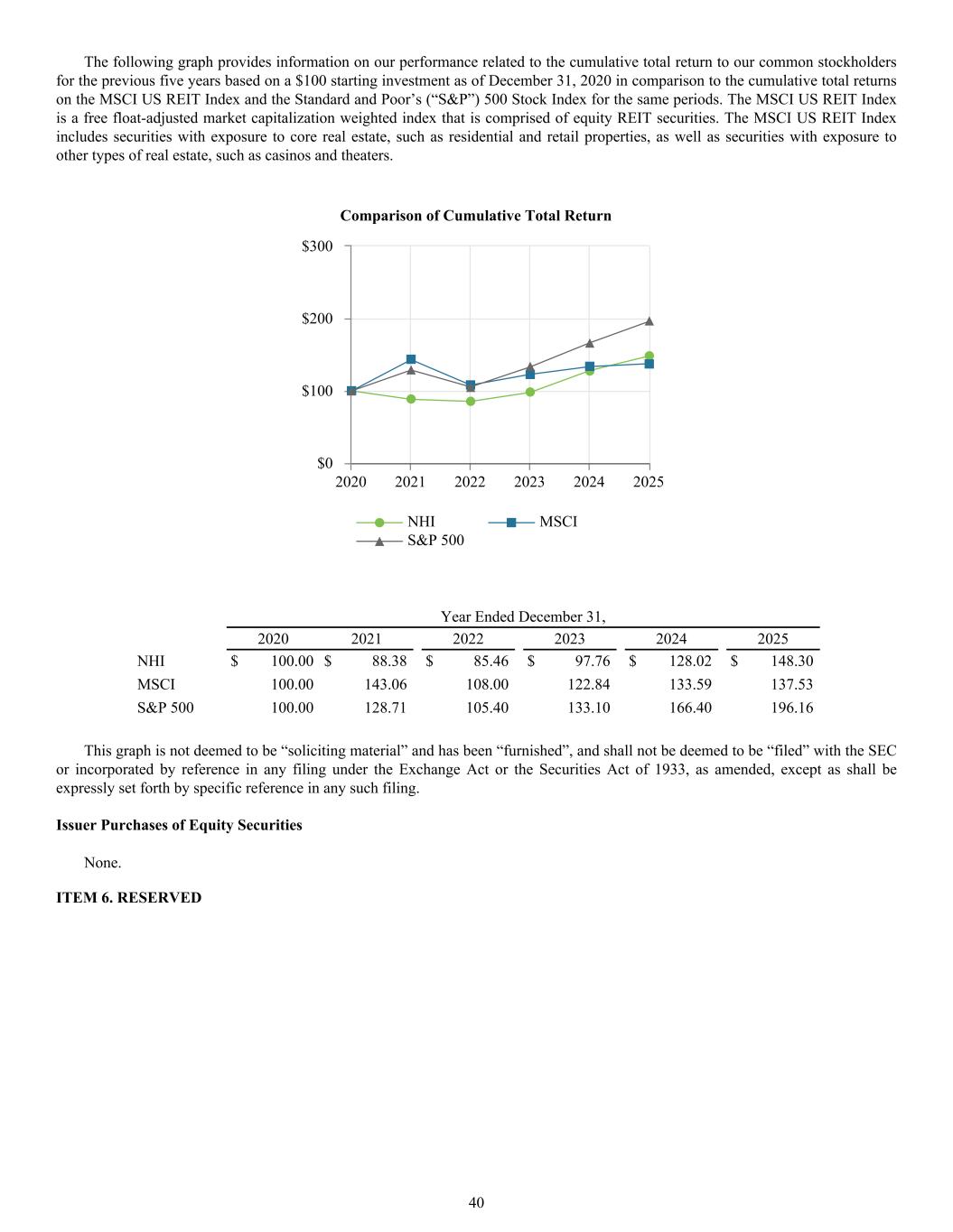 NHI MSCI S&P 500 2020 2021 2022 2023 2024 2025 $0 $100 $200 $300 Year Ended December 31, 2020 2021 2022 2023 2024 2025 NHI $ 100.00 $ 88.38 $ 85.46 $ 97.76 $ 128.02 $ 148.30 MSCI 100.00 143.06 108.00 122.84 133.59 137.53 S&P 500 100.00 128.71 105.40 133.10 166.40 196.16 This graph is not deemed to be “soliciting material” and has been “furnished”, and shall not be deemed to be “filed” with the SEC or incorporated by reference in any filing under the Exchange Act or the Securities Act of 1933, as amended, except as shall be expressly set forth by specific reference in any such filing. Issuer Purchases of Equity Securities None. ITEM 6. RESERVED The following graph provides information on our performance related to the cumulative total return to our common stockholders for the previous five years based on a $100 starting investment as of December 31, 2020 in comparison to the cumulative total returns on the MSCI US REIT Index and the Standard and Poor’s (“S&P”) 500 Stock Index for the same periods. The MSCI US REIT Index is a free float-adjusted market capitalization weighted index that is comprised of equity REIT securities. The MSCI US REIT Index includes securities with exposure to core real estate, such as residential and retail properties, as well as securities with exposure to other types of real estate, such as casinos and theaters. Comparison of Cumulative Total Return 40
