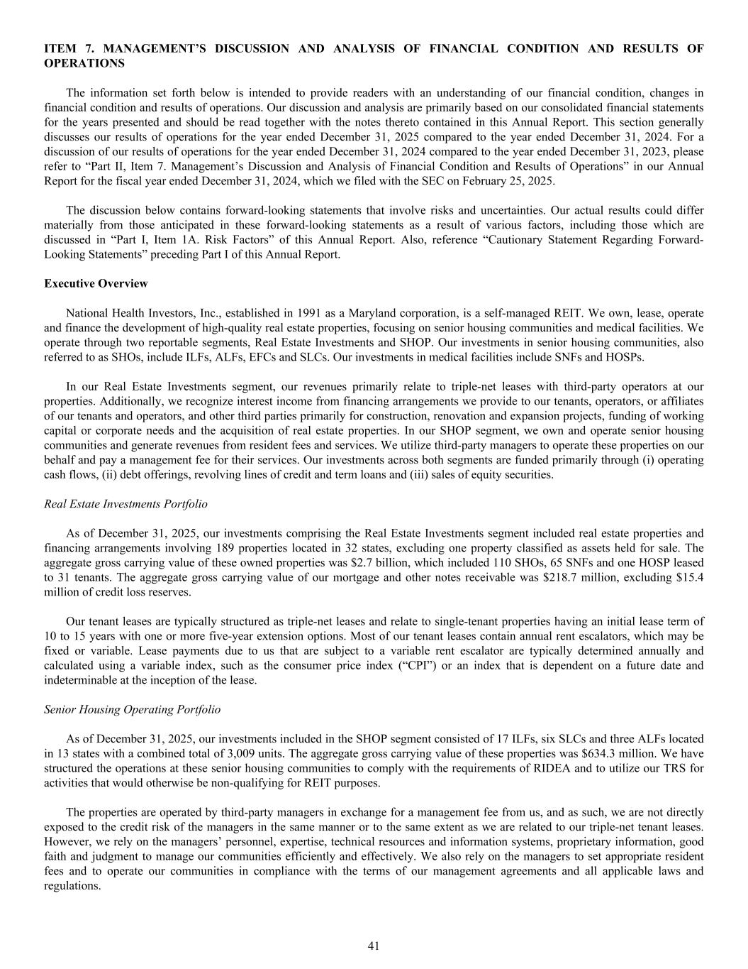 ITEM 7. MANAGEMENT’S DISCUSSION AND ANALYSIS OF FINANCIAL CONDITION AND RESULTS OF OPERATIONS The information set forth below is intended to provide readers with an understanding of our financial condition, changes in financial condition and results of operations. Our discussion and analysis are primarily based on our consolidated financial statements for the years presented and should be read together with the notes thereto contained in this Annual Report. This section generally discusses our results of operations for the year ended December 31, 2025 compared to the year ended December 31, 2024. For a discussion of our results of operations for the year ended December 31, 2024 compared to the year ended December 31, 2023, please refer to “Part II, Item 7. Management’s Discussion and Analysis of Financial Condition and Results of Operations” in our Annual Report for the fiscal year ended December 31, 2024, which we filed with the SEC on February 25, 2025. The discussion below contains forward-looking statements that involve risks and uncertainties. Our actual results could differ materially from those anticipated in these forward-looking statements as a result of various factors, including those which are discussed in “Part I, Item 1A. Risk Factors” of this Annual Report. Also, reference “Cautionary Statement Regarding Forward- Looking Statements” preceding Part I of this Annual Report. Executive Overview National Health Investors, Inc., established in 1991 as a Maryland corporation, is a self-managed REIT. We own, lease, operate and finance the development of high-quality real estate properties, focusing on senior housing communities and medical facilities. We operate through two reportable segments, Real Estate Investments and SHOP. Our investments in senior housing communities, also referred to as SHOs, include ILFs, ALFs, EFCs and SLCs. Our investments in medical facilities include SNFs and HOSPs. In our Real Estate Investments segment, our revenues primarily relate to triple-net leases with third-party operators at our properties. Additionally, we recognize interest income from financing arrangements we provide to our tenants, operators, or affiliates of our tenants and operators, and other third parties primarily for construction, renovation and expansion projects, funding of working capital or corporate needs and the acquisition of real estate properties. In our SHOP segment, we own and operate senior housing communities and generate revenues from resident fees and services. We utilize third-party managers to operate these properties on our behalf and pay a management fee for their services. Our investments across both segments are funded primarily through (i) operating cash flows, (ii) debt offerings, revolving lines of credit and term loans and (iii) sales of equity securities. Real Estate Investments Portfolio As of December 31, 2025, our investments comprising the Real Estate Investments segment included real estate properties and financing arrangements involving 189 properties located in 32 states, excluding one property classified as assets held for sale. The aggregate gross carrying value of these owned properties was $2.7 billion, which included 110 SHOs, 65 SNFs and one HOSP leased to 31 tenants. The aggregate gross carrying value of our mortgage and other notes receivable was $218.7 million, excluding $15.4 million of credit loss reserves. Our tenant leases are typically structured as triple-net leases and relate to single-tenant properties having an initial lease term of 10 to 15 years with one or more five-year extension options. Most of our tenant leases contain annual rent escalators, which may be fixed or variable. Lease payments due to us that are subject to a variable rent escalator are typically determined annually and calculated using a variable index, such as the consumer price index (“CPI”) or an index that is dependent on a future date and indeterminable at the inception of the lease. Senior Housing Operating Portfolio As of December 31, 2025, our investments included in the SHOP segment consisted of 17 ILFs, six SLCs and three ALFs located in 13 states with a combined total of 3,009 units. The aggregate gross carrying value of these properties was $634.3 million. We have structured the operations at these senior housing communities to comply with the requirements of RIDEA and to utilize our TRS for activities that would otherwise be non-qualifying for REIT purposes. The properties are operated by third-party managers in exchange for a management fee from us, and as such, we are not directly exposed to the credit risk of the managers in the same manner or to the same extent as we are related to our triple-net tenant leases. However, we rely on the managers’ personnel, expertise, technical resources and information systems, proprietary information, good faith and judgment to manage our communities efficiently and effectively. We also rely on the managers to set appropriate resident fees and to operate our communities in compliance with the terms of our management agreements and all applicable laws and regulations. 41