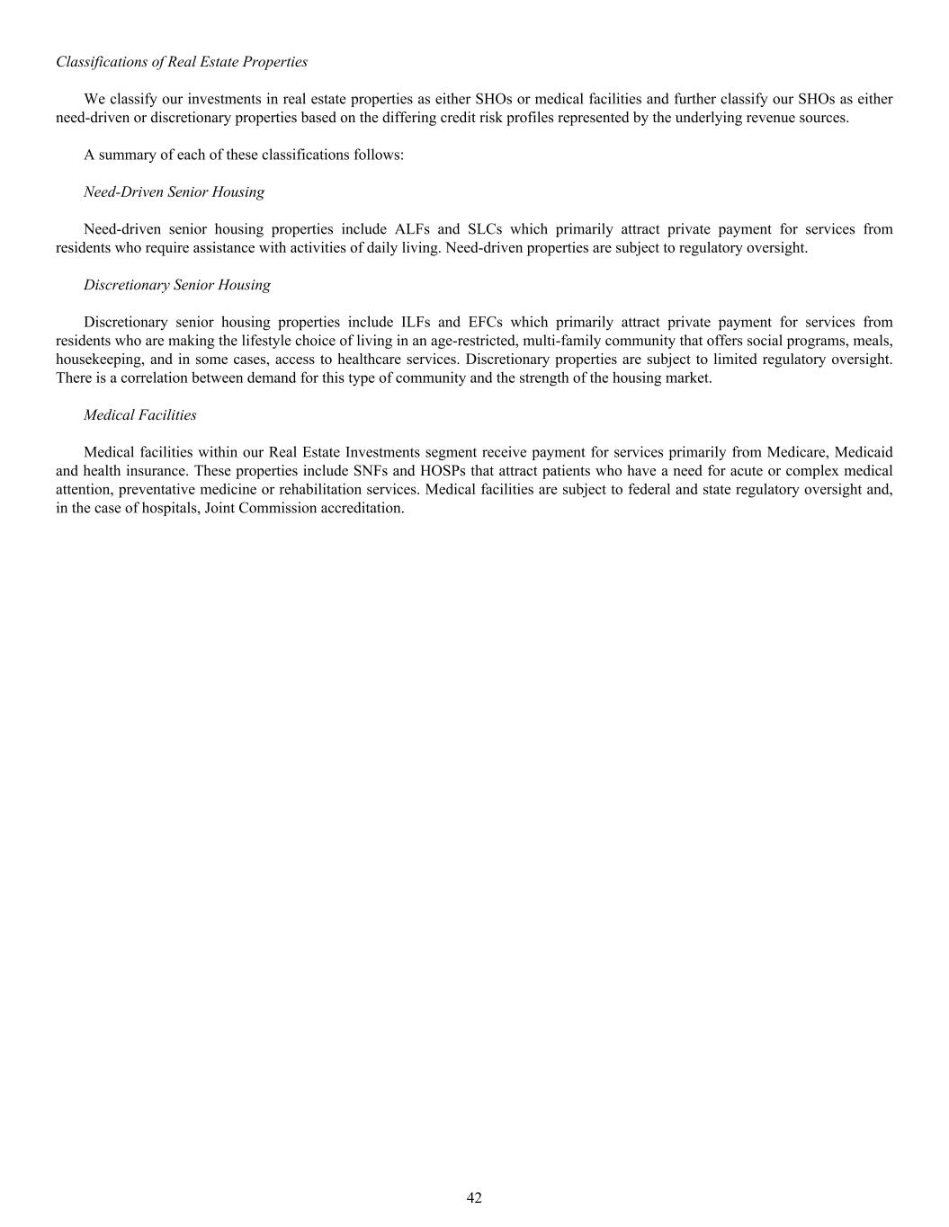 A summary of each of these classifications follows: Need-Driven Senior Housing Need-driven senior housing properties include ALFs and SLCs which primarily attract private payment for services from residents who require assistance with activities of daily living. Need-driven properties are subject to regulatory oversight. Discretionary Senior Housing Discretionary senior housing properties include ILFs and EFCs which primarily attract private payment for services from residents who are making the lifestyle choice of living in an age-restricted, multi-family community that offers social programs, meals, housekeeping, and in some cases, access to healthcare services. Discretionary properties are subject to limited regulatory oversight. There is a correlation between demand for this type of community and the strength of the housing market. Medical Facilities Medical facilities within our Real Estate Investments segment receive payment for services primarily from Medicare, Medicaid and health insurance. These properties include SNFs and HOSPs that attract patients who have a need for acute or complex medical attention, preventative medicine or rehabilitation services. Medical facilities are subject to federal and state regulatory oversight and, in the case of hospitals, Joint Commission accreditation. Classifications of Real Estate Properties We classify our investments in real estate properties as either SHOs or medical facilities and further classify our SHOs as either need-driven or discretionary properties based on the differing credit risk profiles represented by the underlying revenue sources. 42