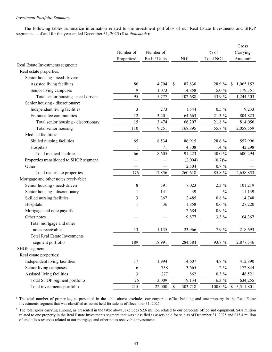 Gross Number of Number of % of Carrying Properties1 Beds / Units NOI Total NOI Amount2 Real Estate Investments segment: Real estate properties: Senior housing - need-driven: Assisted living facilities 86 4,704 $ 87,830 28.9 % $ 1,065,152 Senior living campuses 9 1,073 14,858 5.0 % 179,351 Total senior housing - need-driven 95 5,777 102,688 33.9 % 1,244,503 Senior housing - discretionary: Independent living facilities 3 273 1,544 0.5 % 9,233 Entrance fee communities 12 3,201 64,663 21.3 % 804,823 Total senior housing - discretionary 15 3,474 66,207 21.8 % 814,056 Total senior housing 110 9,251 168,895 55.7 % 2,058,559 Medical facilities: Skilled nursing facilities 65 8,534 86,915 28.6 % 557,996 Hospitals 1 71 4,308 1.4 % 42,298 Total medical facilities 66 8,605 91,223 30.0 % 600,294 Properties transitioned to SHOP segment — — (2,004) (0.7) % — Other — — 2,504 0.8 % — Total real estate properties 176 17,856 260,618 85.8 % 2,658,853 Mortgage and other notes receivable: Senior housing - need-driven 8 591 7,023 2.3 % 101,219 Senior housing - discretionary 1 141 39 — % 11,139 Skilled nursing facilities 3 367 2,485 0.8 % 14,748 Hospitals 1 36 1,858 0.6 % 27,220 Mortgage and note payoffs — — 2,684 0.9 % — Other notes — — 9,877 3.3 % 64,367 Total mortgage and other notes receivable 13 1,135 23,966 7.9 % 218,693 Total Real Estate Investments segment portfolio 189 18,991 284,584 93.7 % 2,877,546 SHOP segment: Real estate properties: Independent living facilities 17 1,994 14,607 4.8 % 412,890 Senior living campuses 6 738 3,665 1.2 % 172,844 Assisted living facilities 3 277 862 0.3 % 48,521 Total SHOP segment portfolio 26 3,009 19,134 6.3 % 634,255 Total investments portfolio 215 22,000 $ 303,718 100.0 % $ 3,511,801 1 The total number of properties, as presented in the table above, excludes our corporate office building and one property in the Real Estate Investments segment that was classified as assets held for sale as of December 31, 2025. 2 The total gross carrying amount, as presented in the table above, excludes $2.6 million related to our corporate office and equipment, $4.8 million related to one property in the Real Estate Investments segment that was classified as assets held for sale as of December 31, 2025 and $15.4 million of credit loss reserves related to our mortgage and other notes receivable investments. Investment Portfolio Summary The following tables summarize information related to the investment portfolios of our Real Estate Investments and SHOP segments as of and for the year ended December 31, 2025 ($ in thousands): 43