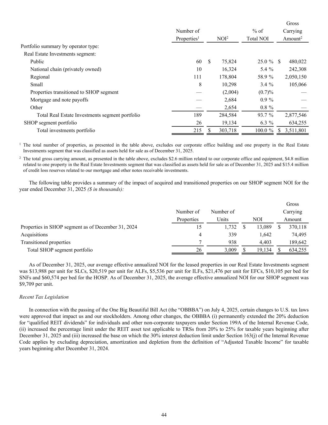 Gross Number of % of Carrying Properties1 NOI2 Total NOI Amount2 Portfolio summary by operator type: Real Estate Investments segment: Public 60 $ 75,824 25.0 % $ 480,022 National chain (privately owned) 10 16,324 5.4 % 242,308 Regional 111 178,804 58.9 % 2,050,150 Small 8 10,298 3.4 % 105,066 Properties transitioned to SHOP segment — (2,004) (0.7) % — Mortgage and note payoffs — 2,684 0.9 % — Other — 2,654 0.8 % — Total Real Estate Investments segment portfolio 189 284,584 93.7 % 2,877,546 SHOP segment portfolio 26 19,134 6.3 % 634,255 Total investments portfolio 215 $ 303,718 100.0 % $ 3,511,801 1 The total number of properties, as presented in the table above, excludes our corporate office building and one property in the Real Estate Investments segment that was classified as assets held for sale as of December 31, 2025. 2 The total gross carrying amount, as presented in the table above, excludes $2.6 million related to our corporate office and equipment, $4.8 million related to one property in the Real Estate Investments segment that was classified as assets held for sale as of December 31, 2025 and $15.4 million of credit loss reserves related to our mortgage and other notes receivable investments. The following table provides a summary of the impact of acquired and transitioned properties on our SHOP segment NOI for the year ended December 31, 2025 ($ in thousands): Gross Number of Number of Carrying Properties Units NOI Amount Properties in SHOP segment as of December 31, 2024 15 1,732 $ 13,089 $ 370,118 Acquisitions 4 339 1,642 74,495 Transitioned properties 7 938 4,403 189,642 Total SHOP segment portfolio 26 3,009 $ 19,134 $ 634,255 As of December 31, 2025, our average effective annualized NOI for the leased properties in our Real Estate Investments segment was $13,988 per unit for SLCs, $20,519 per unit for ALFs, $5,536 per unit for ILFs, $21,476 per unit for EFCs, $10,105 per bed for SNFs and $60,574 per bed for the HOSP. As of December 31, 2025, the average effective annualized NOI for our SHOP segment was $9,709 per unit. Recent Tax Legislation In connection with the passing of the One Big Beautiful Bill Act (the “OBBBA”) on July 4, 2025, certain changes to U.S. tax laws were approved that impact us and our stockholders. Among other changes, the OBBBA (i) permanently extended the 20% deduction for “qualified REIT dividends” for individuals and other non-corporate taxpayers under Section 199A of the Internal Revenue Code, (ii) increased the percentage limit under the REIT asset test applicable to TRSs from 20% to 25% for taxable years beginning after December 31, 2025 and (iii) increased the base on which the 30% interest deduction limit under Section 163(j) of the Internal Revenue Code applies by excluding depreciation, amortization and depletion from the definition of “Adjusted Taxable Income” for taxable years beginning after December 31, 2024. 44